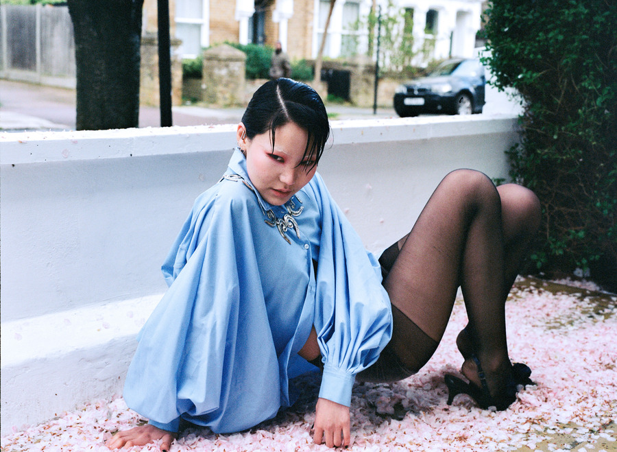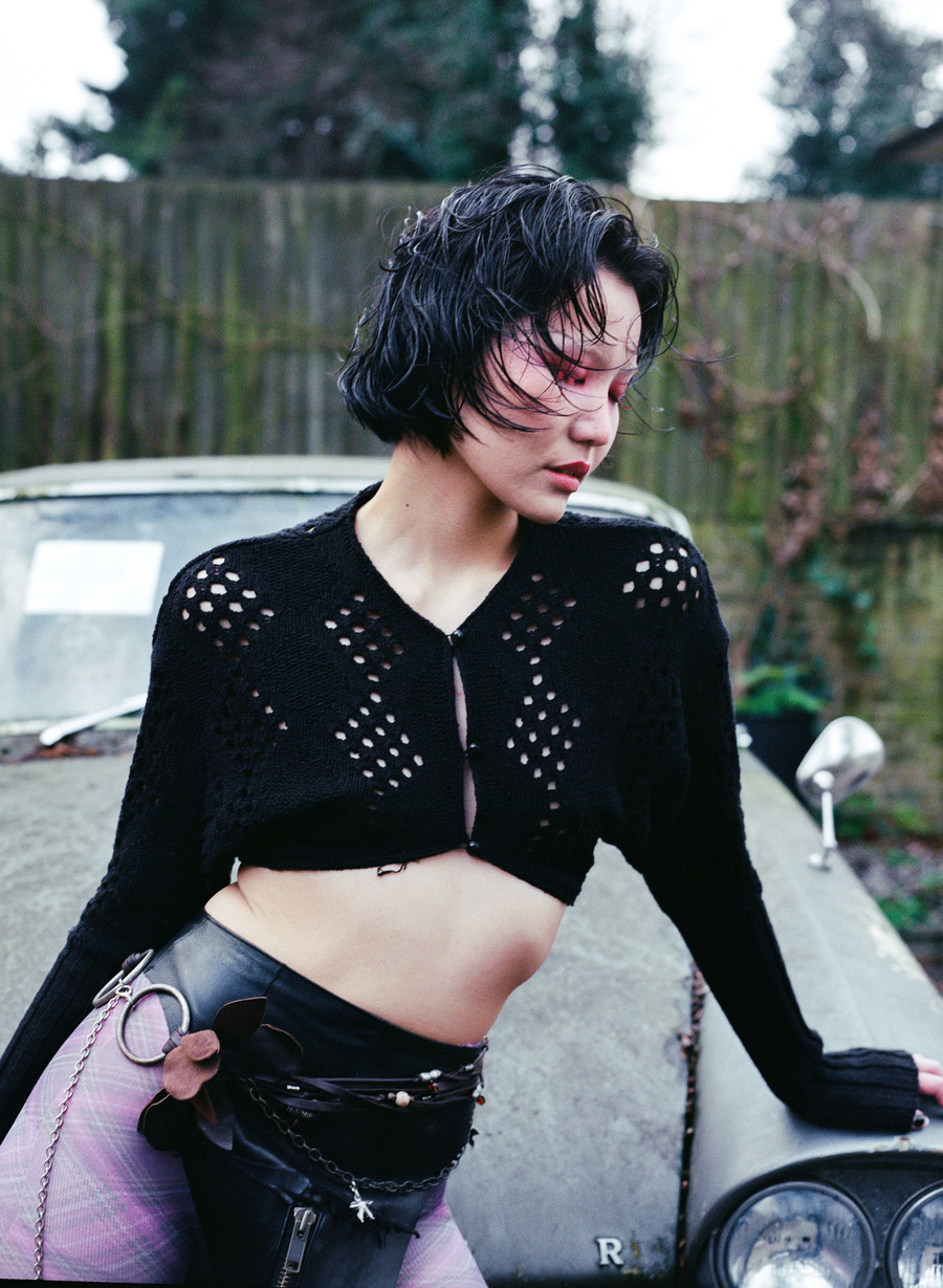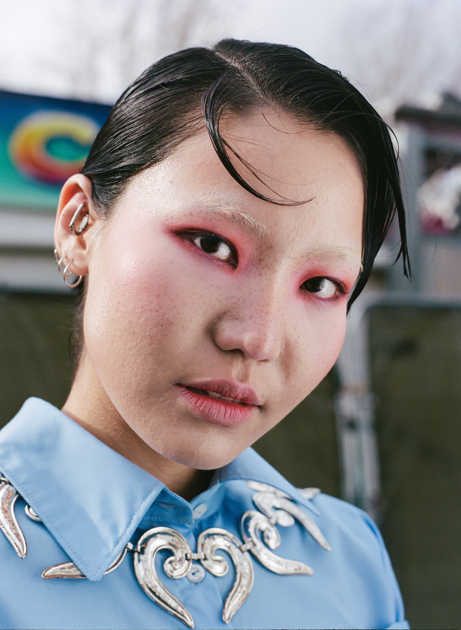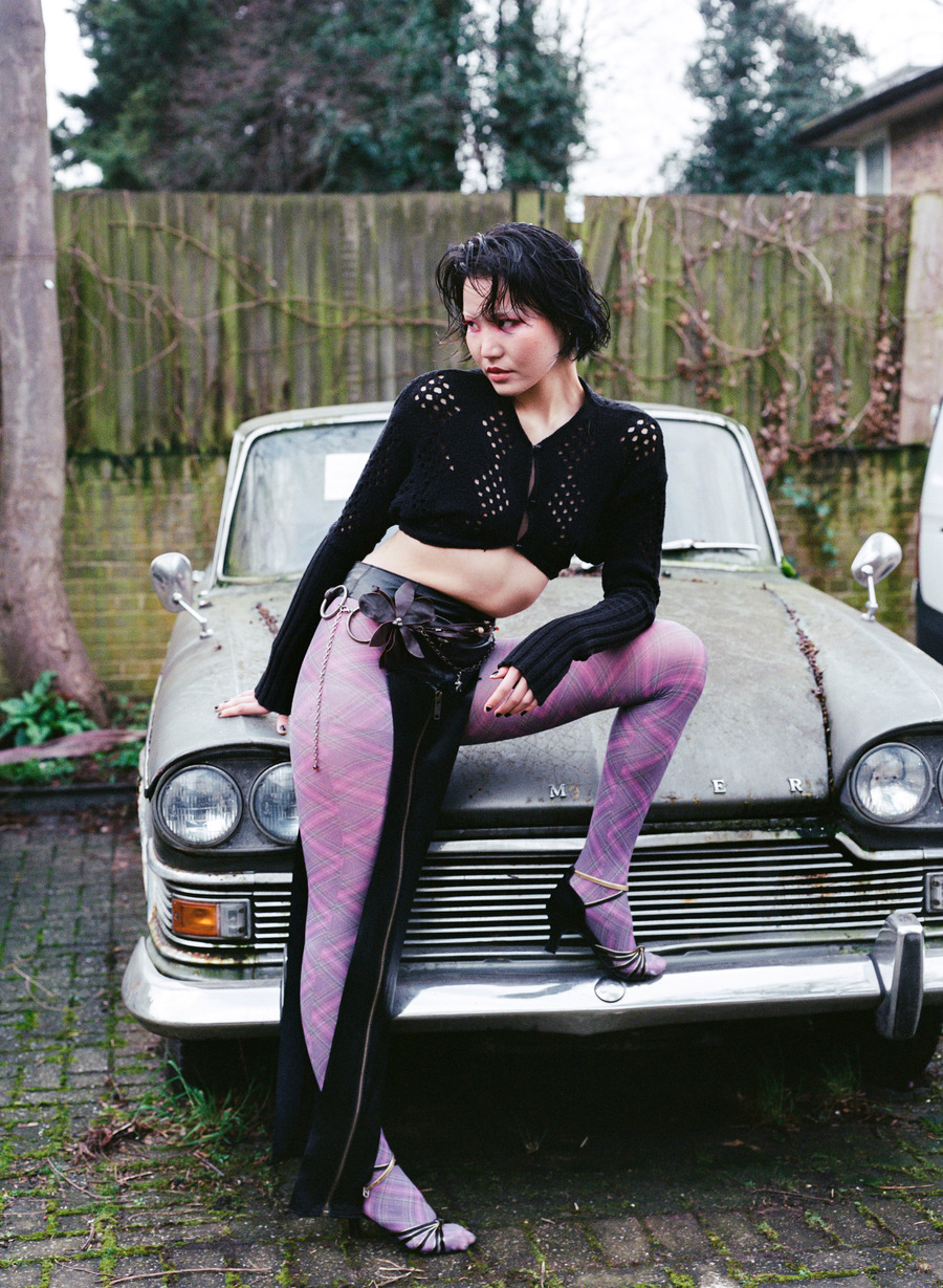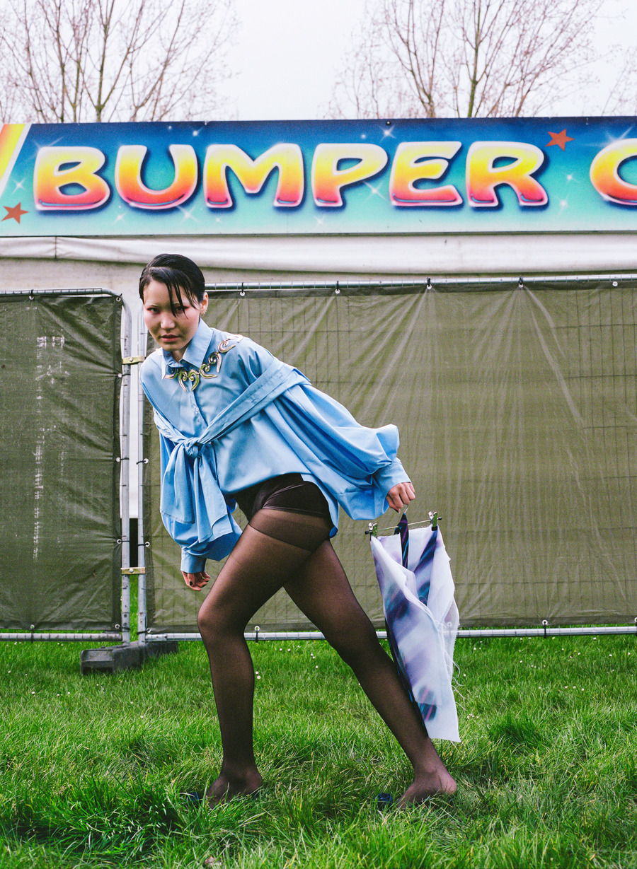 A KALTBLUT exclusive editorial. Photography by Alex Radota. The model is Anu Tumenjargal. Styling by In Yoon. Makeup by Roo Gehring. Hair by Rati. This story draws inspiration from the vibrant streets of North London, capturing the essence of urban life on film. Contemporary fashion and nostalgic charm fusion take centre stage against iconic backdrops such as a local funfair, vintage cars, and fallen cherry blossoms. Each shot encapsulates the city’s spirit, celebrating its dynamic energy and timeless allure.