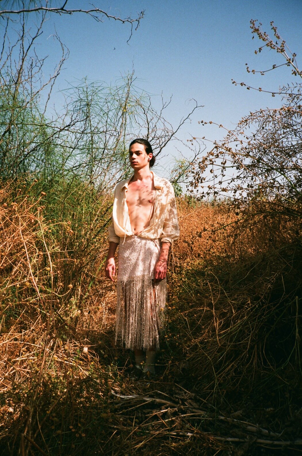 A KALTBLUT exclusive. CLOSE ENCOUNTERS is a collaboration with fashion photographer Tom Marshak and stylist, designer Ben Zeiger. The story takes place in a post apocalyptic scene, a meeting point between past and future colliding in a nostalgic Sci-Fi movie atmosphere. Featuring model Ron tsaban as the main character the animal and the alien both in one. Model is Ron Tsaban. Fashion by Tamar Netanely, Maya Geller, Jacquemus, Garcons Infideles, Alexander Wang, Yves Saint Lauren.