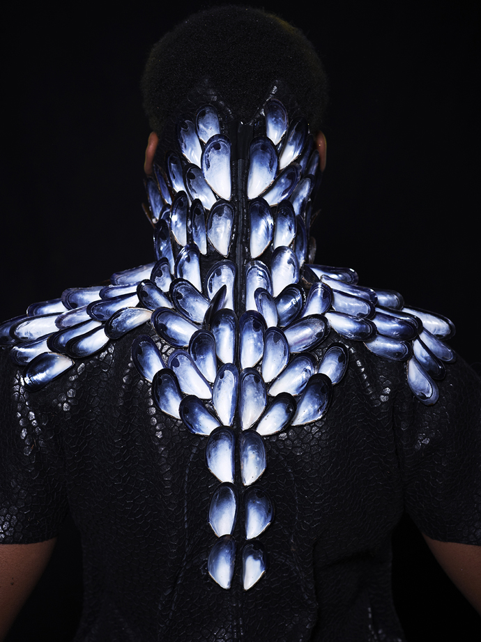 Reptile skins are transformed with jacquards adopt weirdly beautiful optical effects, enhanced by shimmer and dimension. The collection is a breed between human and the ocean world, takes us to a dream world under the sea, where all so pretty all so still. It moves then to the colossus poem where we are questioned if that’s all what we want out of life or if there’s something more to offer. A call to break a rule or take a chance of what we are afraid of but what’s life but a big chance after all.” – Hazem Ali