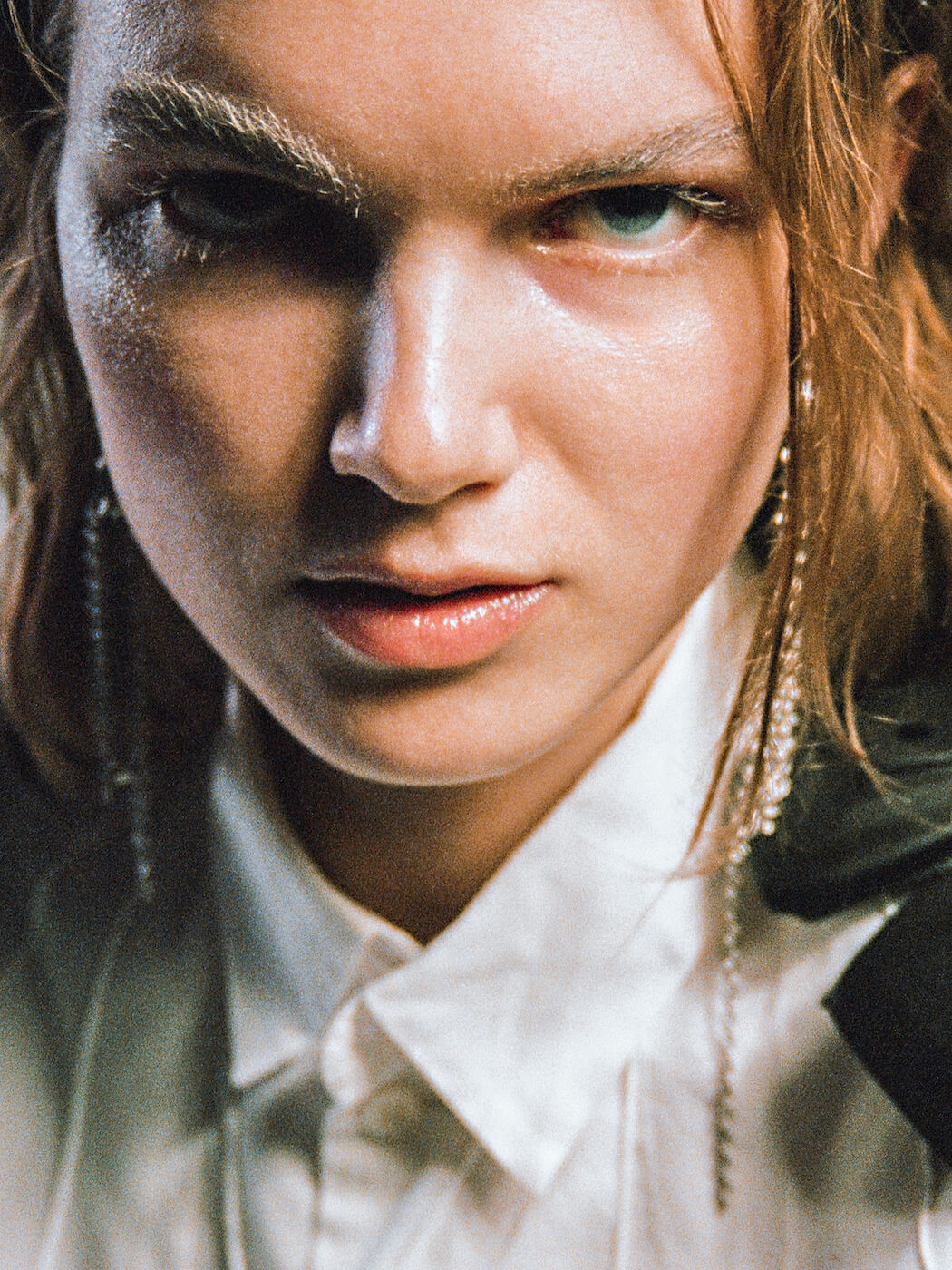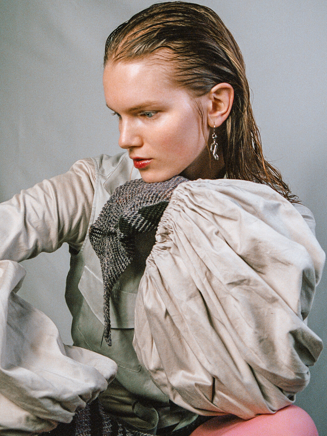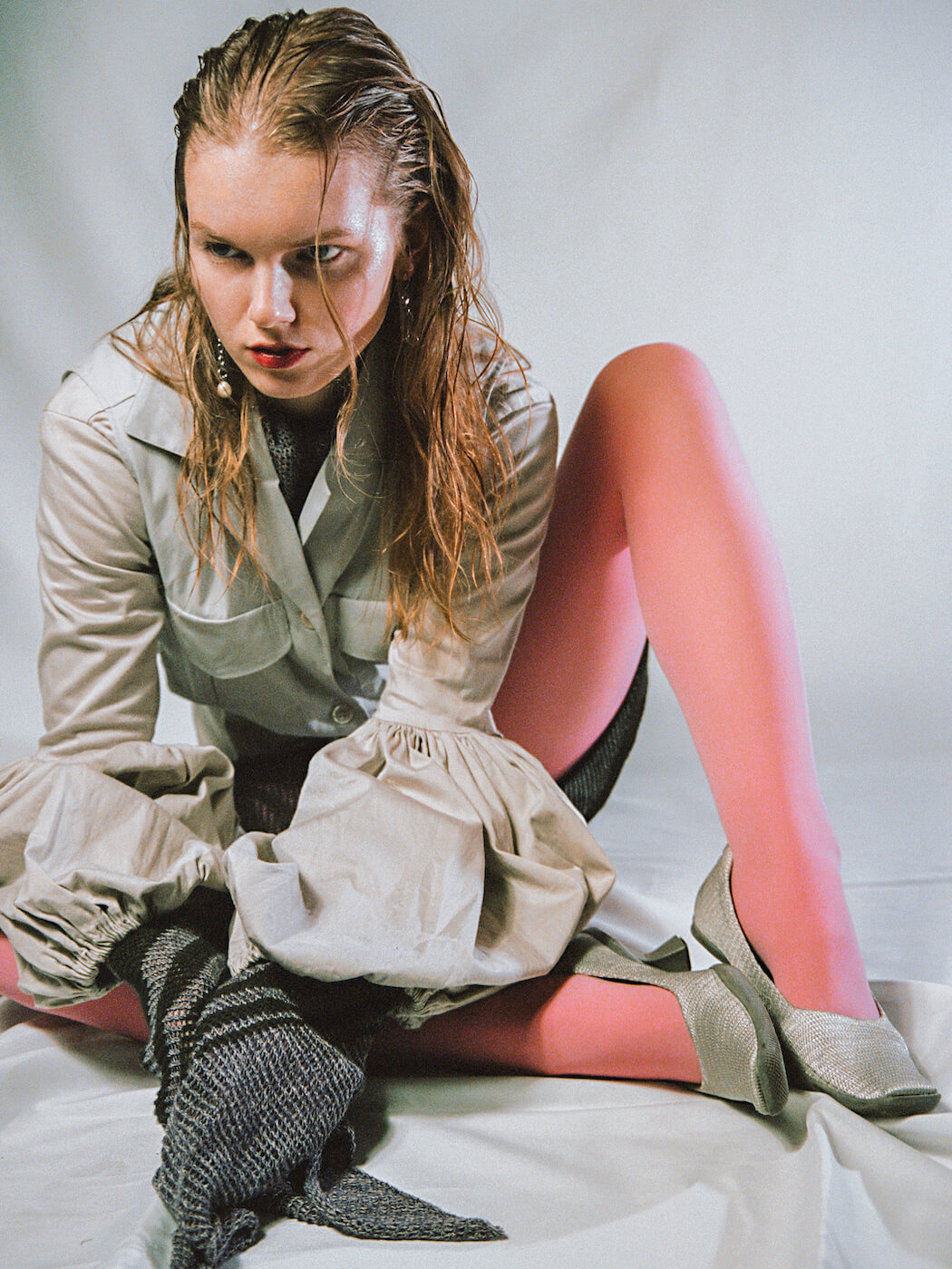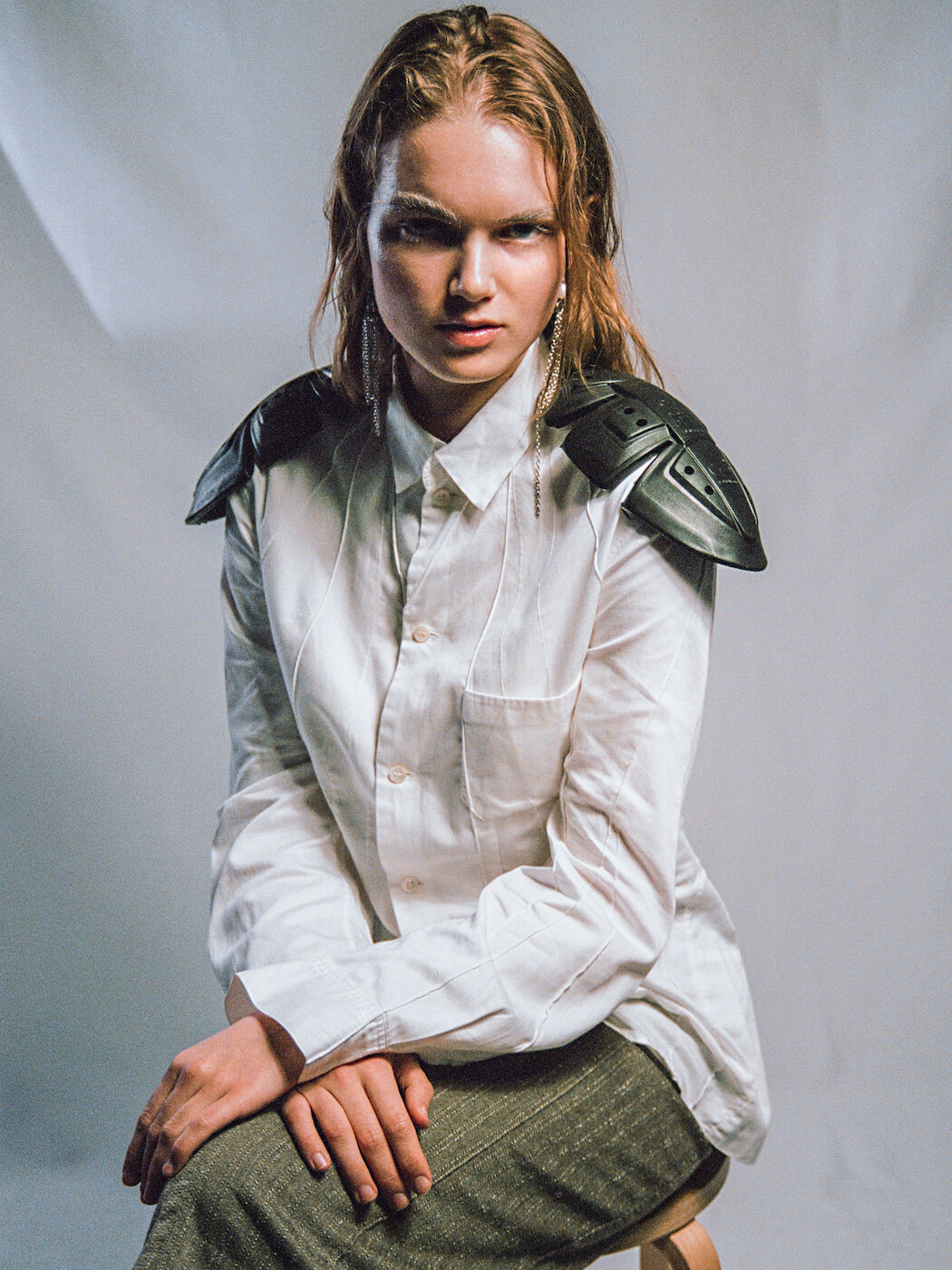 A KALTBLUT exclusive editorial. Photography by Haakon Korbi. Model is Darya Rosenfeld signed at Pearl Management Berlin. Make-up by Smilla Marcussen. Styling by Skylar Kang. Brands are Readymade, Prada, Vivienne Westwood, Hysteria, Jil Sander, Yohji Yamamoto, GmbH, Kenzo, Jean Paul Gaultier, Helmut Lang. Chair: Peter Maly from Objects Mistaken Berlin.