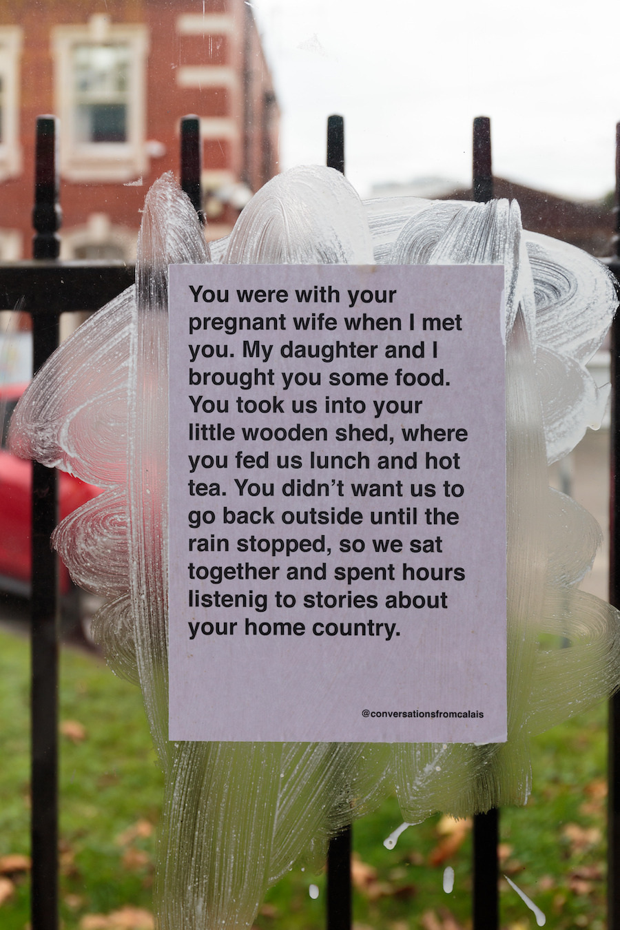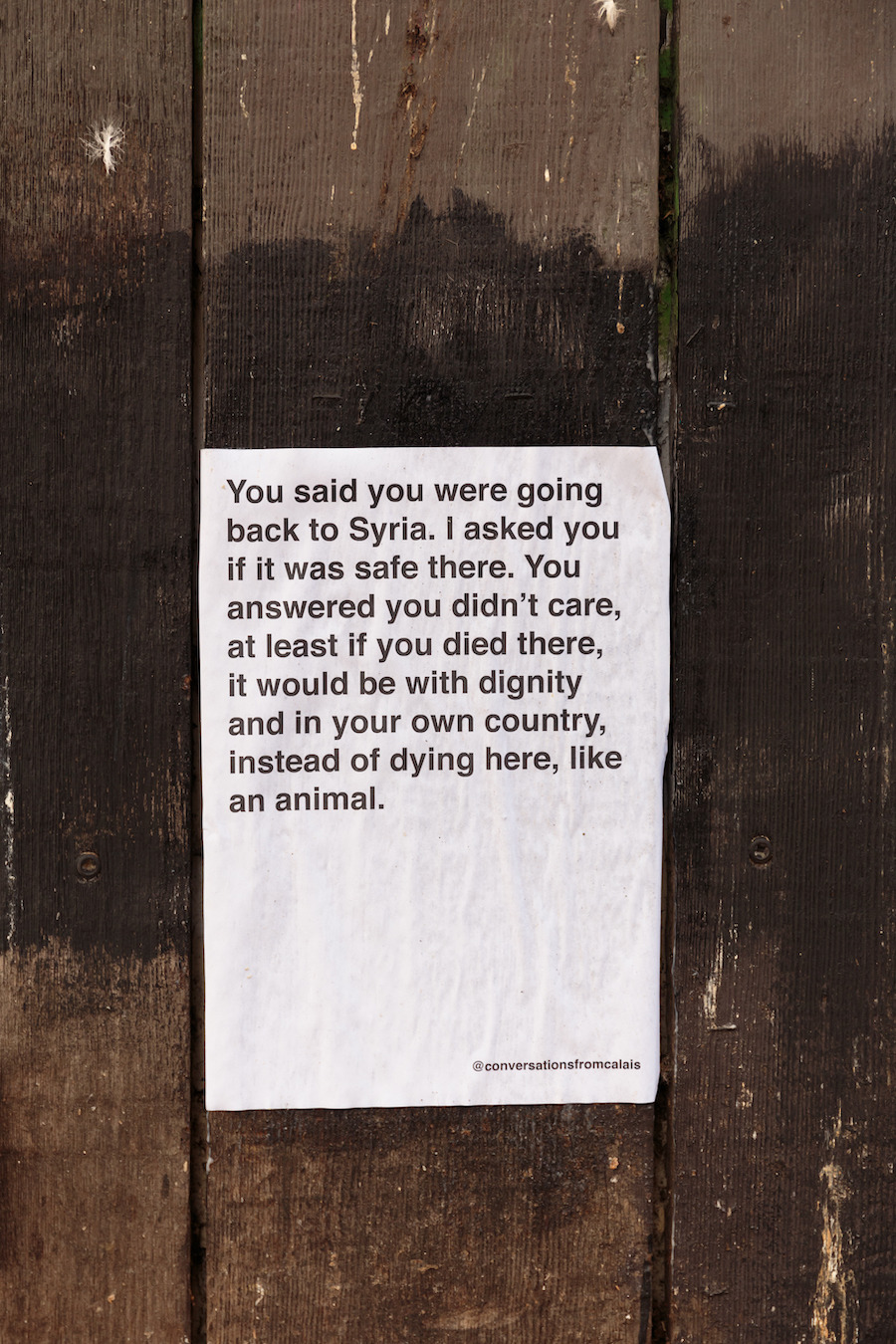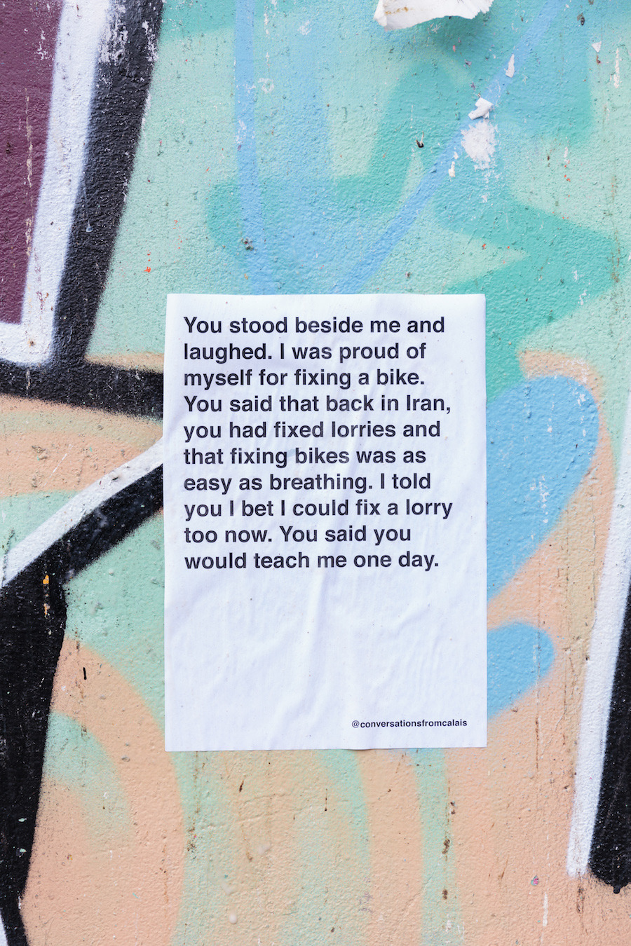 I ended up writing down the stories as I had collected them in my sketchbook I’d kept when I was in Calais. I was simply sharing what I’d heard from my perspective, as a volunteer. I wanted to get those stories out as quickly and cheaply as possible, so printing them and pasting them up on walls around London was the easiest way.