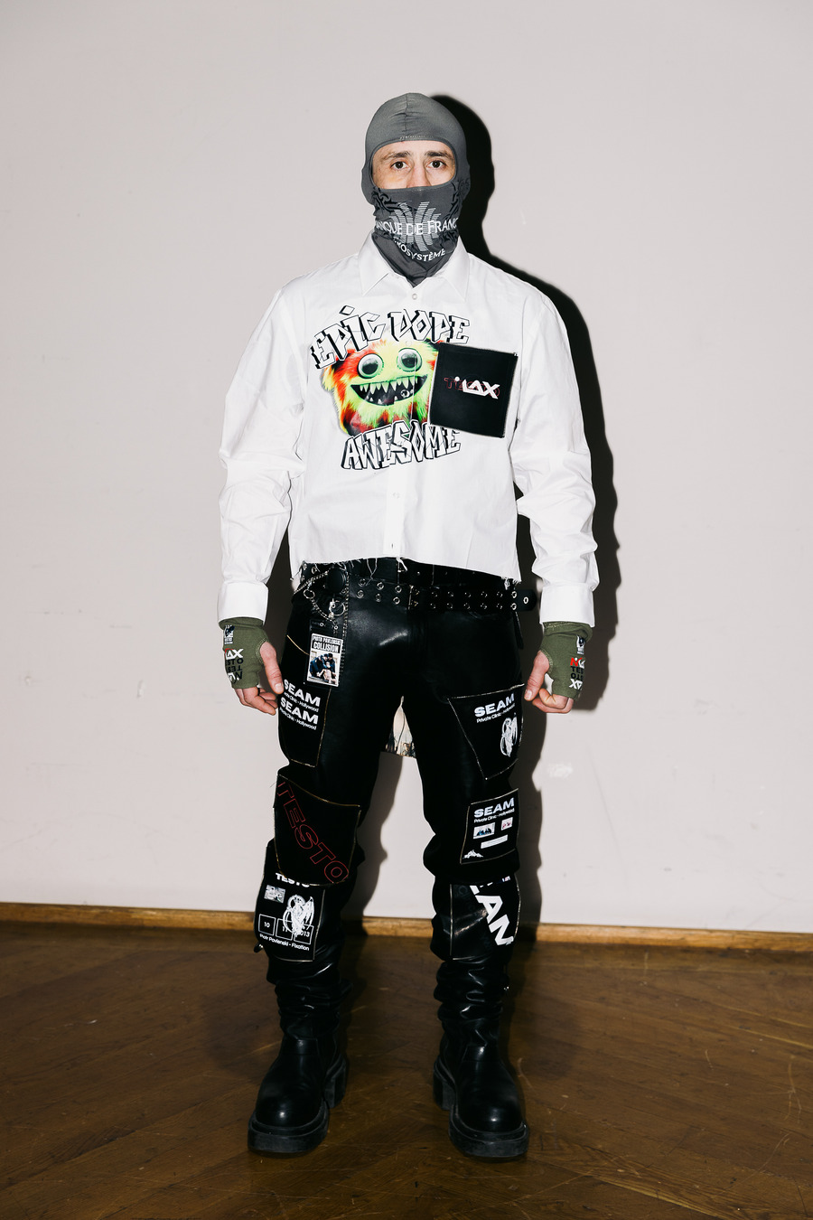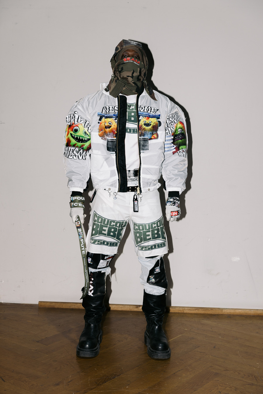 The TESTOSTERONE collection introduced a bold lexicon of innovative silhouettes, featuring signature bombers and exquisitely crafted leather pieces that exude an edgy yet avant-garde spirit. Accessories—belts ornamented with the brand’s hallmark “charms” and playful key chains—enhanced the collection’s undeniable flair. This presentation exemplifies Coucou Bebe’s unwavering commitment to juxtaposing raw power with a minimalist aesthetic, creating a paradox of stark simplicity fused with a provocative, hallucinatory edge.