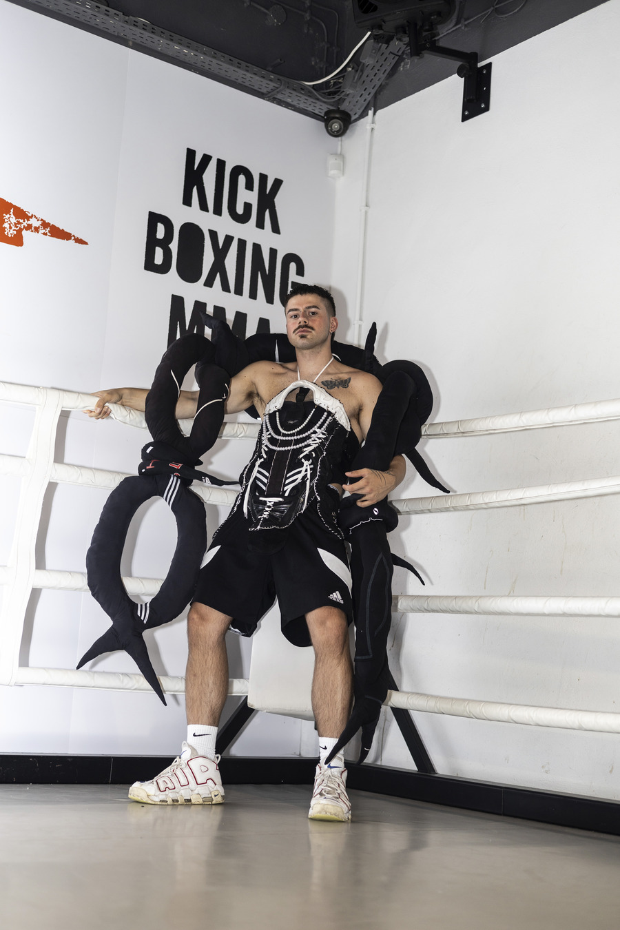 The designs showcased in the photos come from Filip Kozak’s 2023 Master’s Collection “Crush,” a bold statement against the discrimination faced by sexual minorities in Poland. Filip’s work confronts dehumanization through distortion, with garments like a custom-made corset crafted from shoes, protective gear, and sportswear—referencing toxic masculinity and its cultural implications. The collection and the photoshoot aim to provoke, inspire, and challenge the viewer, emphasizing the urgent need for empathy and change.”