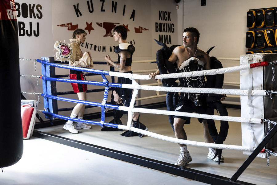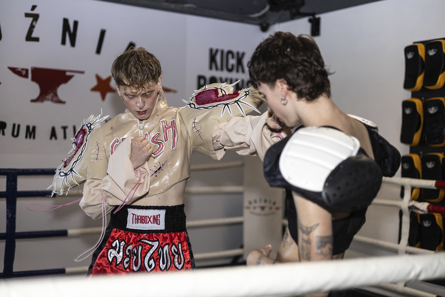 The designs showcased in the photos come from Filip Kozak’s 2023 Master’s Collection “Crush,” a bold statement against the discrimination faced by sexual minorities in Poland. Filip’s work confronts dehumanization through distortion, with garments like a custom-made corset crafted from shoes, protective gear, and sportswear—referencing toxic masculinity and its cultural implications. The collection and the photoshoot aim to provoke, inspire, and challenge the viewer, emphasizing the urgent need for empathy and change.”