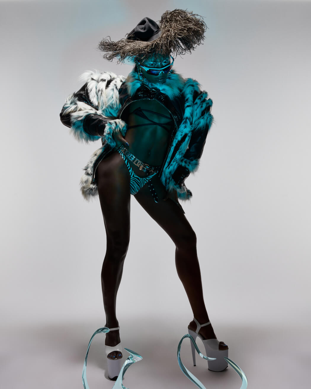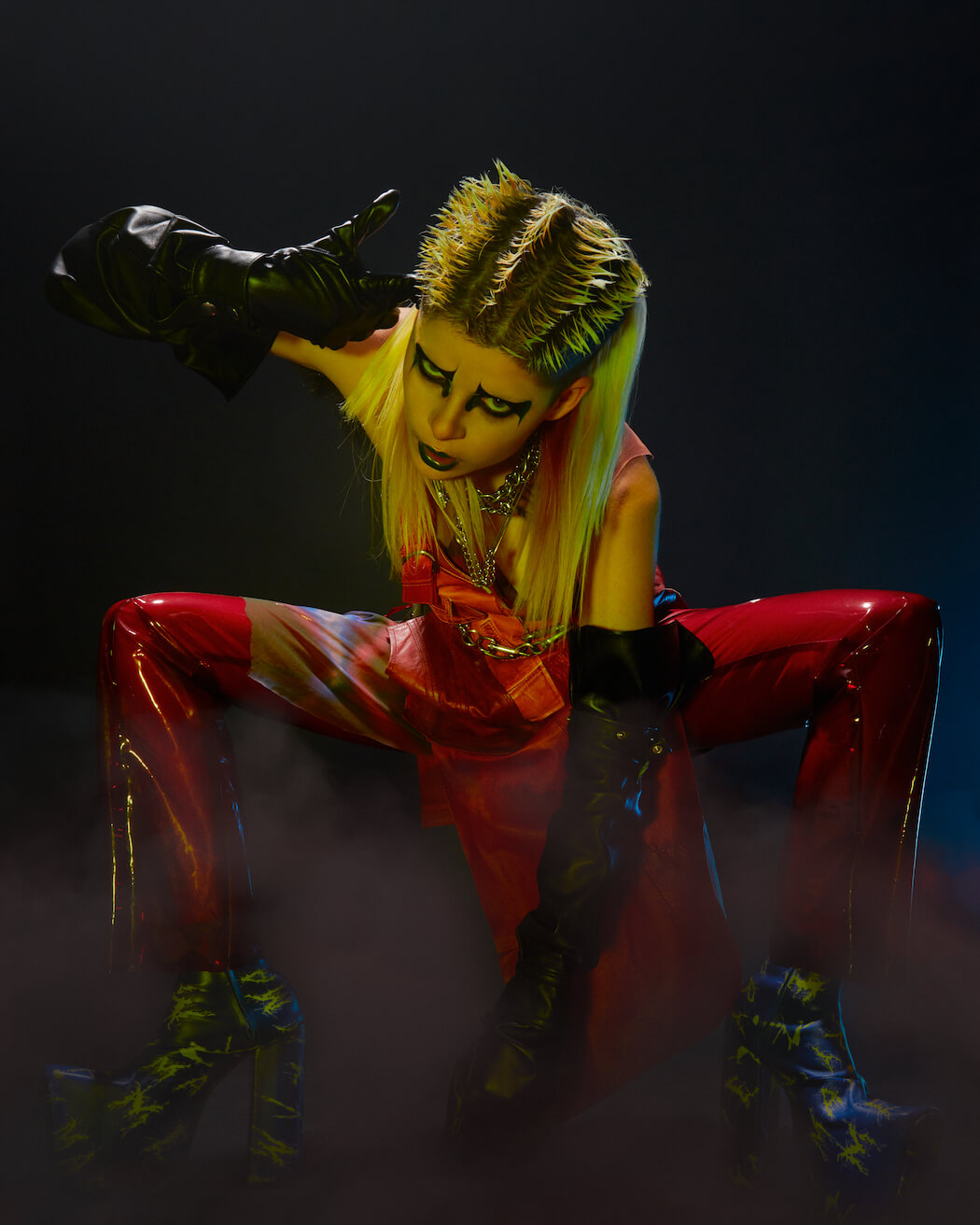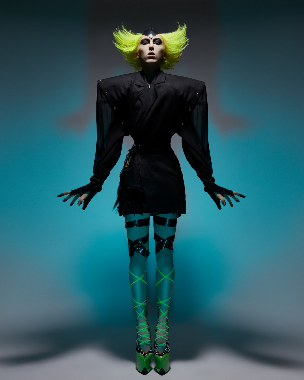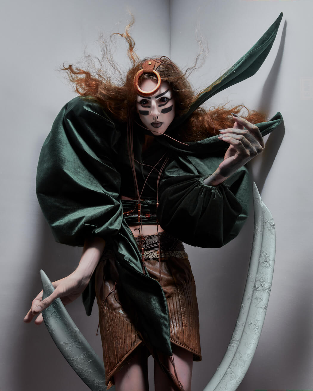 Velvet Top by Ilaria Lepore, Belts by ArtSchool London, Shoes by Natacha Marro, Leather Skirt and Headpiece by Morgan Johnson