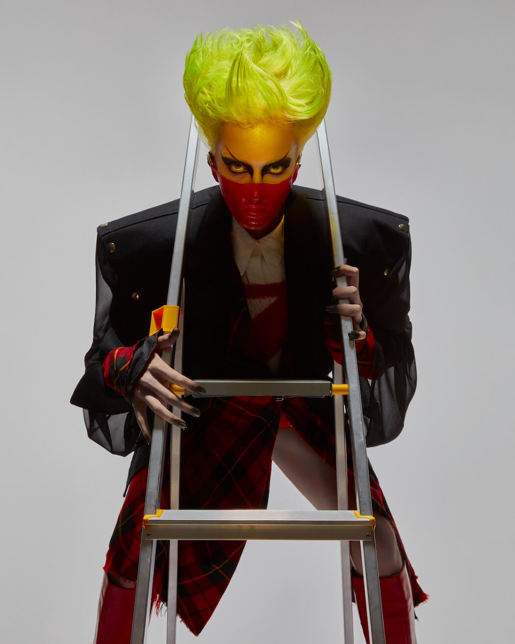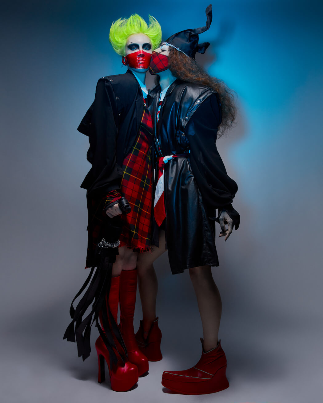 Red Leather Facemask & Tartan Dress by Ingrid Kraftchenko, Shoes by Natacha Marro and Power Suit Jacket by Ilaria Lepore