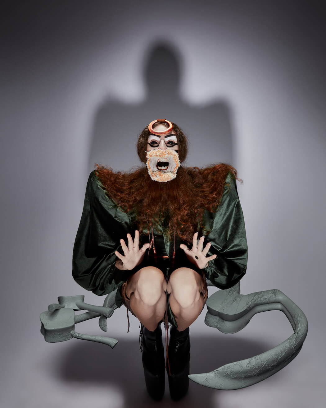 Velvet Top by Ilaria Lepore, Mouthpiece by Wesley Manners, Belts by ArtSchool London, Shoes by Natacha Marro, Leather Skirt and Headpiece by Morgan Johnson
