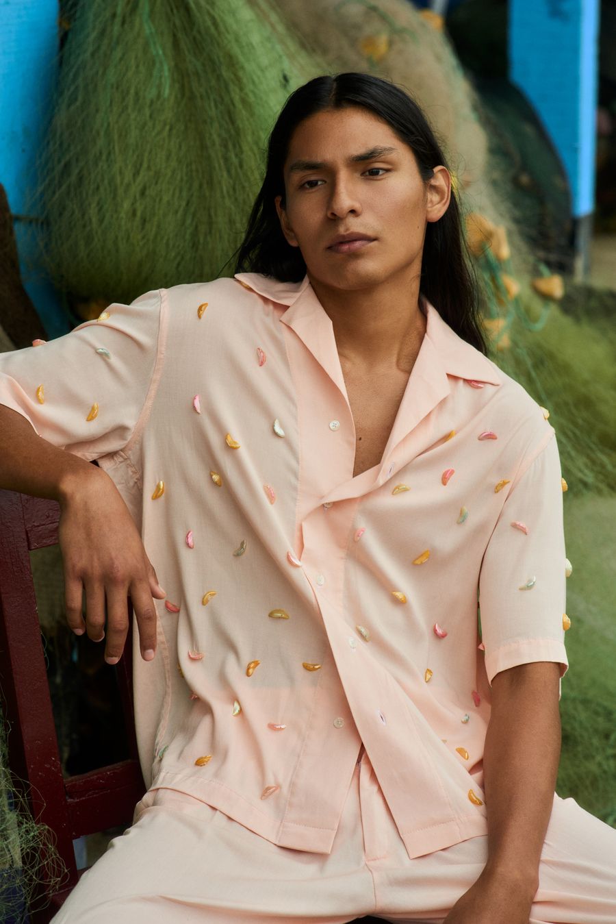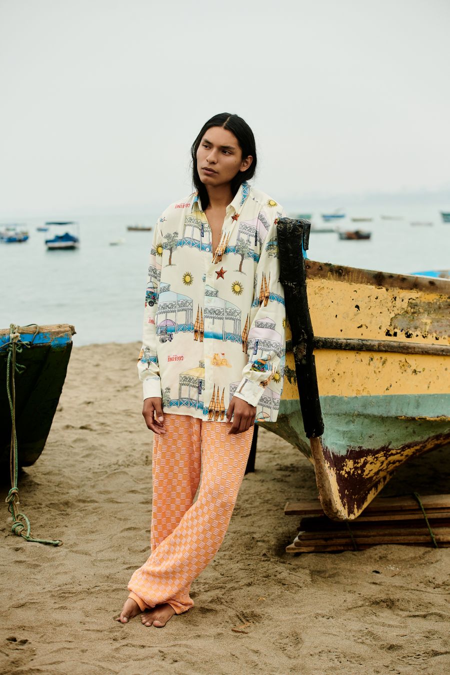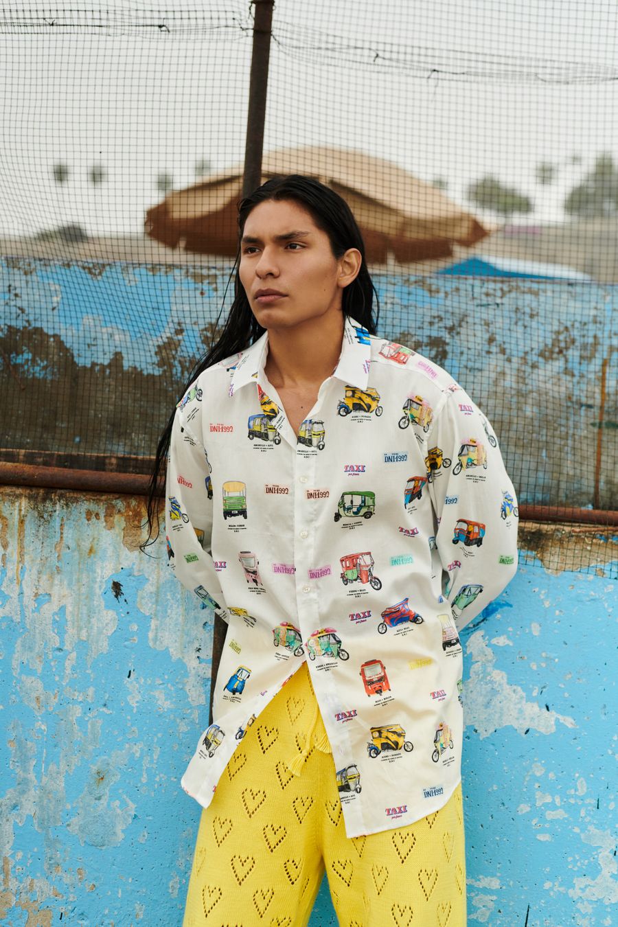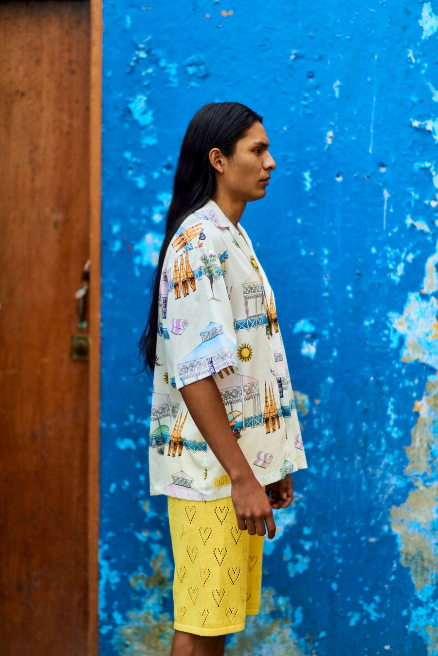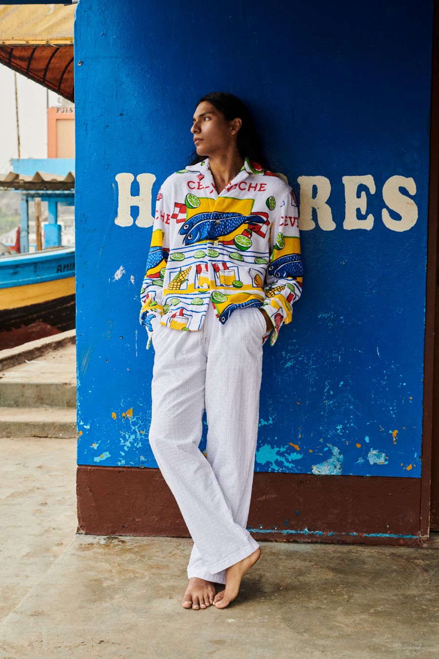 The pieces relate the life on the beach and reinterpret classic summer elements in northern Peru; from moto-taxis, food, the iconic national soda drink and ice cream, to the traditional Caballitos de Totora (reed boats used by fishers in Peru). A collection of shirts, shorts and pants full of vitality, in which D.N.I explore new colours such as light pink, melon and solar yellow, which refer to a landscape full of sand and sunsets. In SS23 «Playa, Ceviche y Picarón» we can also find hand-embroidered applications with sea shells in nacre stone (mother-of-pearl), which are typically used in bracelets by itinerant artisans on the shores of Peruvian beaches in the north of the country.