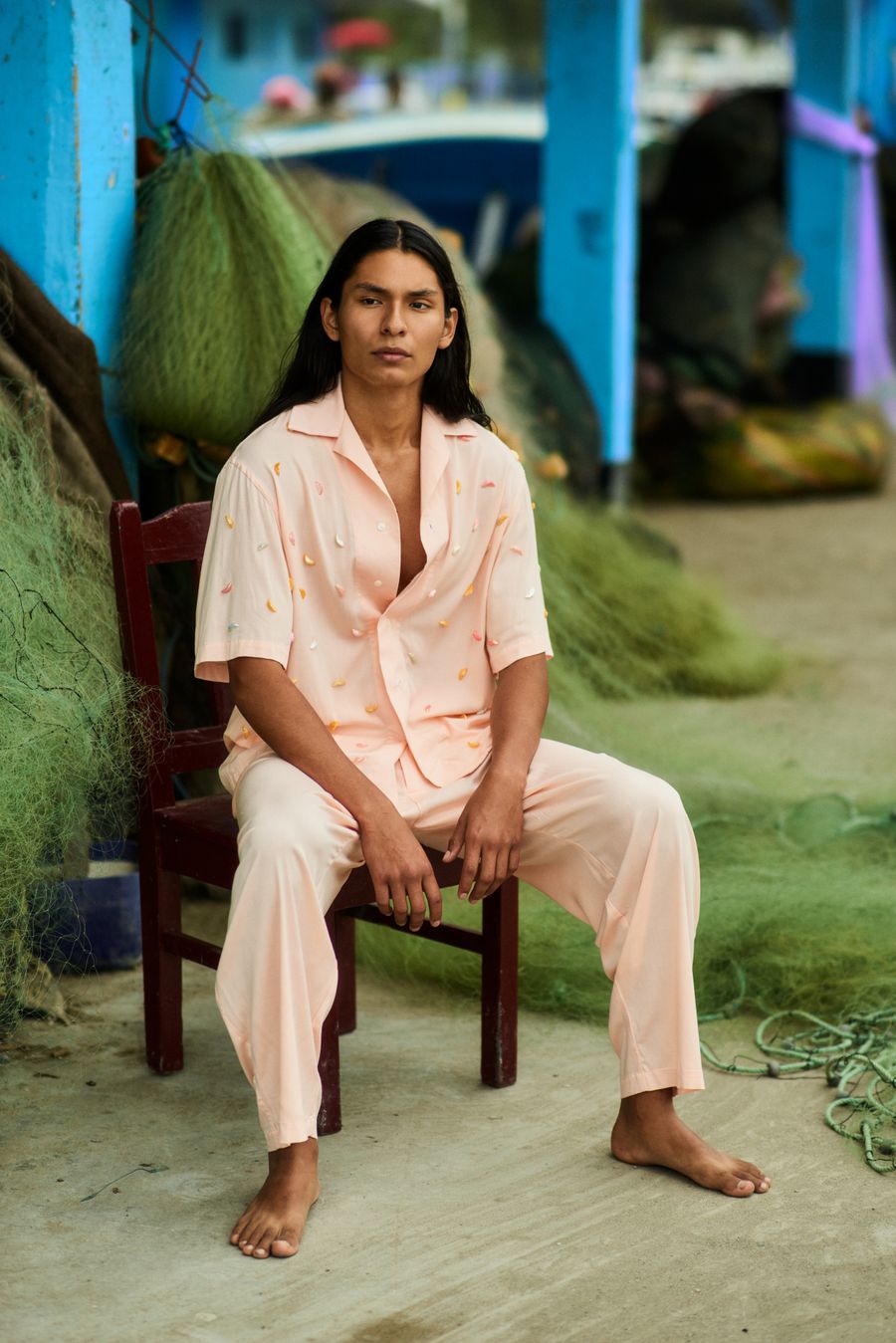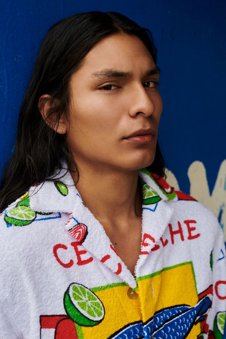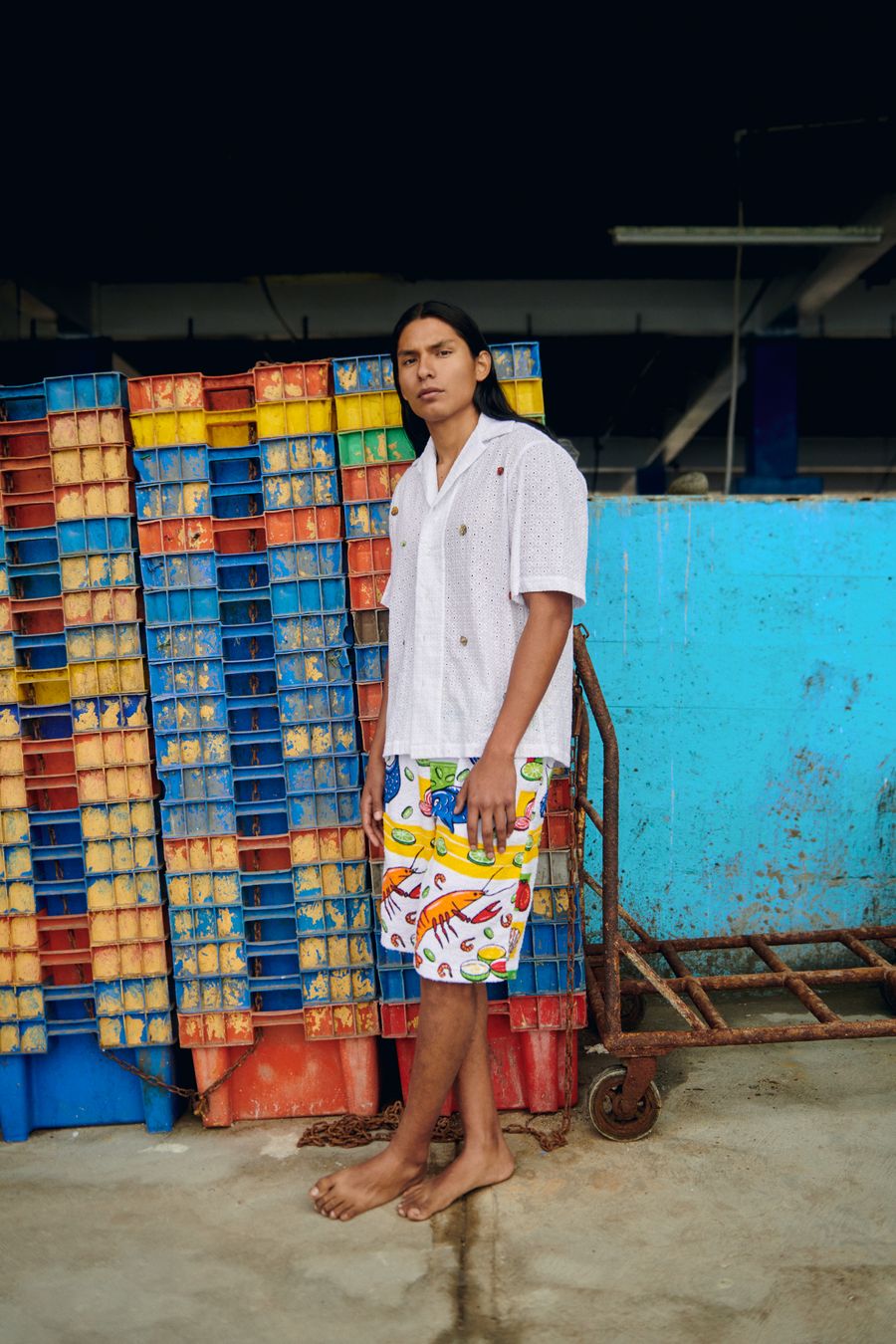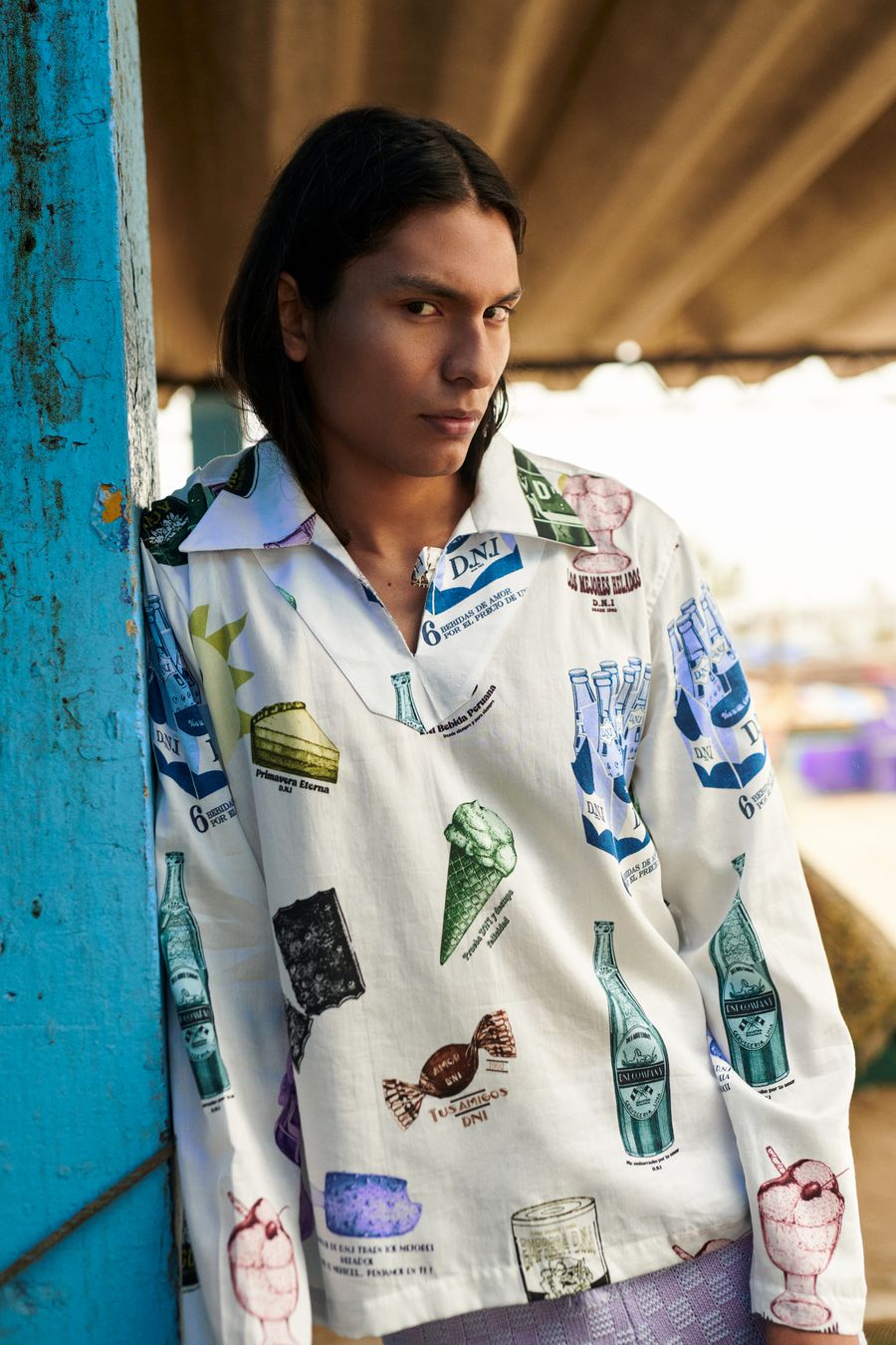 The pieces relate the life on the beach and reinterpret classic summer elements in northern Peru; from moto-taxis, food, the iconic national soda drink and ice cream, to the traditional Caballitos de Totora (reed boats used by fishers in Peru). A collection of shirts, shorts and pants full of vitality, in which D.N.I explore new colours such as light pink, melon and solar yellow, which refer to a landscape full of sand and sunsets. In SS23 «Playa, Ceviche y Picarón» we can also find hand-embroidered applications with sea shells in nacre stone (mother-of-pearl), which are typically used in bracelets by itinerant artisans on the shores of Peruvian beaches in the north of the country.