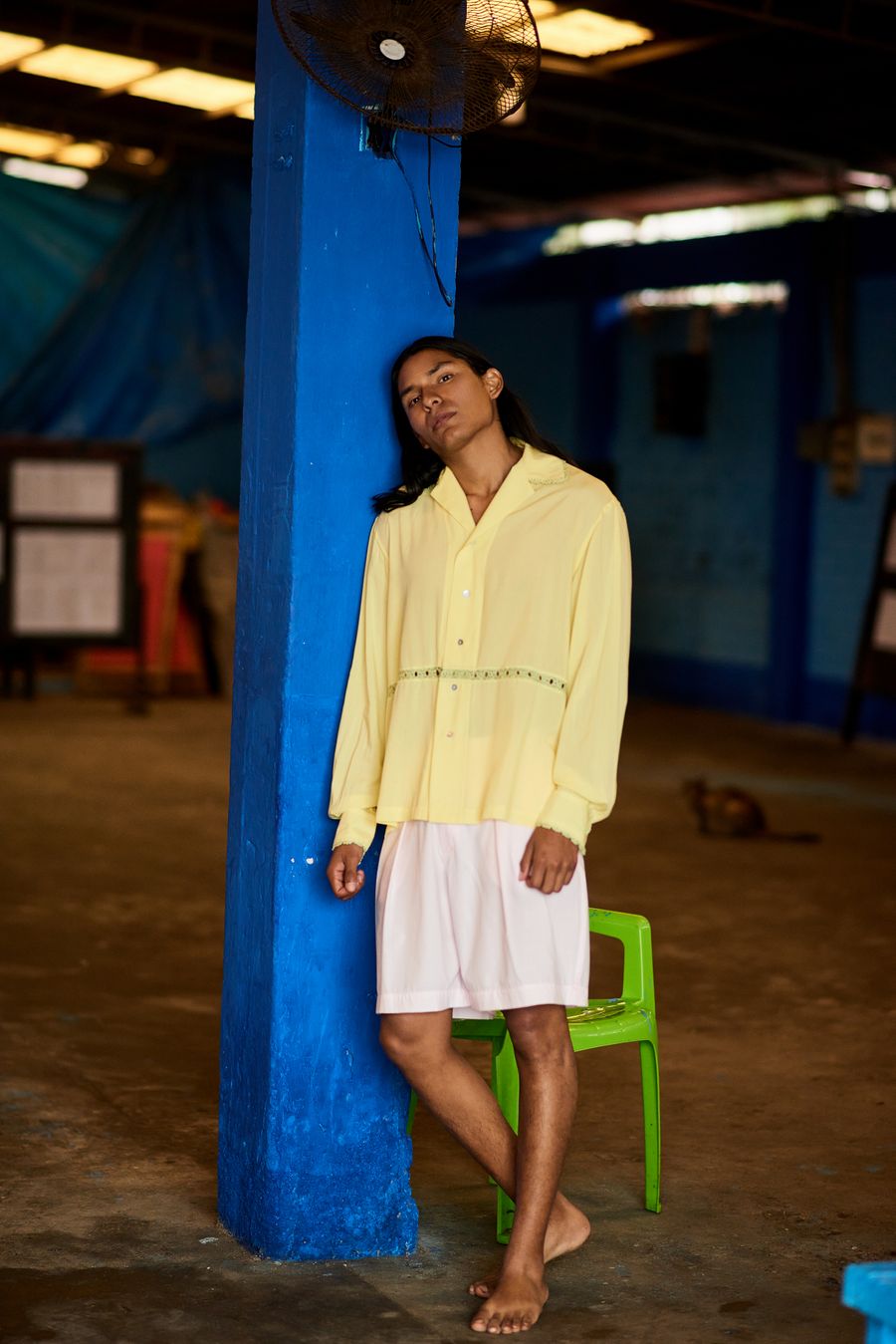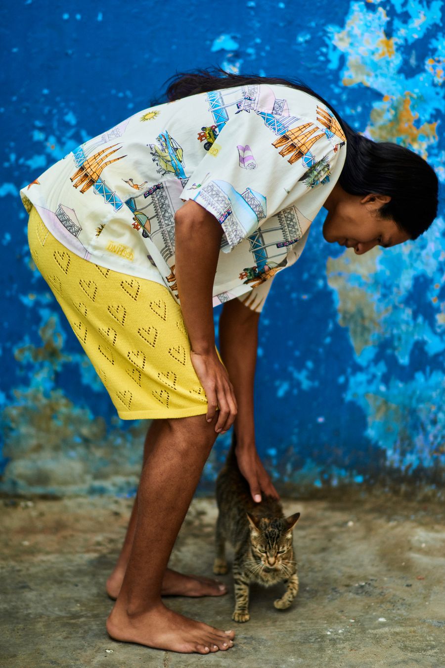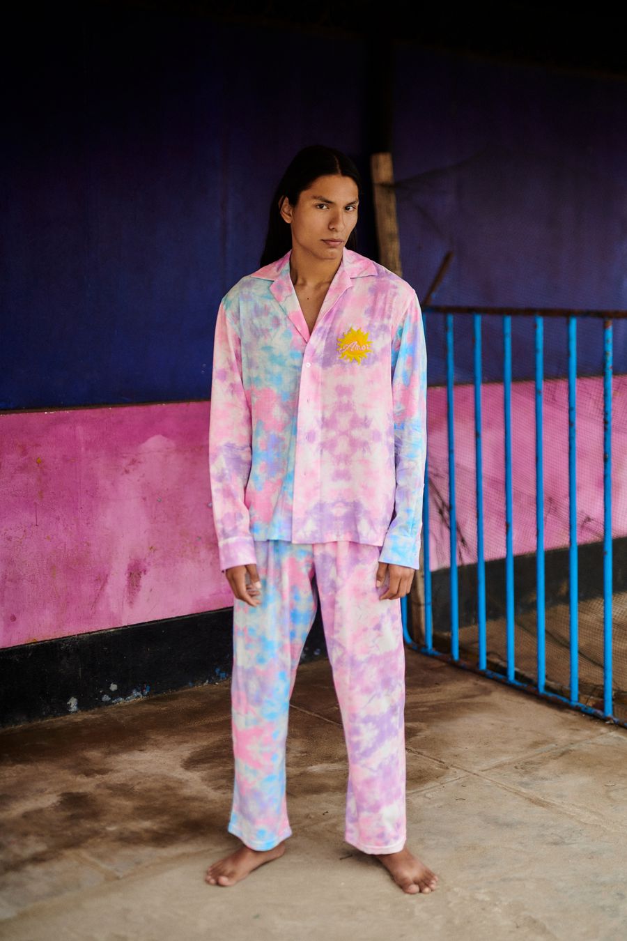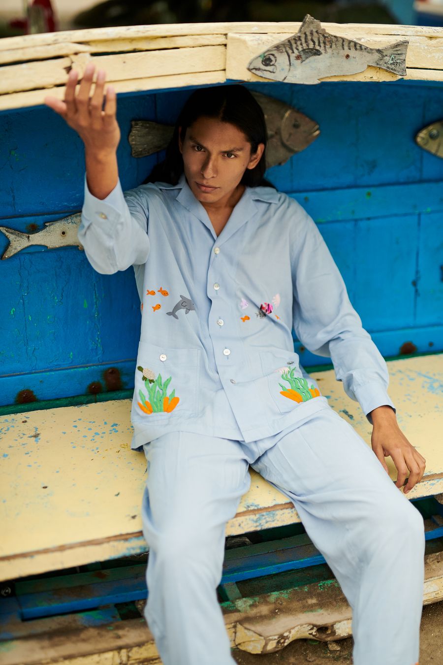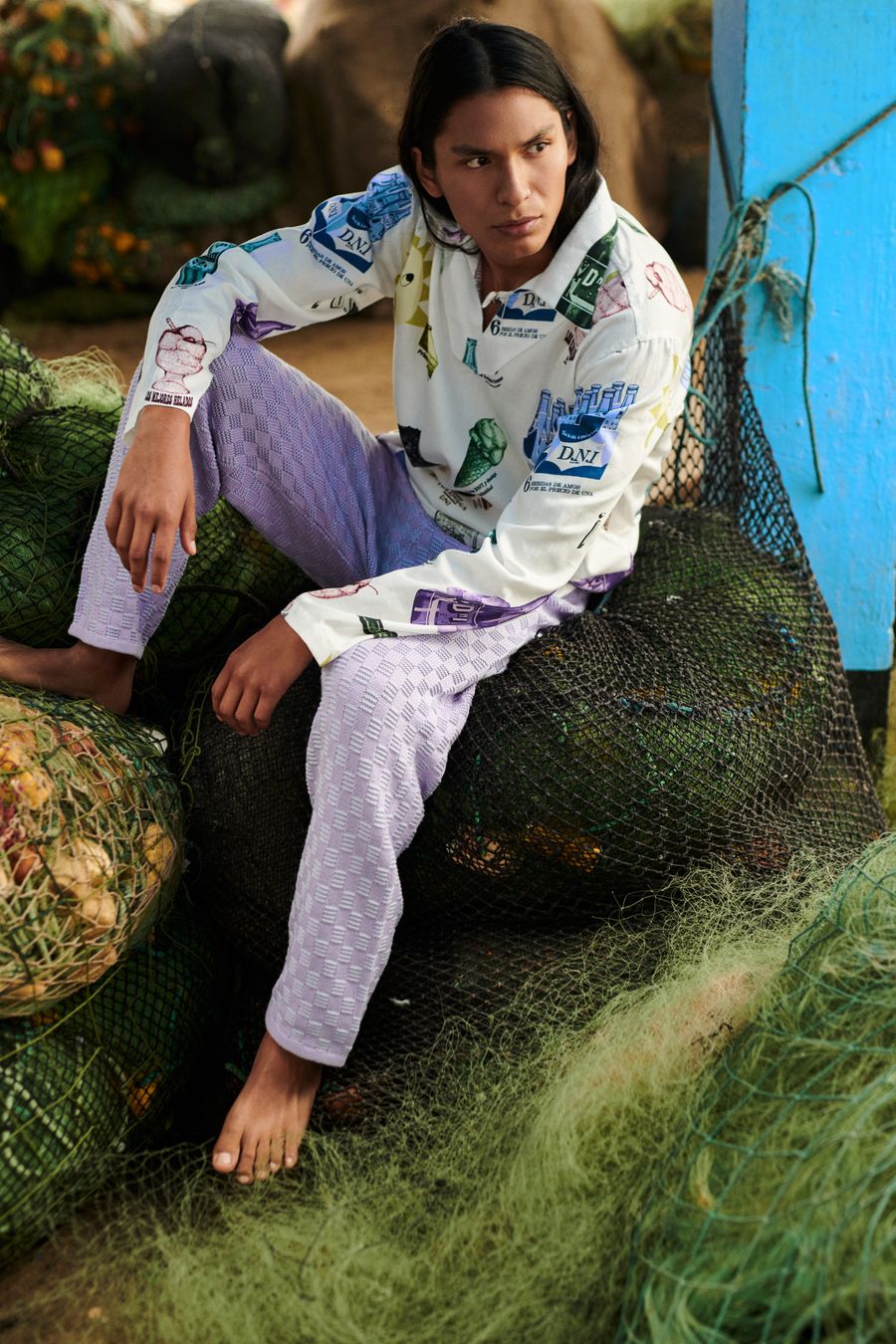 The pieces relate the life on the beach and reinterpret classic summer elements in northern Peru; from moto-taxis, food, the iconic national soda drink and ice cream, to the traditional Caballitos de Totora (reed boats used by fishers in Peru). A collection of shirts, shorts and pants full of vitality, in which D.N.I explore new colours such as light pink, melon and solar yellow, which refer to a landscape full of sand and sunsets. In SS23 «Playa, Ceviche y Picarón» we can also find hand-embroidered applications with sea shells in nacre stone (mother-of-pearl), which are typically used in bracelets by itinerant artisans on the shores of Peruvian beaches in the north of the country.