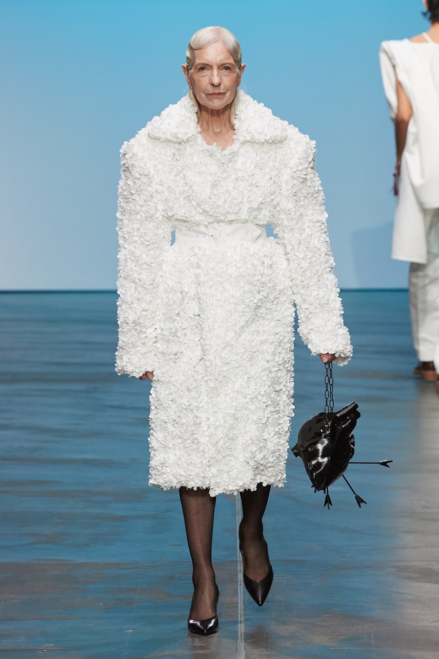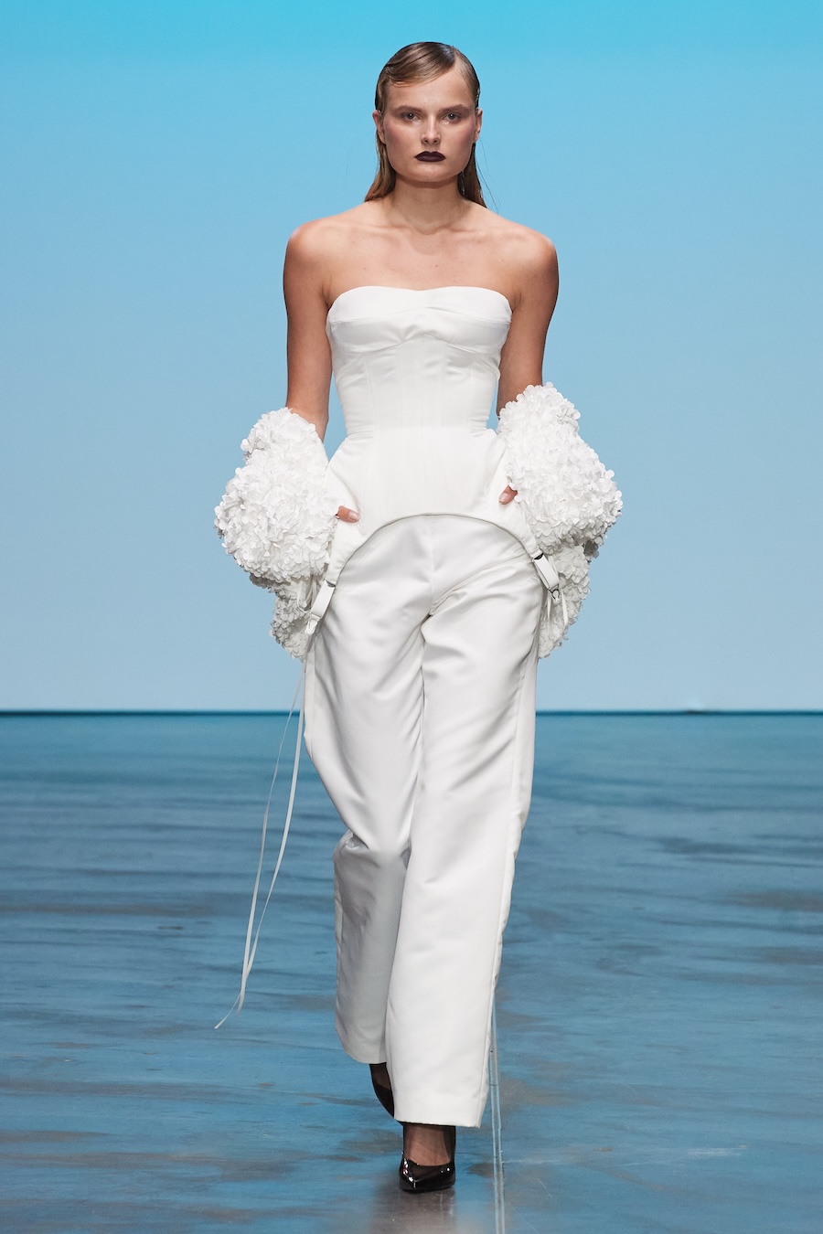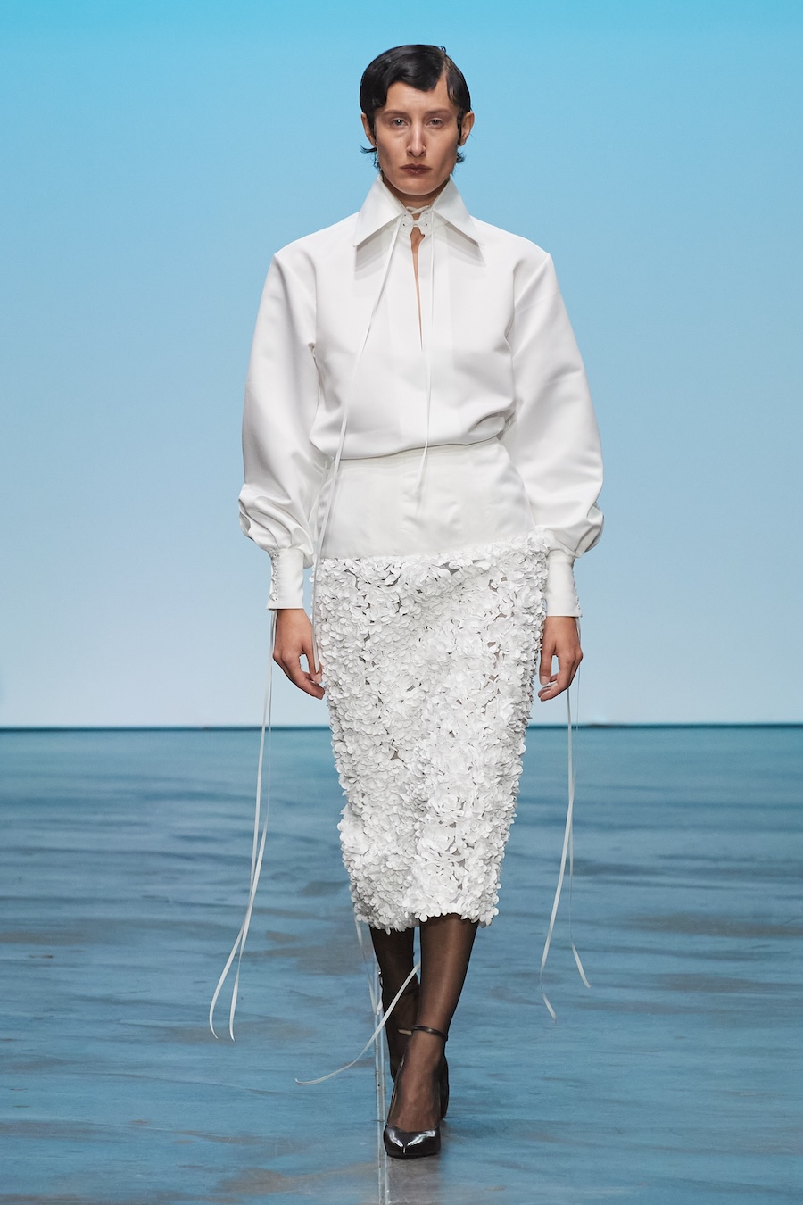 Silk blouses with bows, pencil skirts, and voluminous tulle petticoats meet tuxedo shirts for a modern dandy look, complete with suspenders, sock garters, and Spencer jackets. Recycled leather lends a certain hardness and robustness to the collection, harmonizing with intricate drapings subtly reminiscent of Greco-Roman antiquity, with its mythology and the accompanying god of love, Cupid. Tangled, three-dimensional floral structures on a pure white jacket convey a sense of chaos, while crochet elements add a humorous touch to the interplay of appearance and reality.