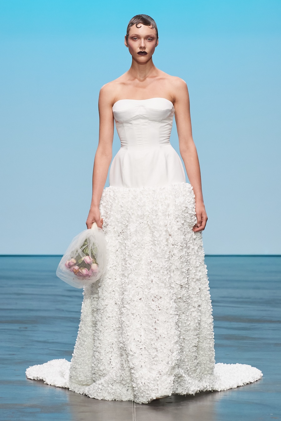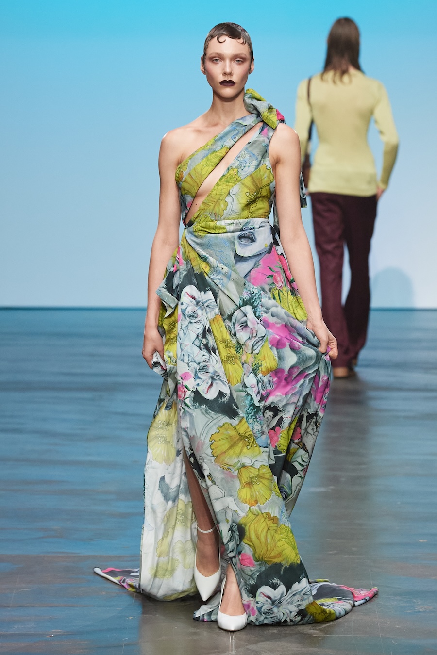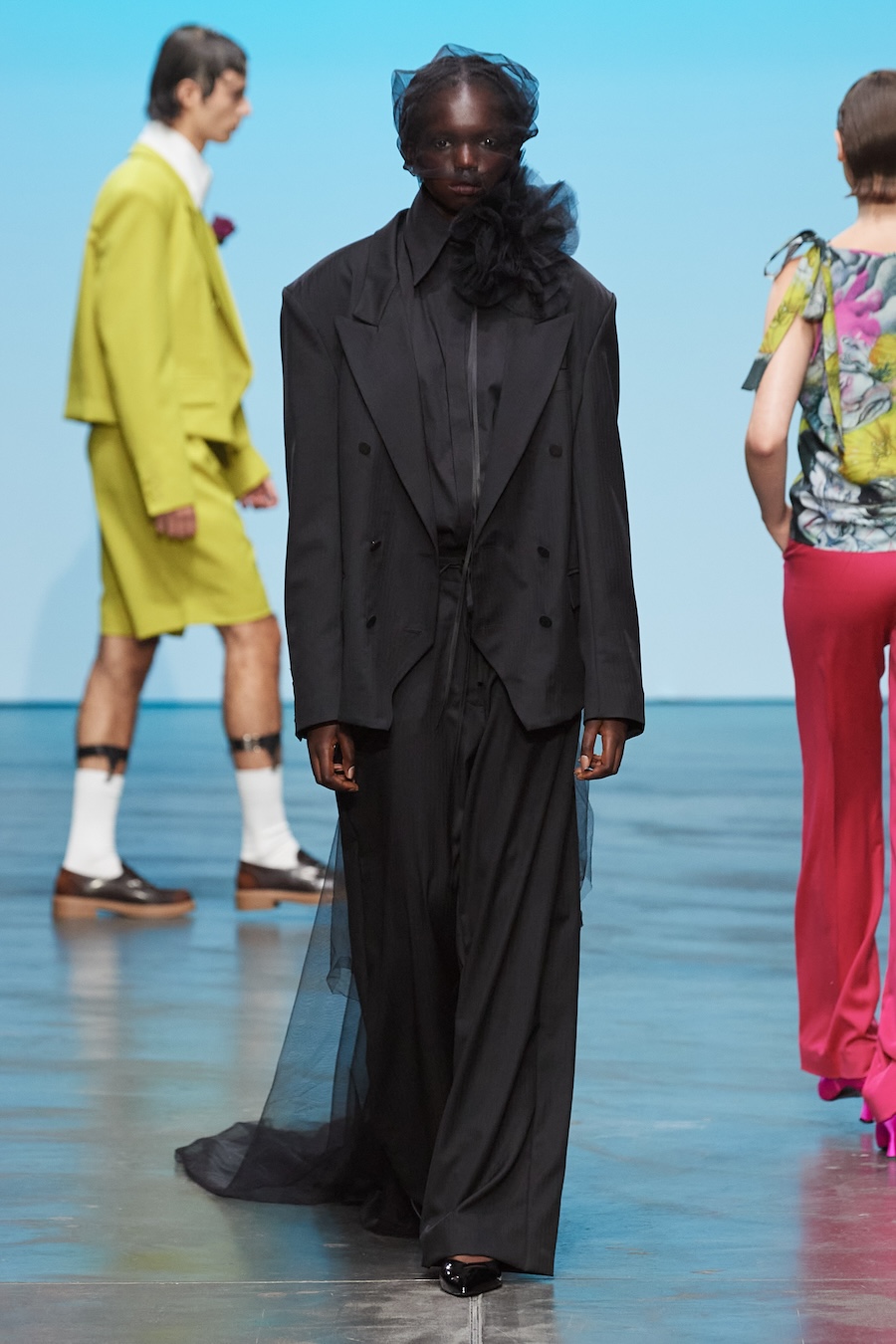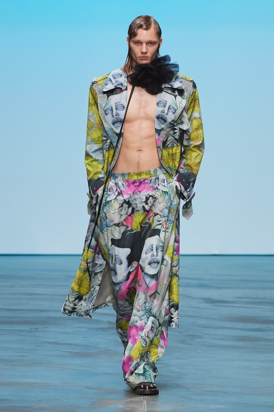 Silk blouses with bows, pencil skirts, and voluminous tulle petticoats meet tuxedo shirts for a modern dandy look, complete with suspenders, sock garters, and Spencer jackets. Recycled leather lends a certain hardness and robustness to the collection, harmonizing with intricate drapings subtly reminiscent of Greco-Roman antiquity, with its mythology and the accompanying god of love, Cupid. Tangled, three-dimensional floral structures on a pure white jacket convey a sense of chaos, while crochet elements add a humorous touch to the interplay of appearance and reality.