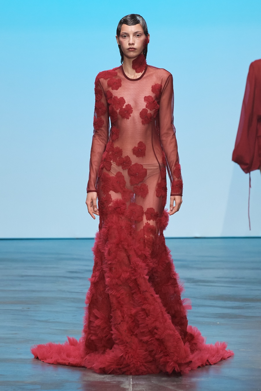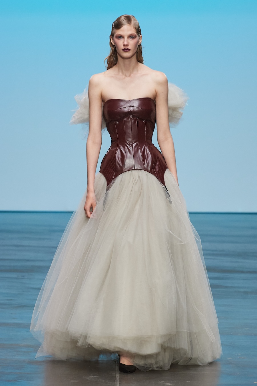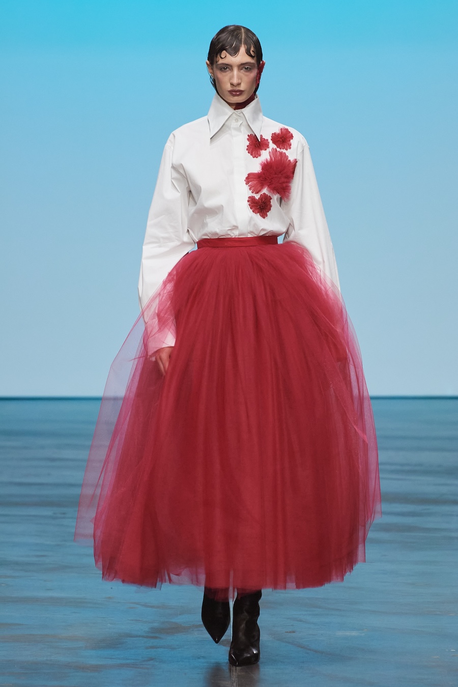 The emotional centrepiece of this SS25 collection is vibrant reds in various shades. When combined with grey, black, white, and lime green, this contrasting colour palette primarily features in heavy fabrics. Another central element is the high-quality corsets symbolizing the emptiness and constraint of heartache. As indicated by the collection’s title, further references to the 1950s are integral to the overall design.