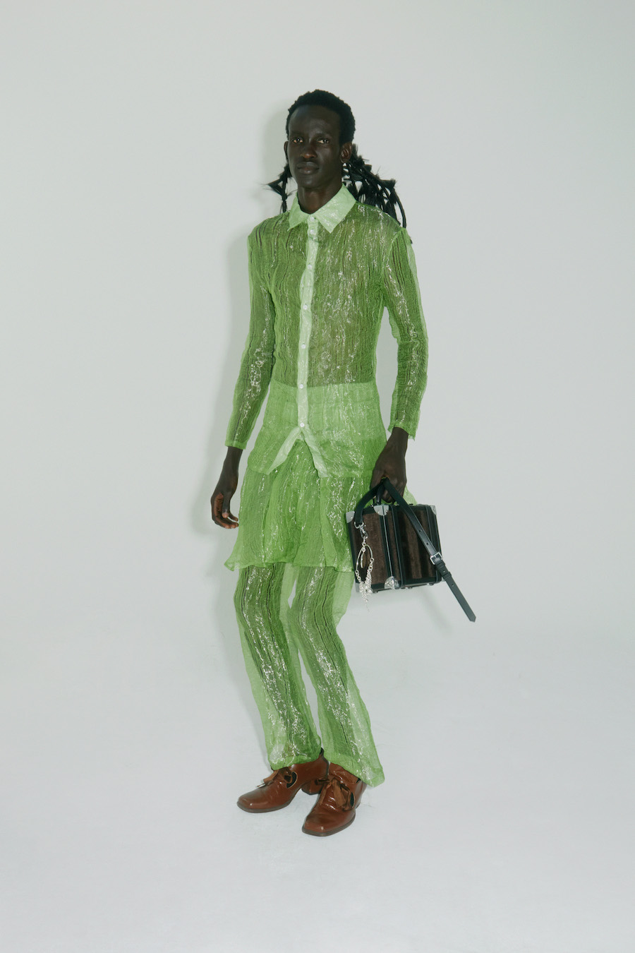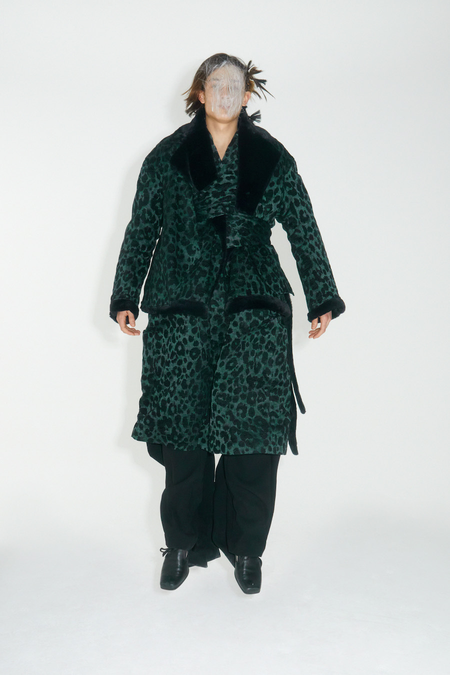 Danshan continue to serve their signature range of soft tactile fabrics including satin, crepe, taffeta, chiffon and organza in order to showcase fluidity in masculinity. This collection also uses a special blend of unconventional materials and processes including horse mane hair, vegan hide made with plant based fibres and animal print in abstract form to symbolise our relationship with nature, while metal and silk blend organza show a future in overcoming fear.
