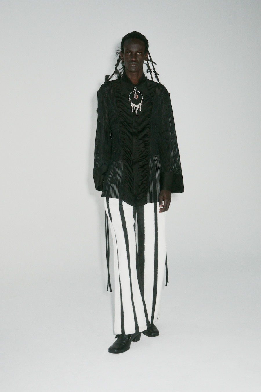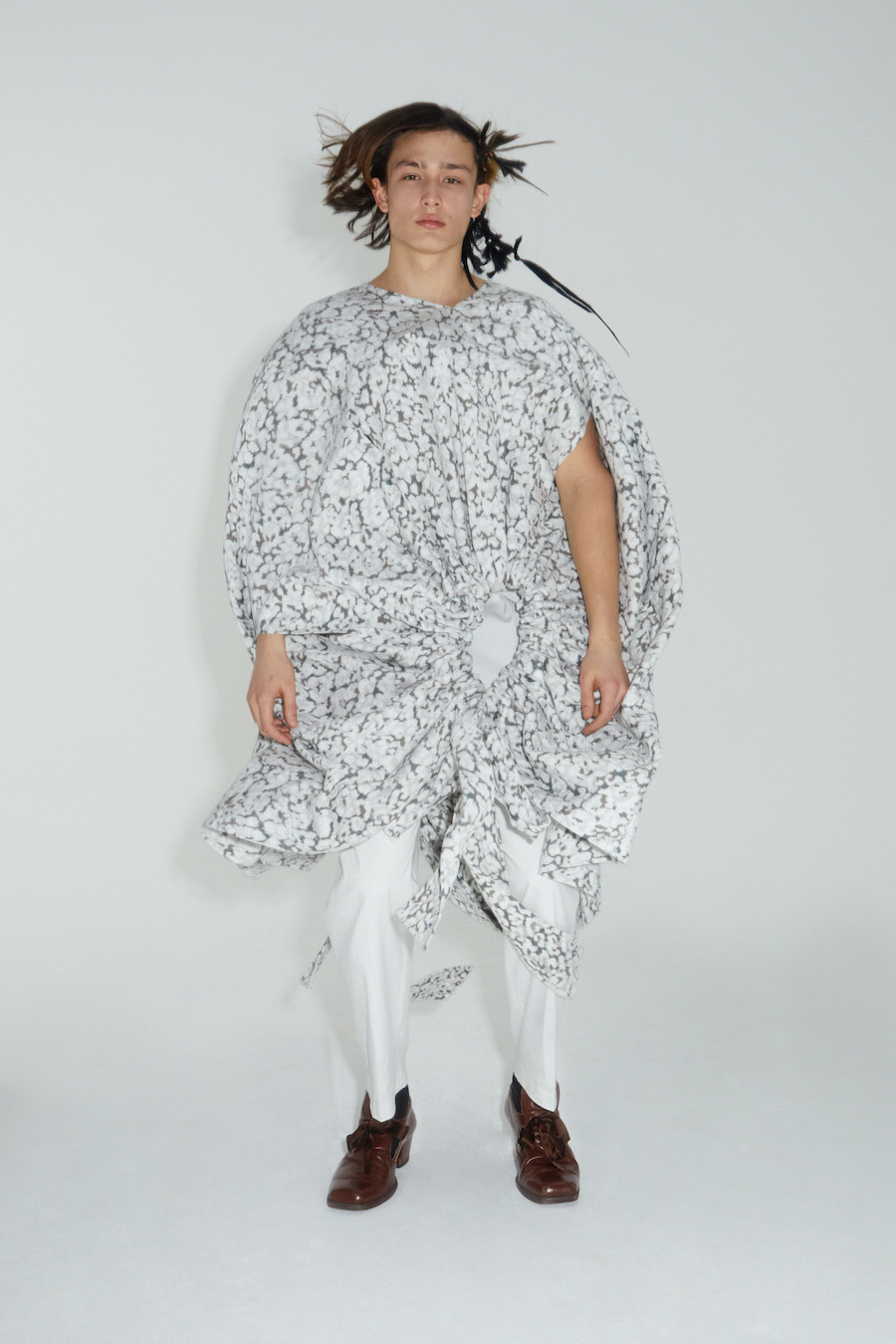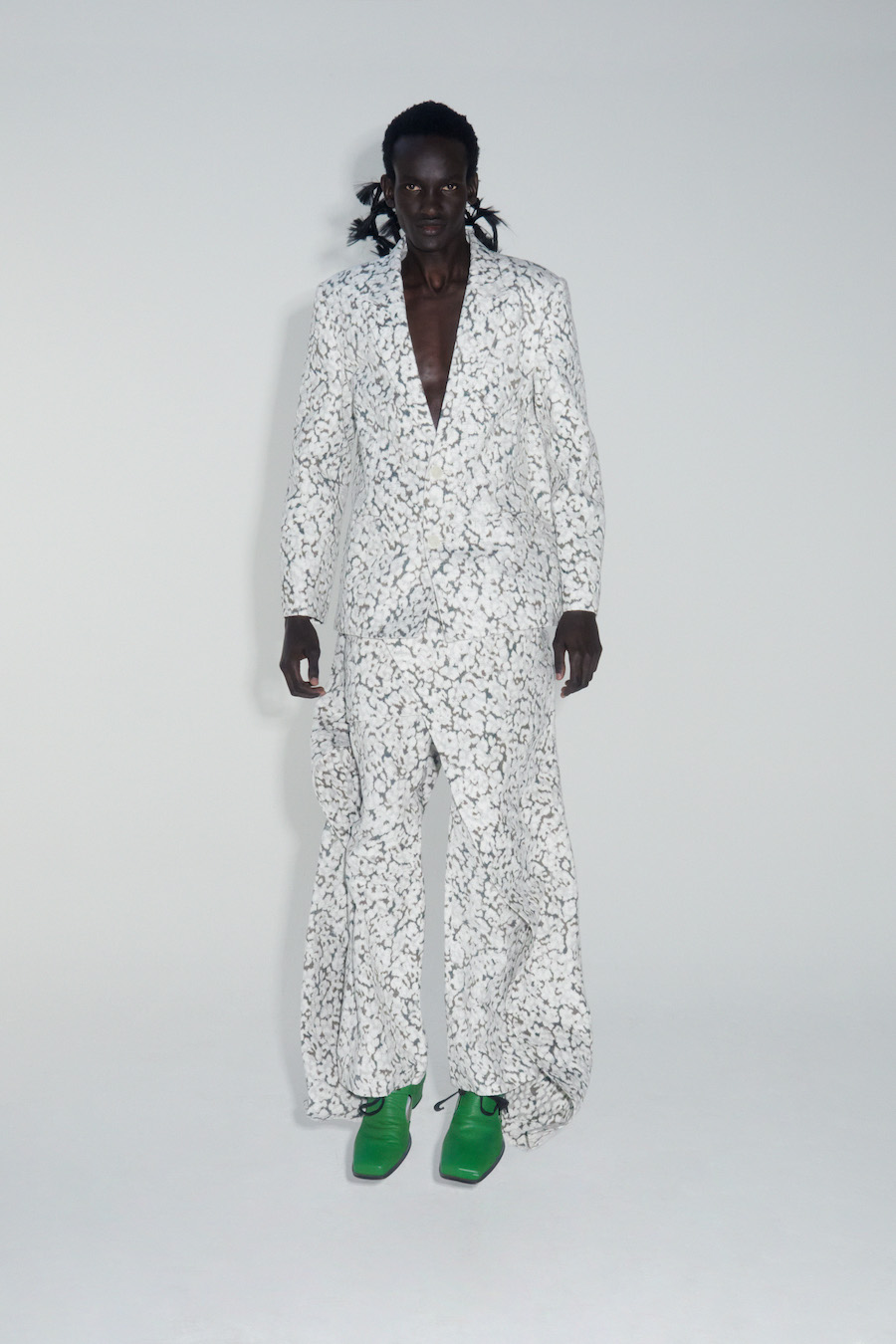 Danshan continue to serve their signature range of soft tactile fabrics including satin, crepe, taffeta, chiffon and organza in order to showcase fluidity in masculinity. This collection also uses a special blend of unconventional materials and processes including horse mane hair, vegan hide made with plant based fibres and animal print in abstract form to symbolise our relationship with nature, while metal and silk blend organza show a future in overcoming fear.