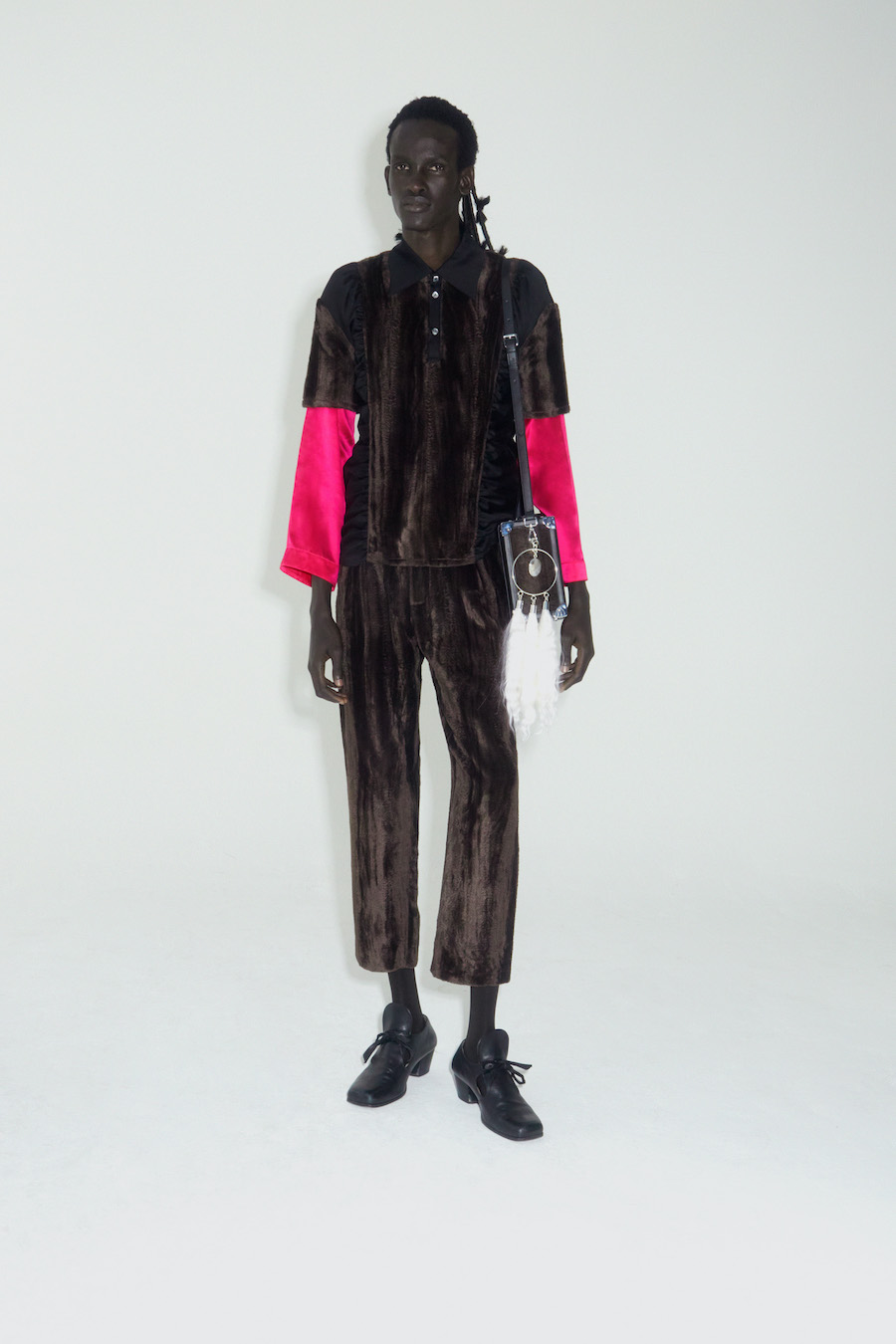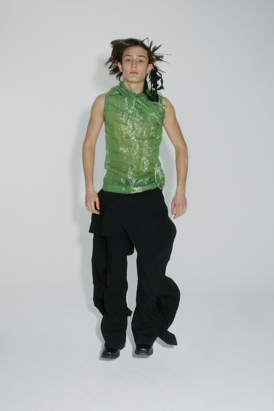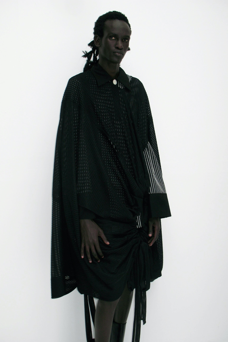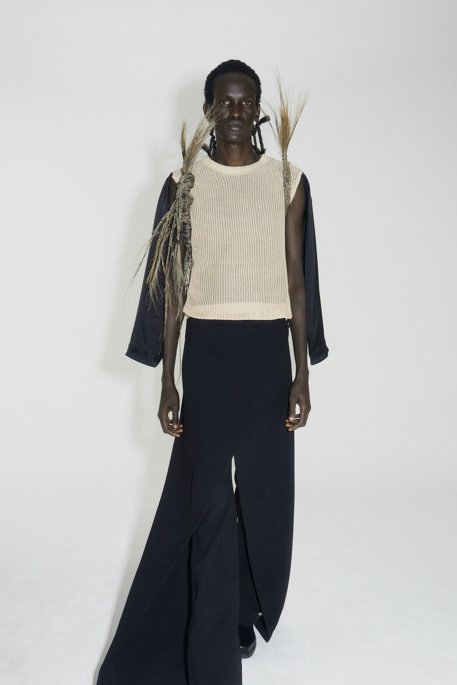 Danshan continue to serve their signature range of soft tactile fabrics including satin, crepe, taffeta, chiffon and organza in order to showcase fluidity in masculinity. This collection also uses a special blend of unconventional materials and processes including horse mane hair, vegan hide made with plant based fibres and animal print in abstract form to symbolise our relationship with nature, while metal and silk blend organza show a future in overcoming fear.