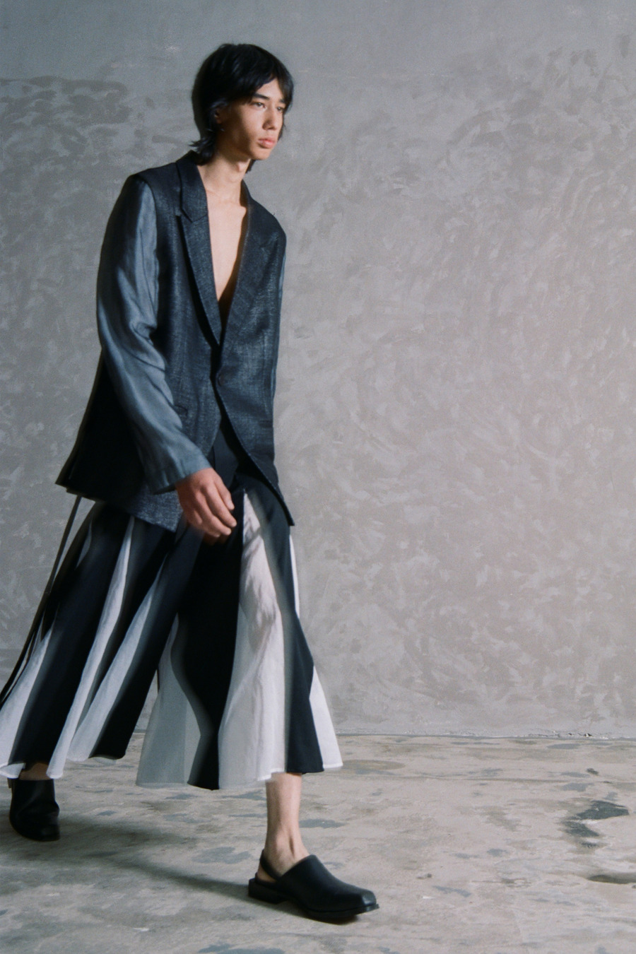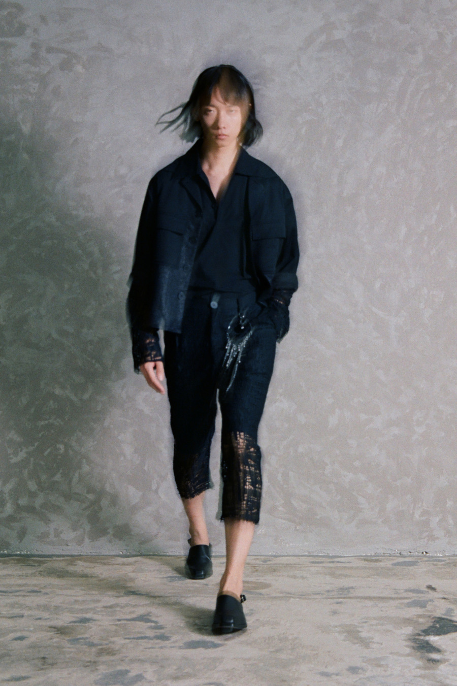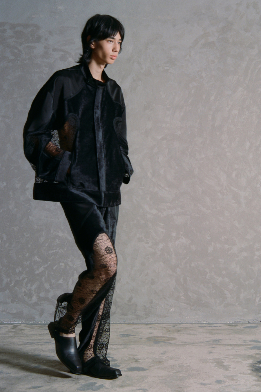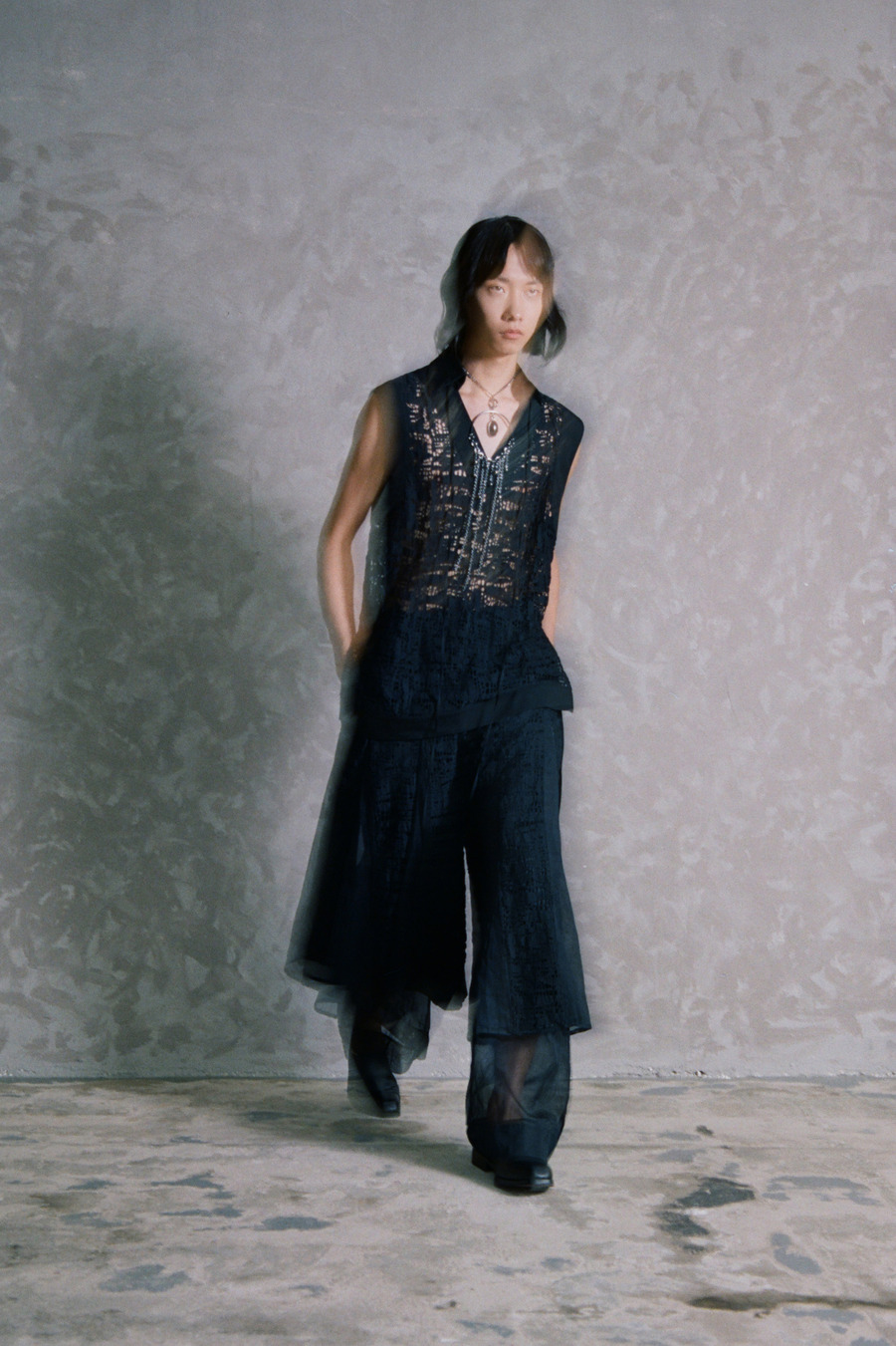Danshan continues to develop different ways of layering unconventional combinations of fabrics on each individual piece; chino with satin, velvet with lace, heavy woven textile with organza, and georgette with mesh. The majority of the material is biodegradable and also uses deadstock fabric which is sustainable.