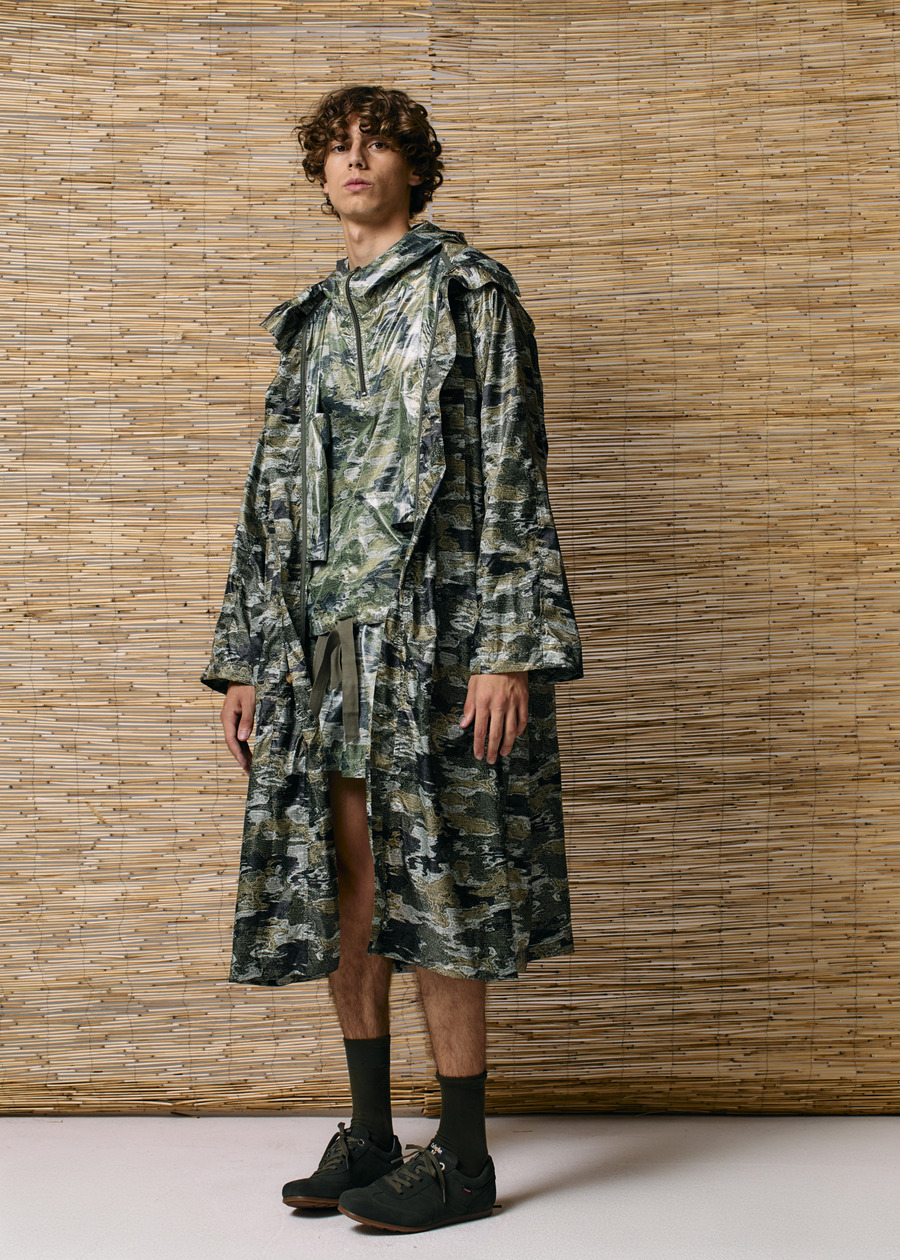 David Catalán’s S/S25 collection, “1974,” delves into the rich tapestry of Portuguese traditions, presenting an avant-garde fusion that’s as historical as it is contemporary. Drawing inspiration from a pivotal moment in Portuguese history, the collection marries traditional cotton lace and delicate lacework with bold camouflage fabrics, a nod to the April 25, 1974, Carnation Revolution’s troops. The juxtaposition creates a visual narrative steeped in heritage and resilience.
