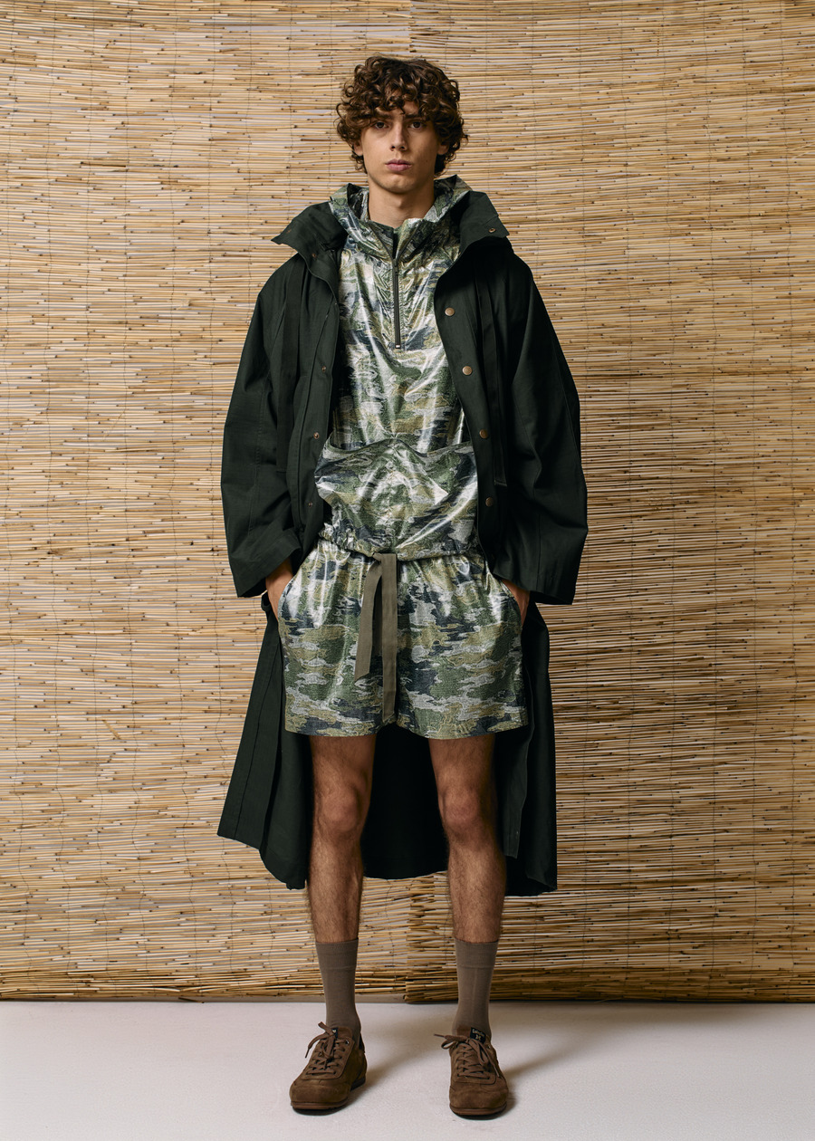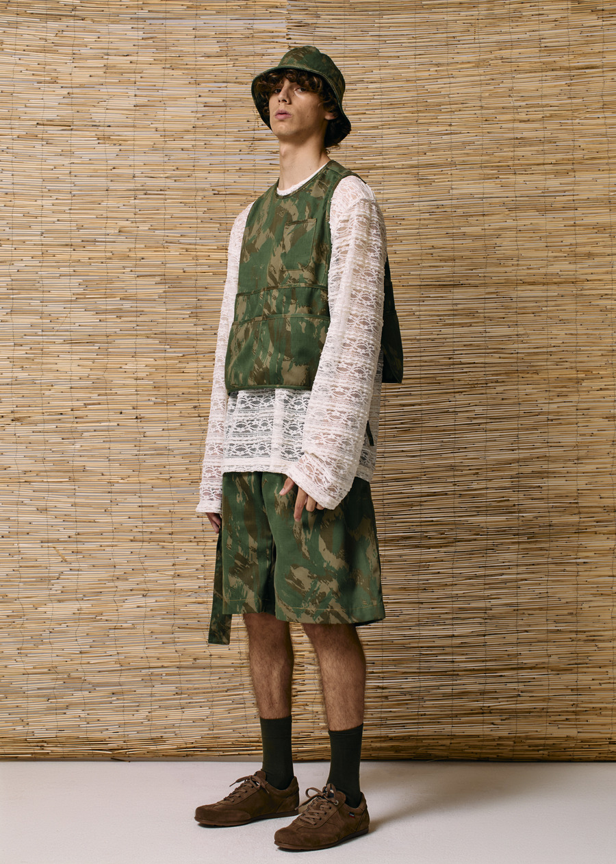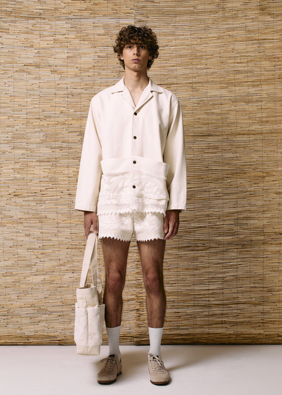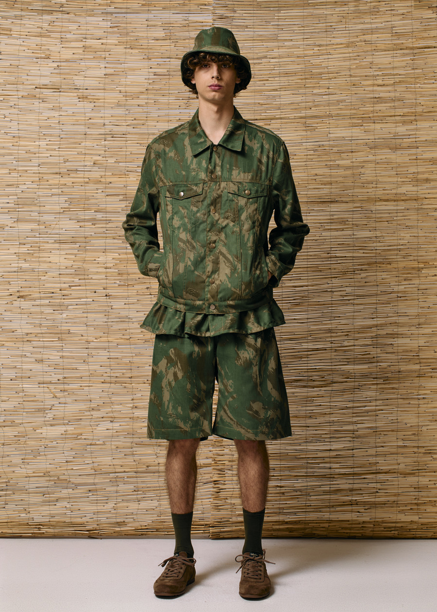 David Catalán’s S/S25 collection, “1974,” delves into the rich tapestry of Portuguese traditions, presenting an avant-garde fusion that’s as historical as it is contemporary. Drawing inspiration from a pivotal moment in Portuguese history, the collection marries traditional cotton lace and delicate lacework with bold camouflage fabrics, a nod to the April 25, 1974, Carnation Revolution’s troops. The juxtaposition creates a visual narrative steeped in heritage and resilience.