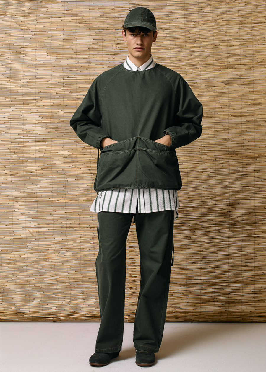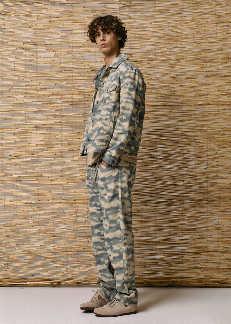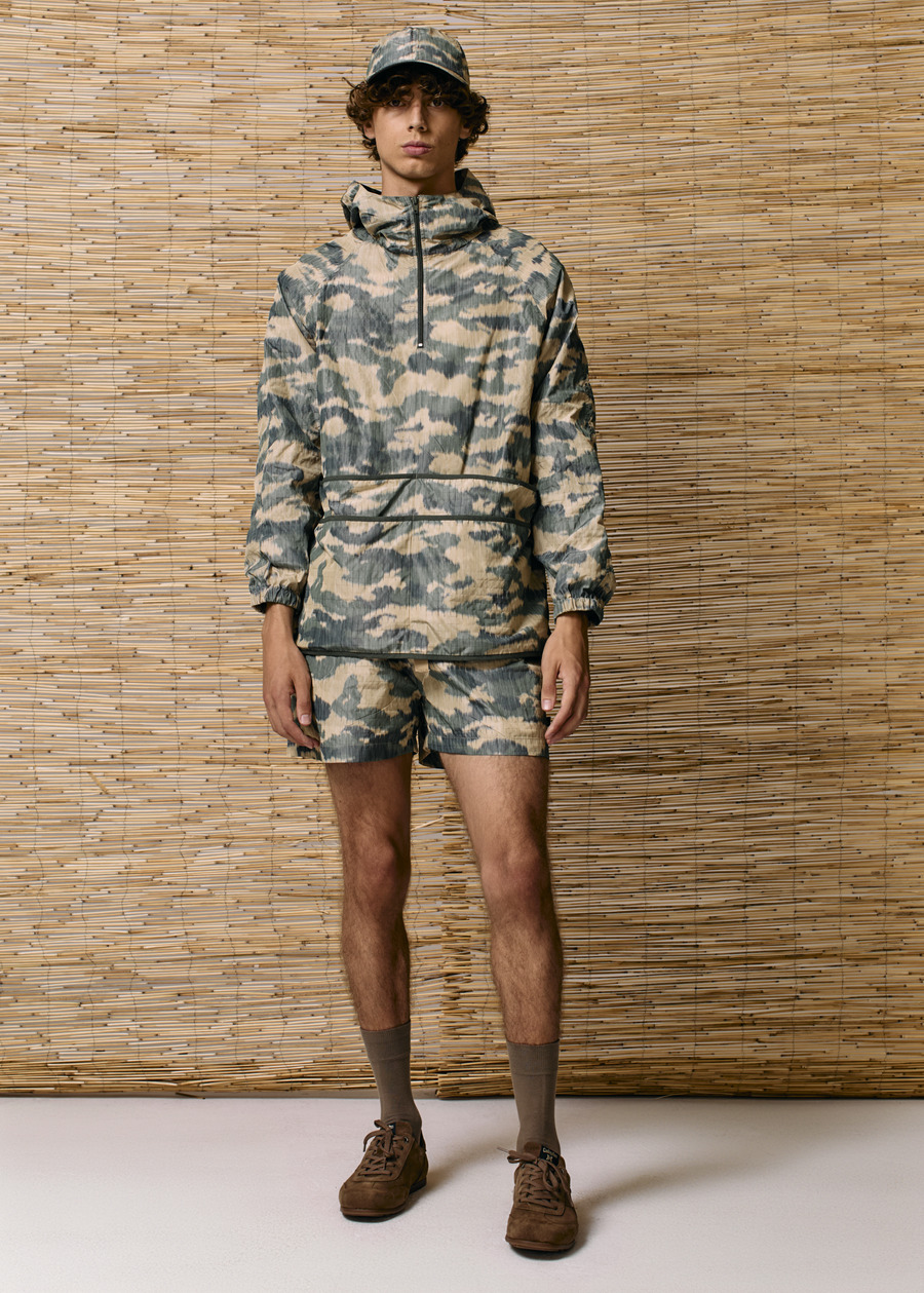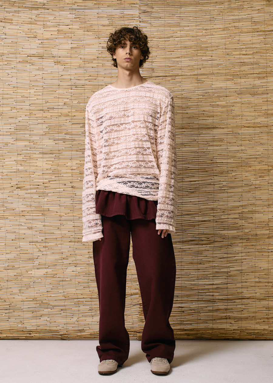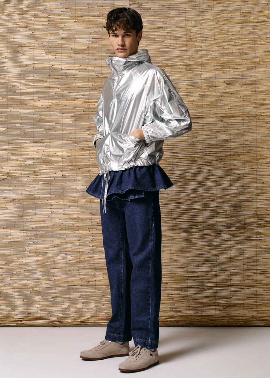 David Catalán’s S/S25 collection, “1974,” delves into the rich tapestry of Portuguese traditions, presenting an avant-garde fusion that’s as historical as it is contemporary. Drawing inspiration from a pivotal moment in Portuguese history, the collection marries traditional cotton lace and delicate lacework with bold camouflage fabrics, a nod to the April 25, 1974, Carnation Revolution’s troops. The juxtaposition creates a visual narrative steeped in heritage and resilience.