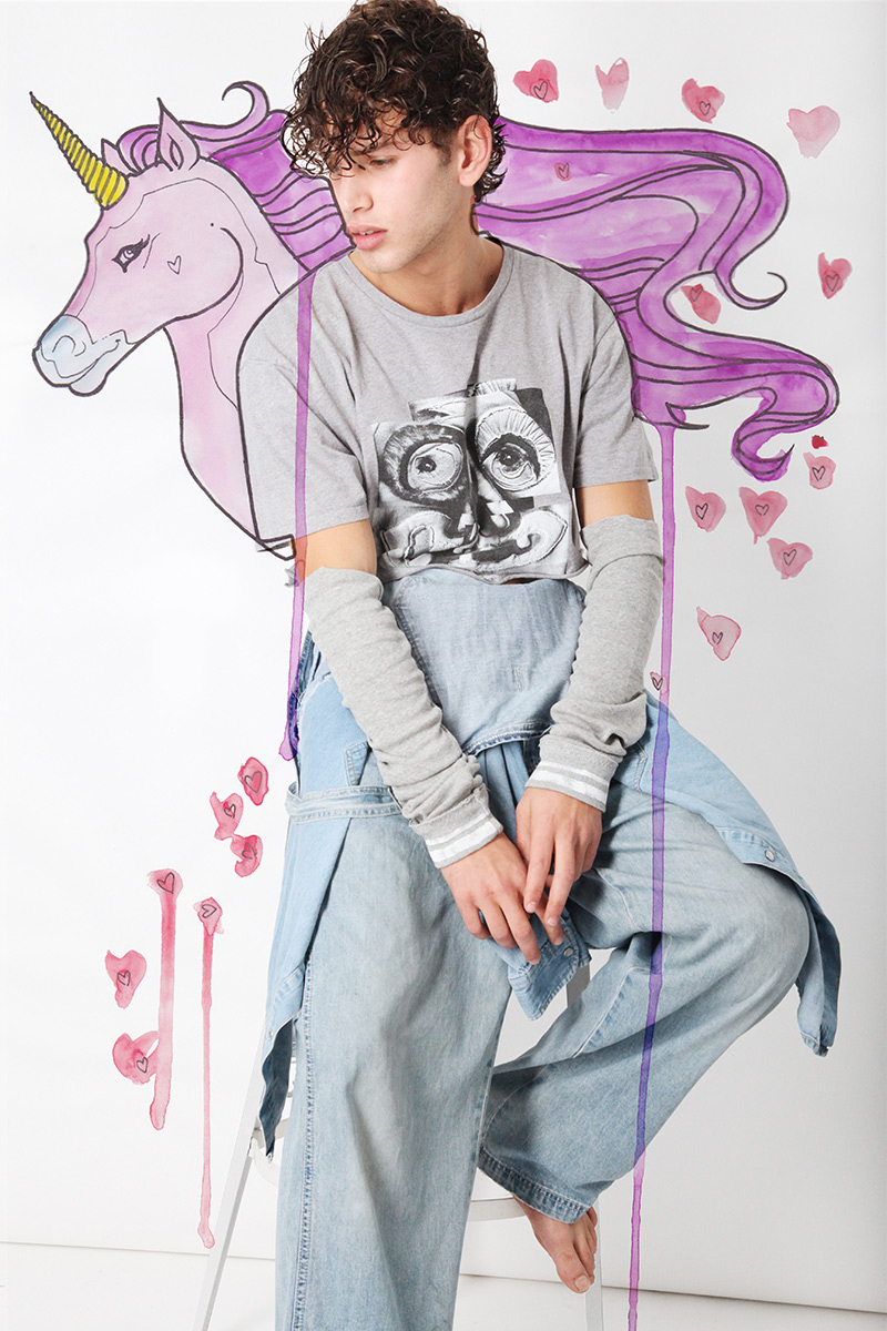 A KALTBLUT exclusive menswear editorial from London. Photographer Karl Slater captured Eyal Booker signed at NEVS Models for us. Styling by Hannah Rose Fry using fashion by Field of Ponies, Julian Zigerli, Scotch & Soda, Alex Mullins and Caine London. Artwork by Tom Taylor