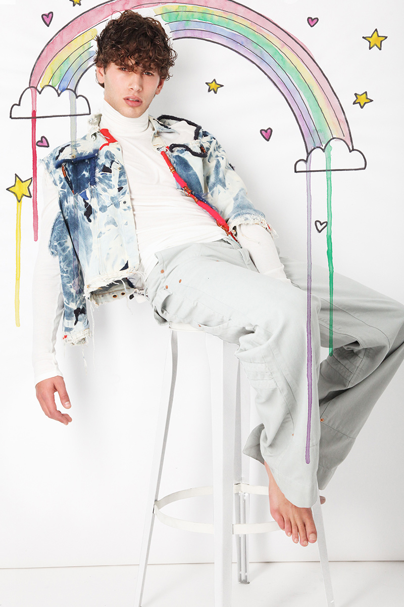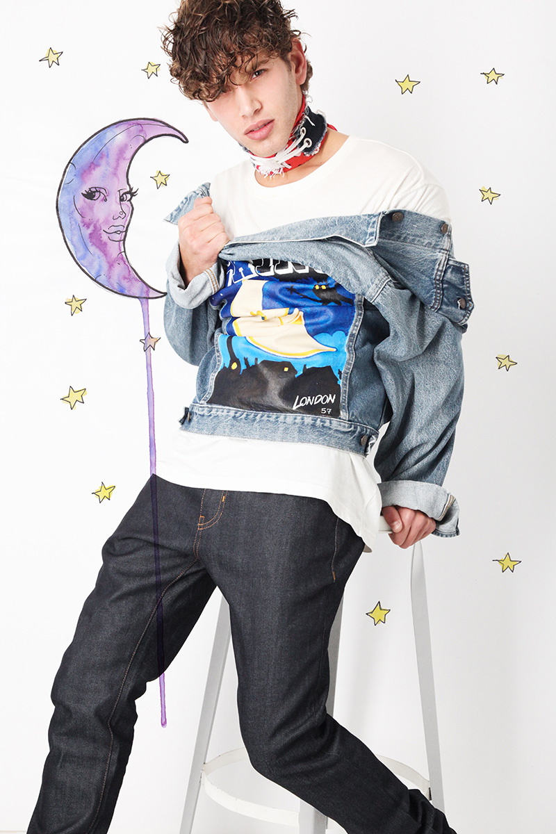 Caine London, White Tee. Caine London, Painted Denim Jacket. Natural Selection, Denim Jeans. Scotch & Soda, Red neck scarf. Field of Ponies, Denim Choker.