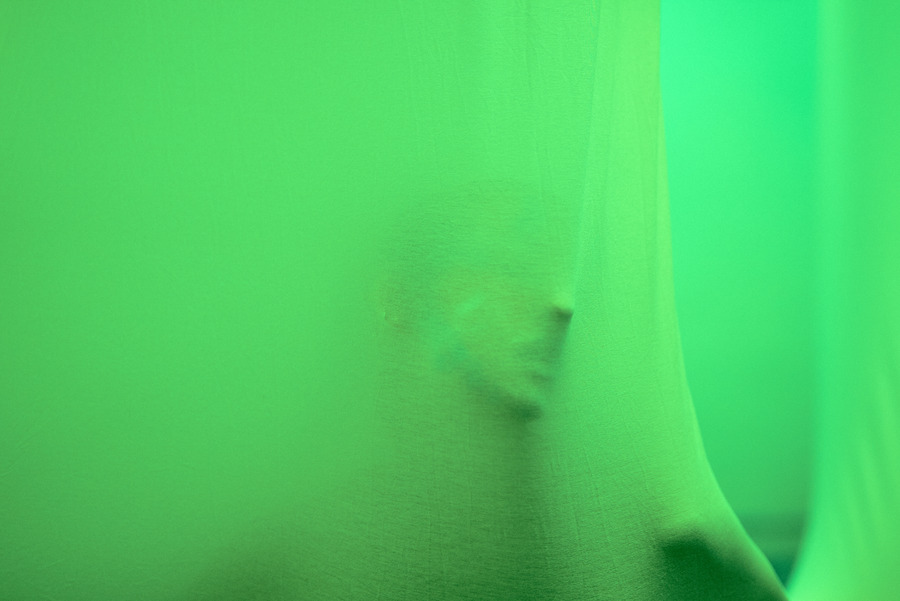 The exhibition featured 13 fabric trees, surrounded by mirrored surfaces and bathed in green lights, setting the stage for an otherworldly atmosphere.