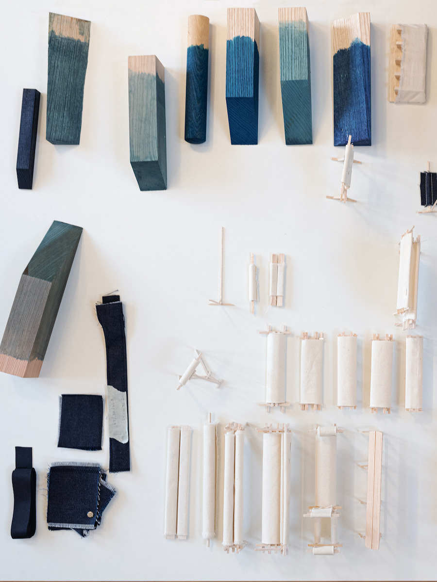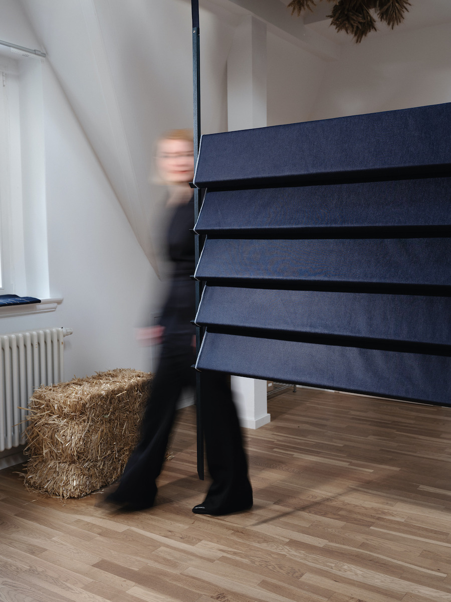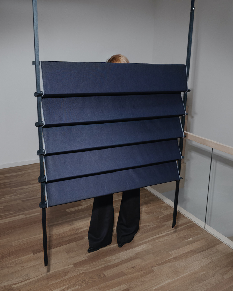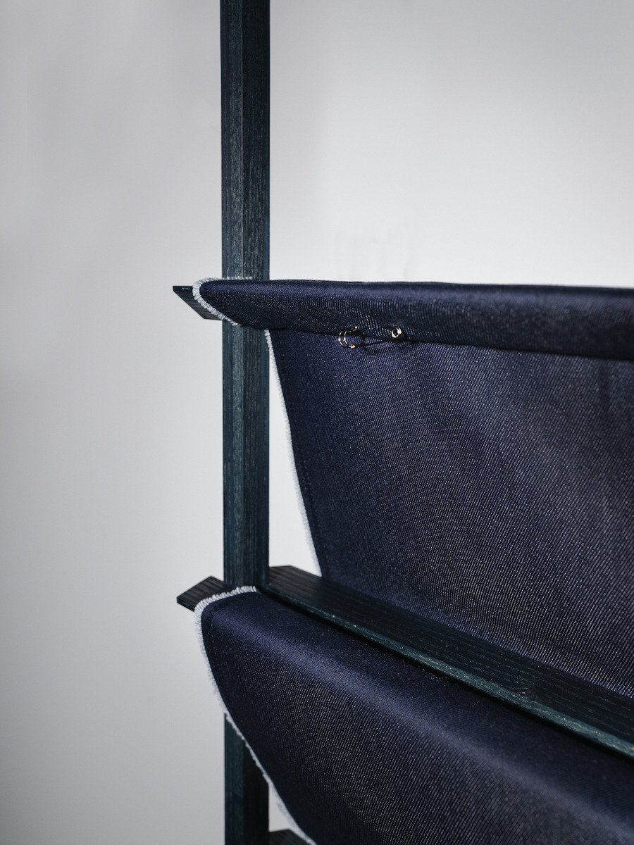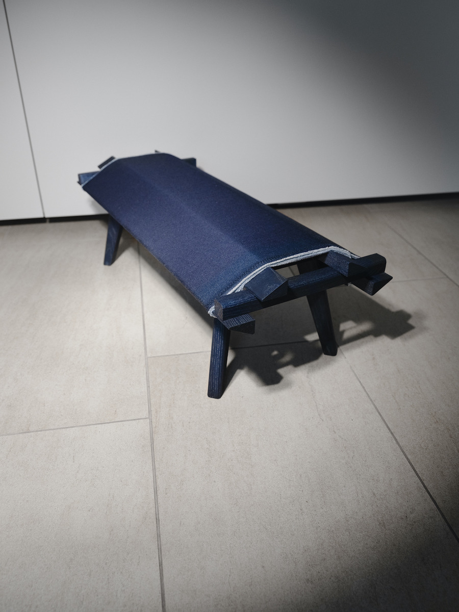 As a core principle, the German designer wanted to maintain the fabric in a raw state: wrapped and filled, with minor cuts and seams. The use of thin frames, such as indigo-dyed ash wood will evoke a constructional co-dependency. Leaving the material as raw as possible, the pieces celebrate the idea of borrowing, to maximize their potential for future transformations. To highlight its remarkable stability, denim is employed in further detail, such as weights and belts, to keep the structures in position. The result is a five-piece office furniture series consisting of; a room divider, floor mat, leaning bench, low stool and valet stand.
