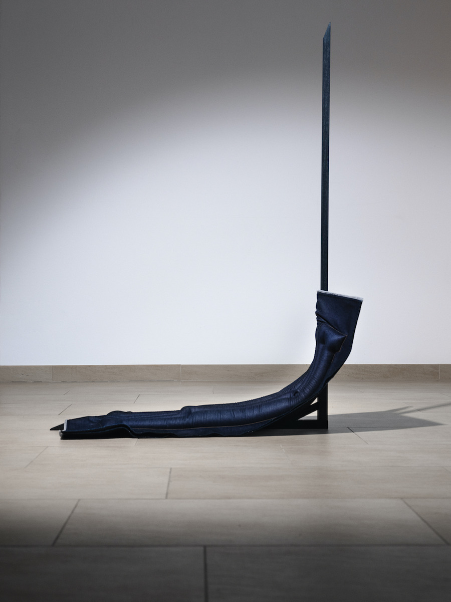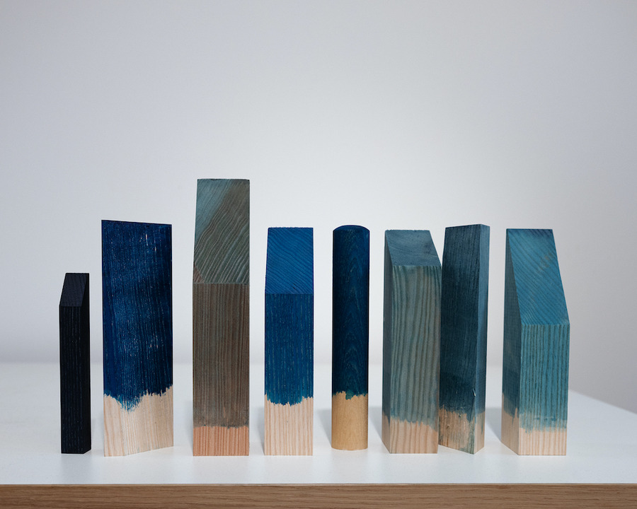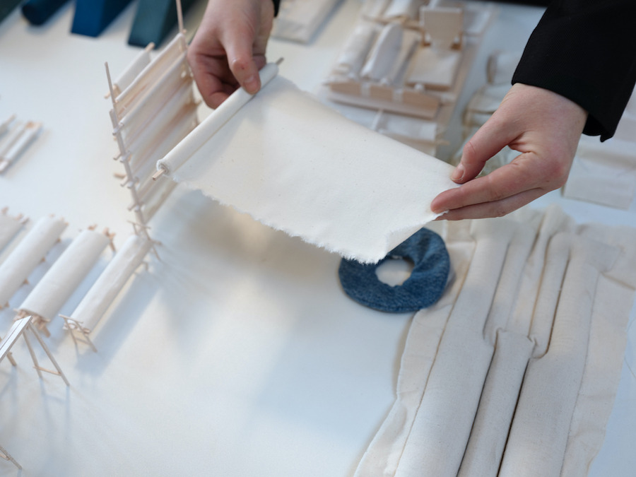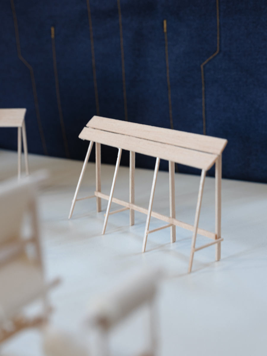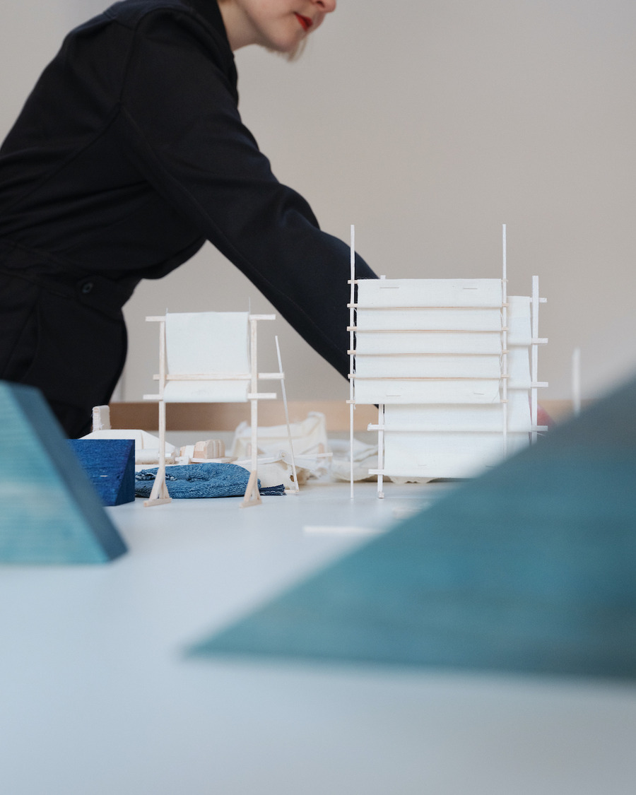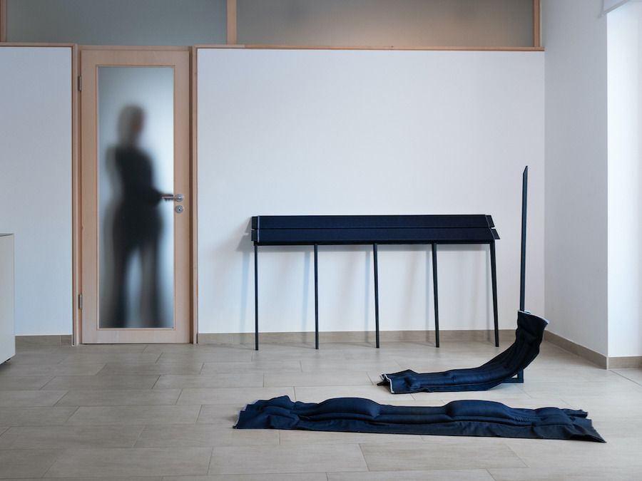 As a core principle, the German designer wanted to maintain the fabric in a raw state: wrapped and filled, with minor cuts and seams. The use of thin frames, such as indigo-dyed ash wood will evoke a constructional co-dependency. Leaving the material as raw as possible, the pieces celebrate the idea of borrowing, to maximize their potential for future transformations. To highlight its remarkable stability, denim is employed in further detail, such as weights and belts, to keep the structures in position. The result is a five-piece office furniture series consisting of; a room divider, floor mat, leaning bench, low stool and valet stand.