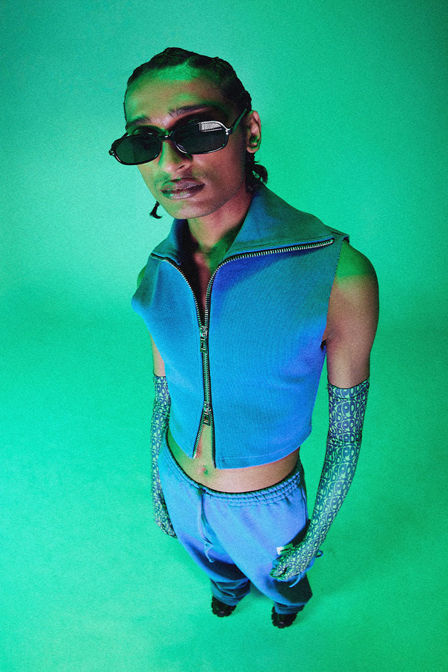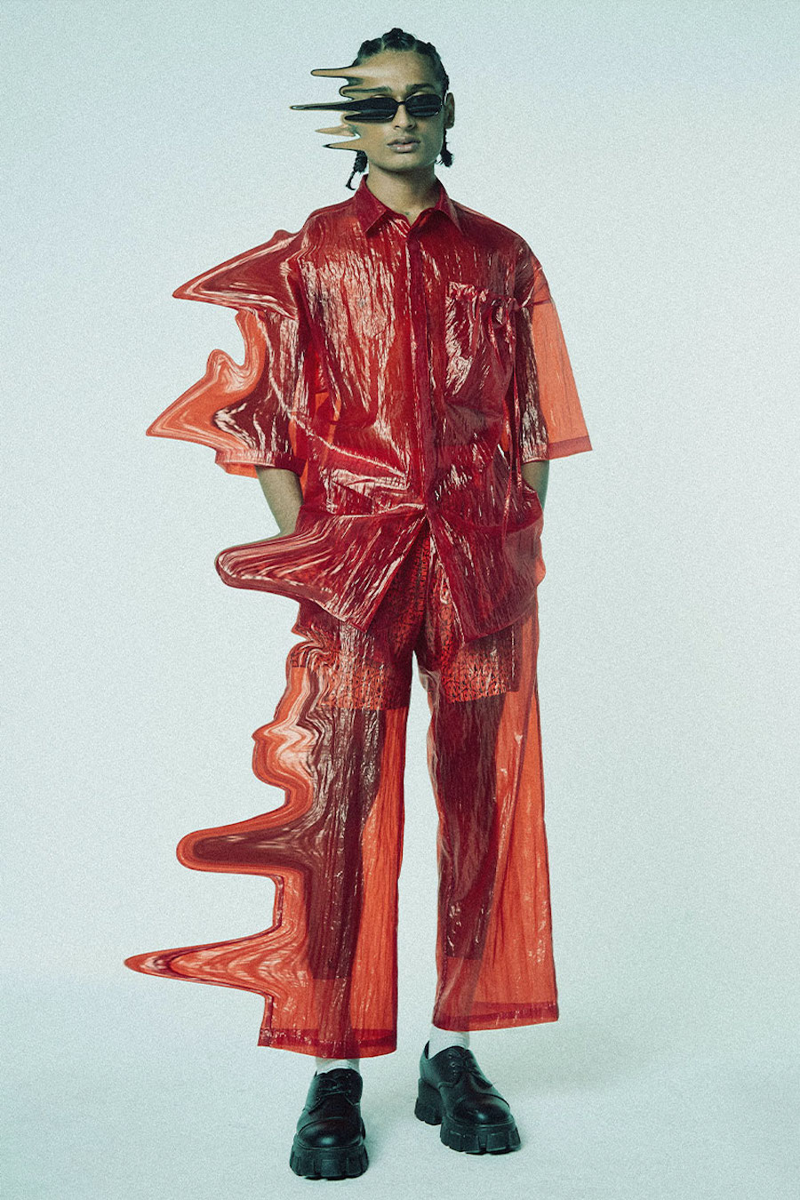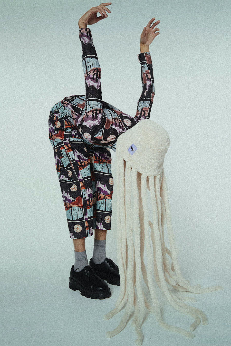 The collection offers an eclectic juxtaposition of silhouette, color and handcrafted details- A combination of old and new. Poster print series, reminiscent of the 1970s, explore the capabilities of the human mind by diving within. Nature and science come together in geometric floral motifs and graphic landscapes, meticulously hand embroidered by skilled Indian artisans. Logo skin suits and tones of digital violet relate to the explosion of the metaverse, grounded by the dreadlock hats- significant of acquired wisdom over time