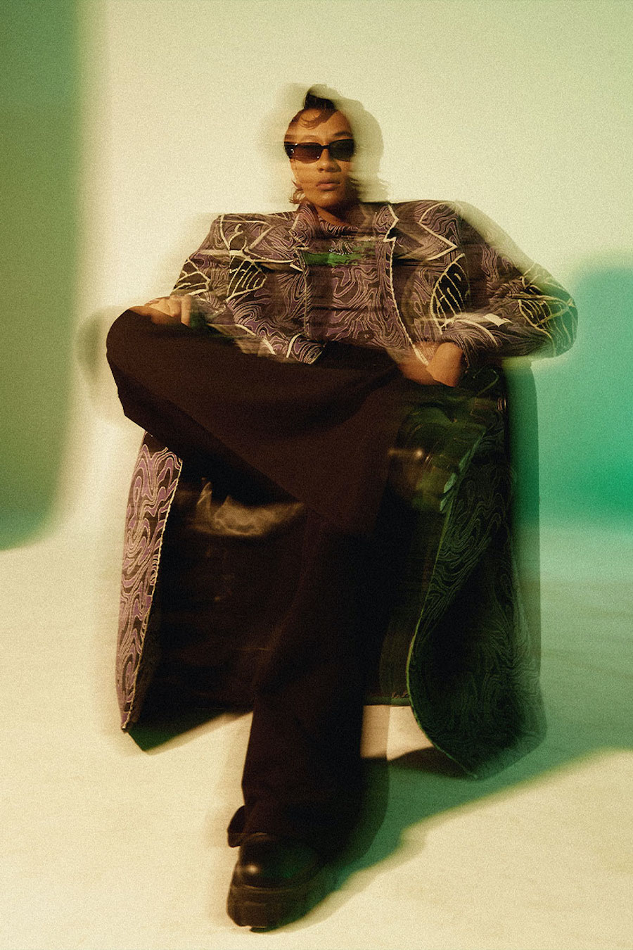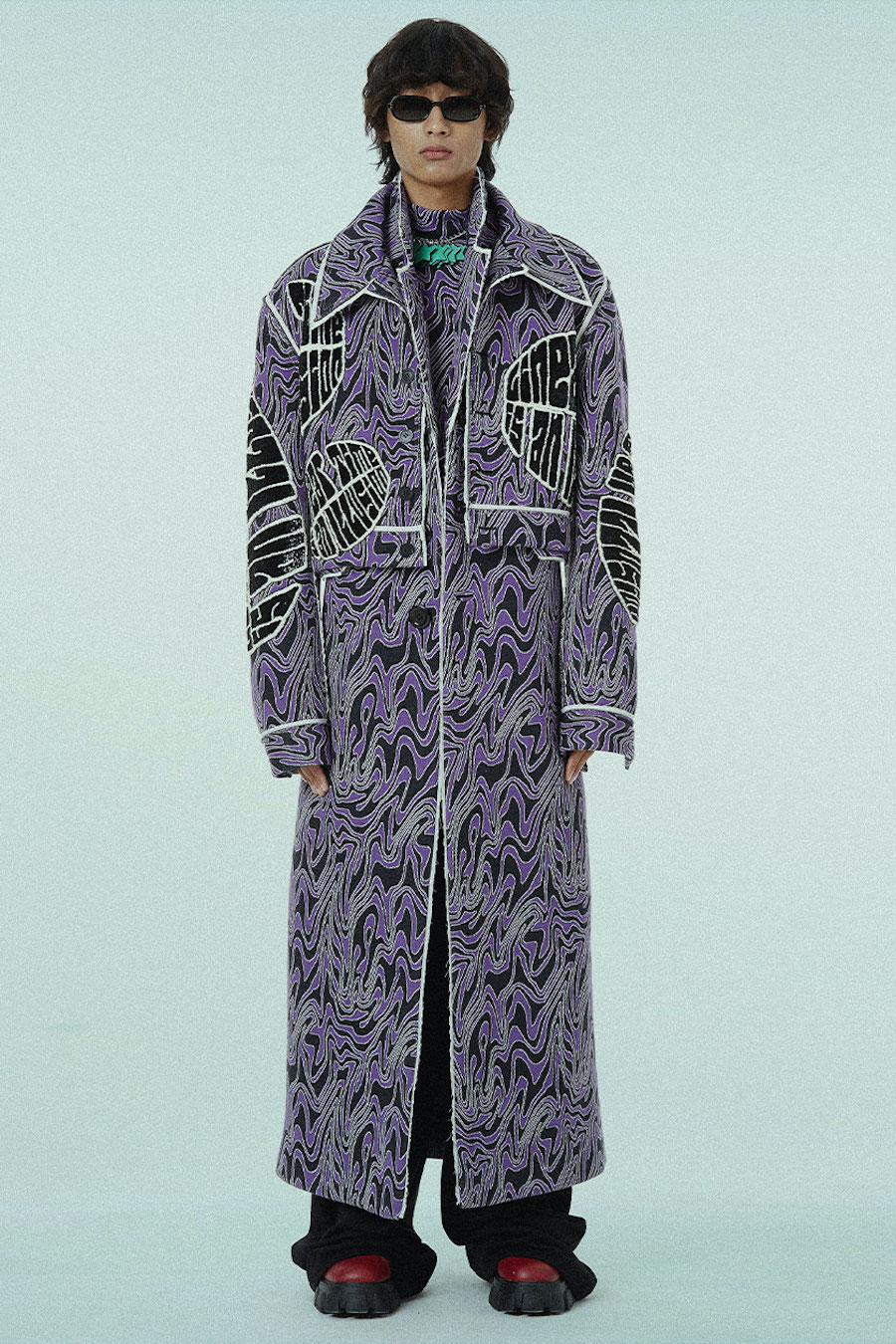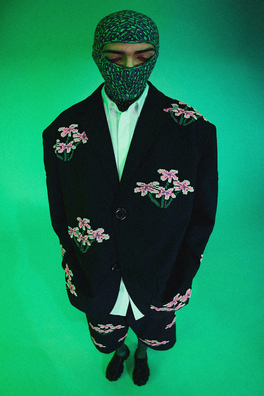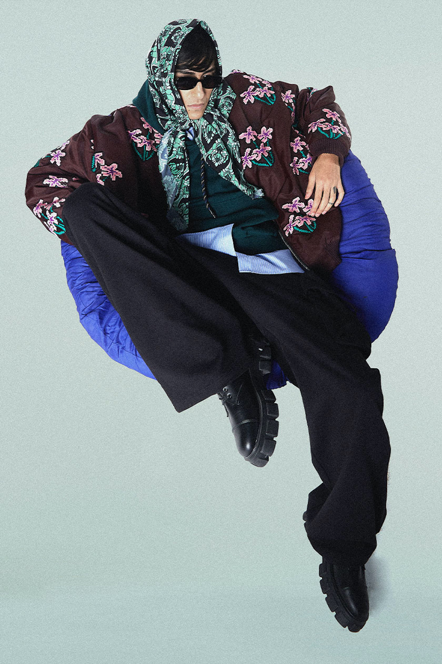 The collection offers an eclectic juxtaposition of silhouette, color and handcrafted details- A combination of old and new. Poster print series, reminiscent of the 1970s, explore the capabilities of the human mind by diving within. Nature and science come together in geometric floral motifs and graphic landscapes, meticulously hand embroidered by skilled Indian artisans. Logo skin suits and tones of digital violet relate to the explosion of the metaverse, grounded by the dreadlock hats- significant of acquired wisdom over time
