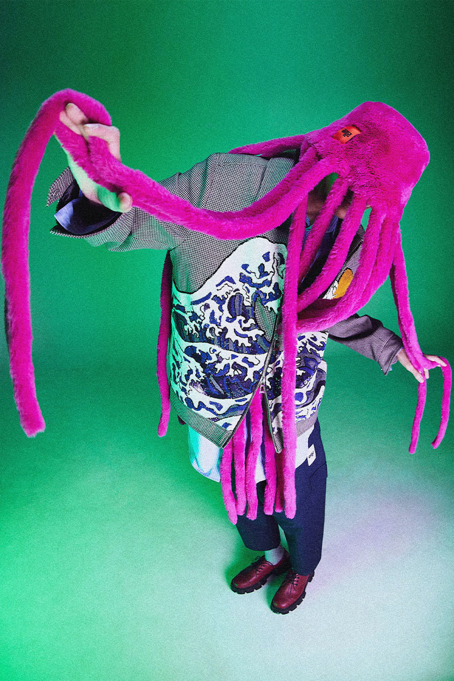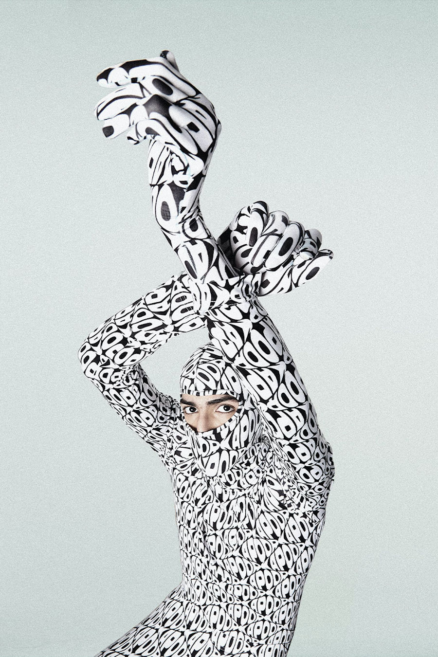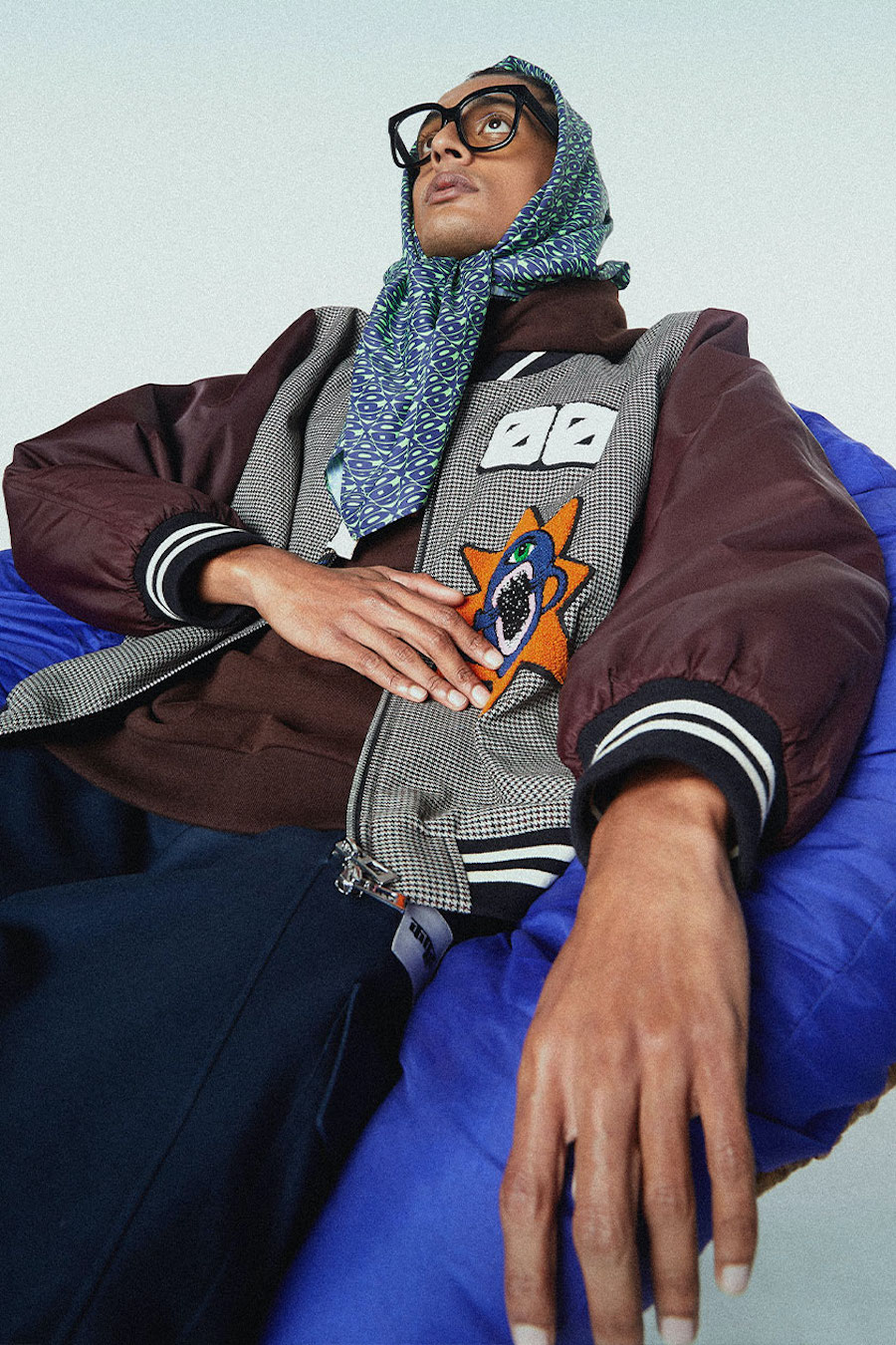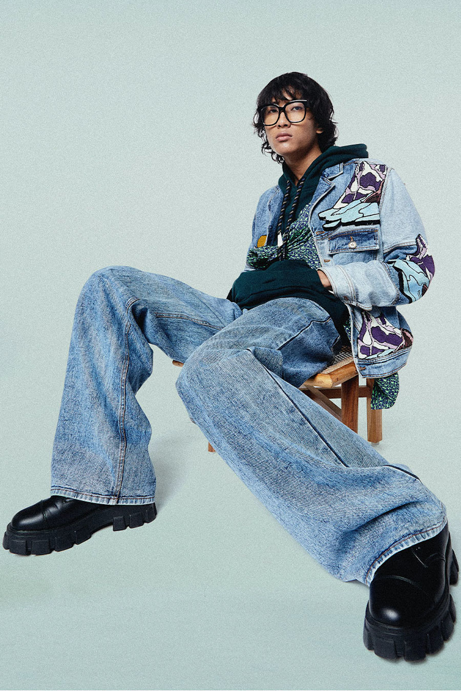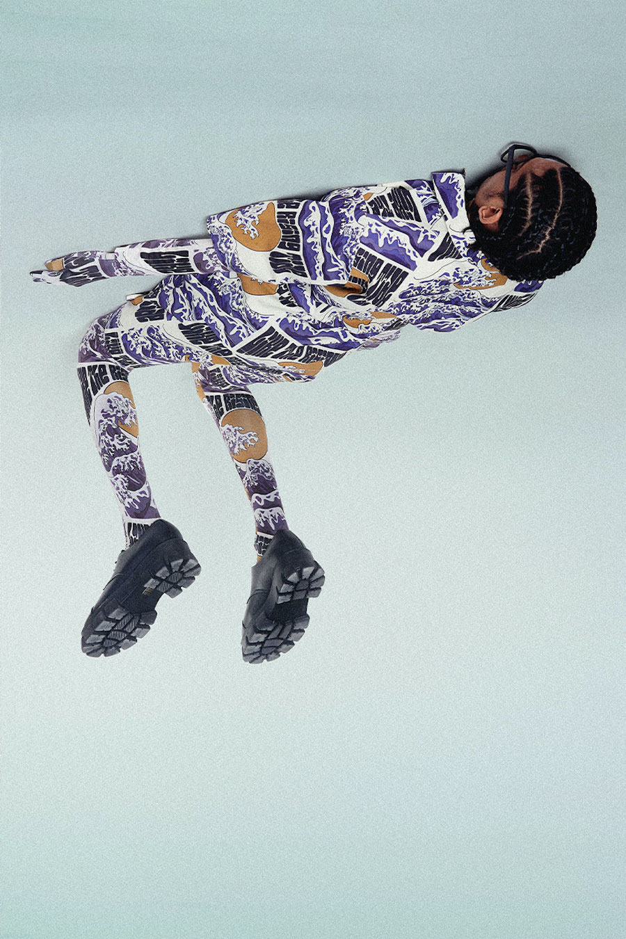 The collection offers an eclectic juxtaposition of silhouette, color and handcrafted details- A combination of old and new. Poster print series, reminiscent of the 1970s, explore the capabilities of the human mind by diving within. Nature and science come together in geometric floral motifs and graphic landscapes, meticulously hand embroidered by skilled Indian artisans. Logo skin suits and tones of digital violet relate to the explosion of the metaverse, grounded by the dreadlock hats- significant of acquired wisdom over time