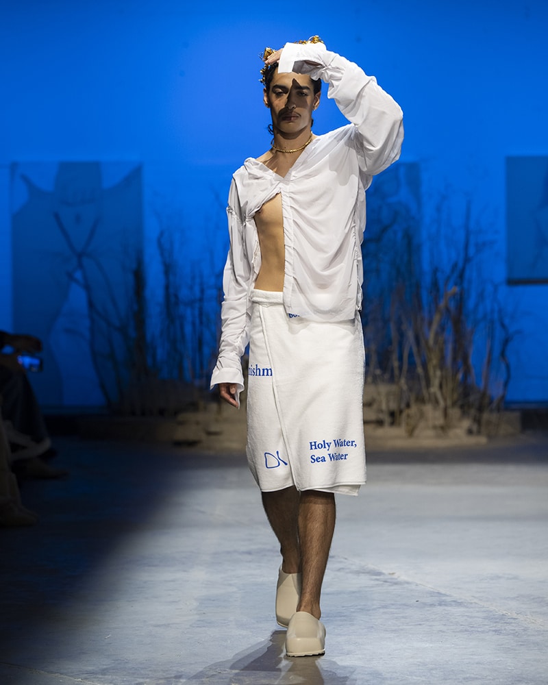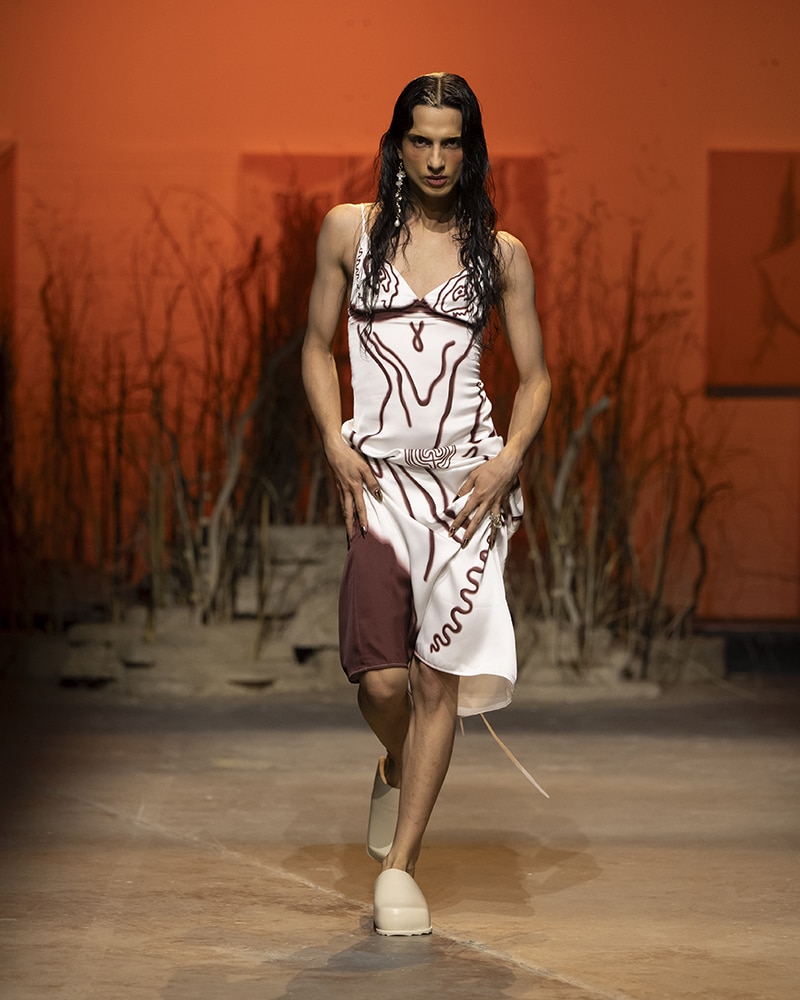 This season also signifies DI PETSA’s audacious debut into gender-fluid menswear. The brand’s signature iconic Wetlook is re-envisioned for the male form, bursting with pastel gradient hues. Everyday wear takes a new turn with draped white cotton wetlook hoodies and tracksuit bottoms. Natural, lightweight linens are crafted into draped trousers and open-shirt looks, perfect for catching those cool summer breezes.