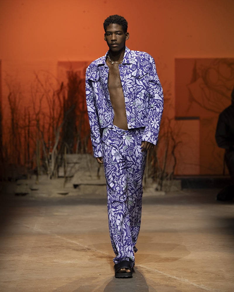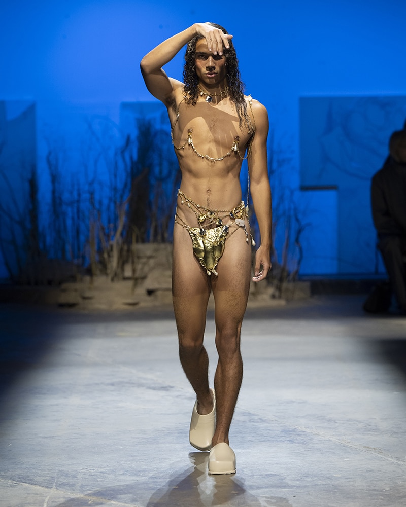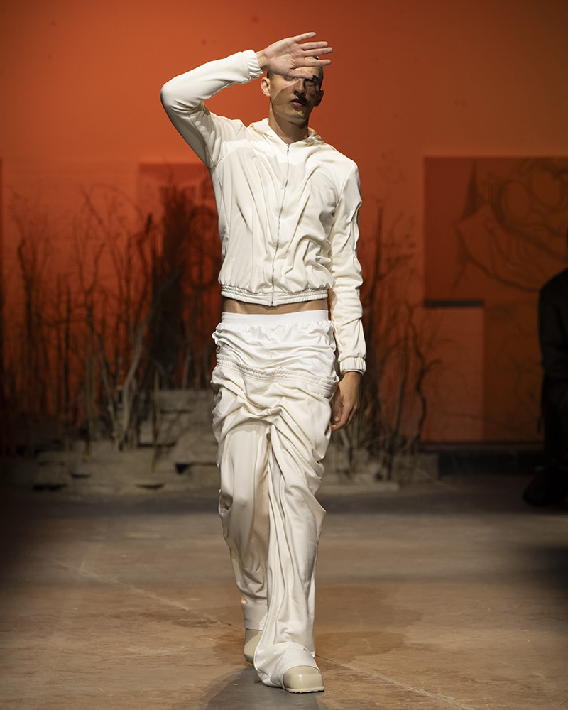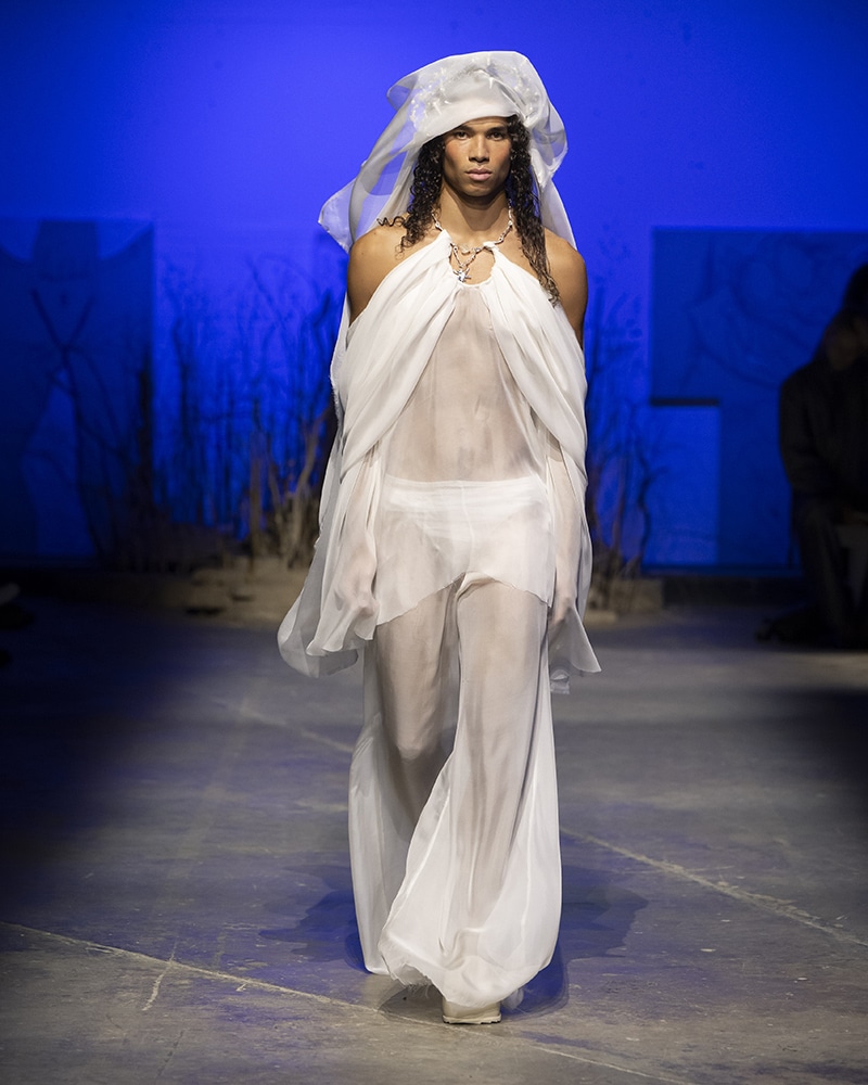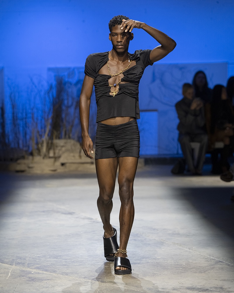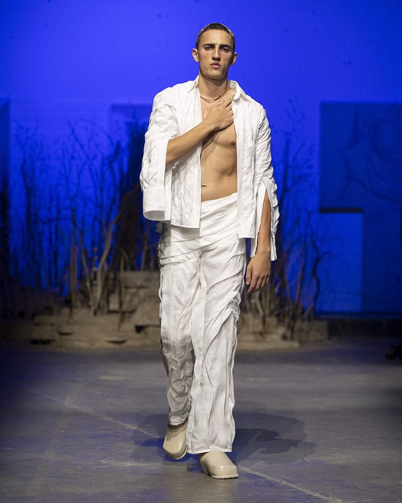 This season also signifies DI PETSA’s audacious debut into gender-fluid menswear. The brand’s signature iconic Wetlook is re-envisioned for the male form, bursting with pastel gradient hues. Everyday wear takes a new turn with draped white cotton wetlook hoodies and tracksuit bottoms. Natural, lightweight linens are crafted into draped trousers and open-shirt looks, perfect for catching those cool summer breezes.