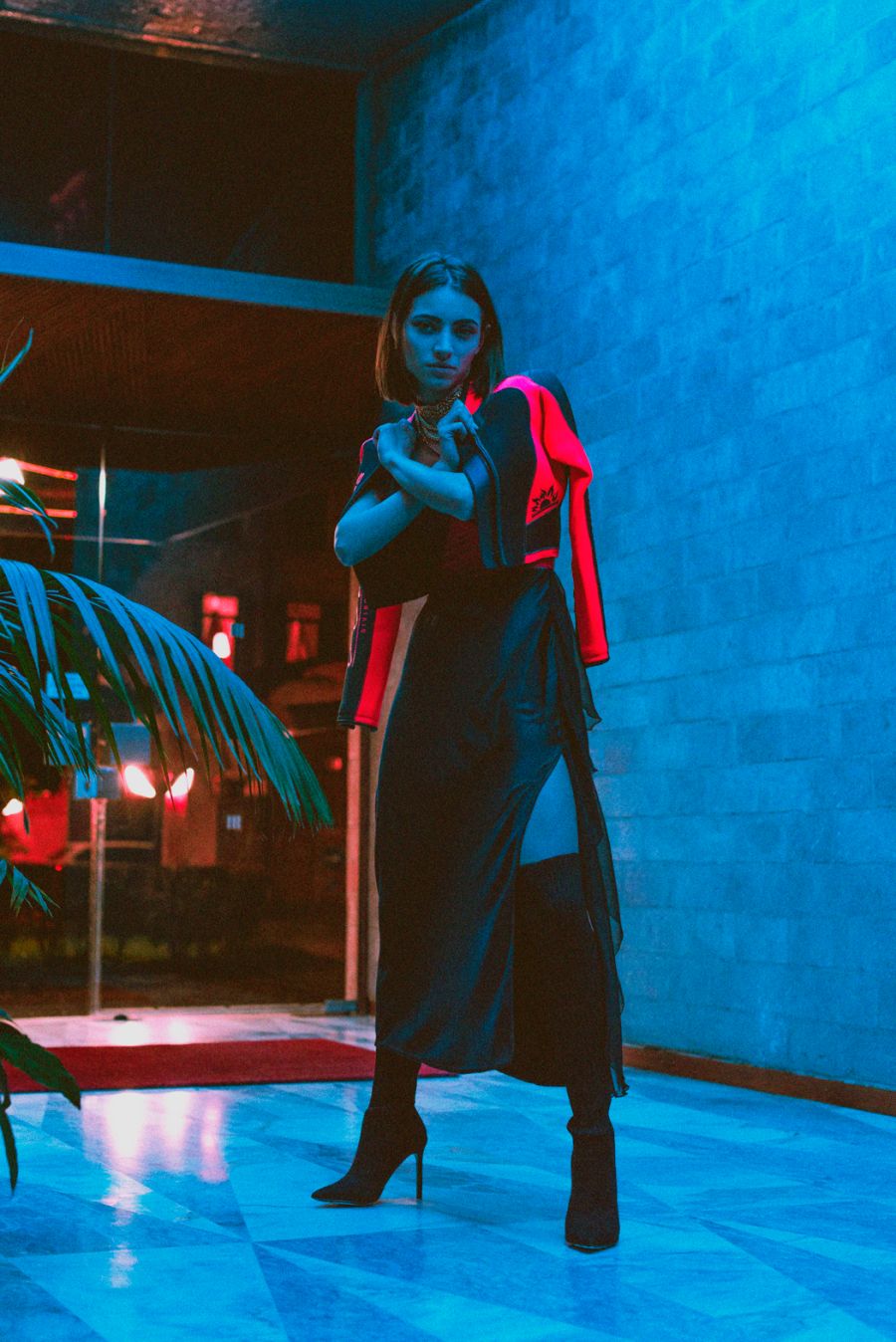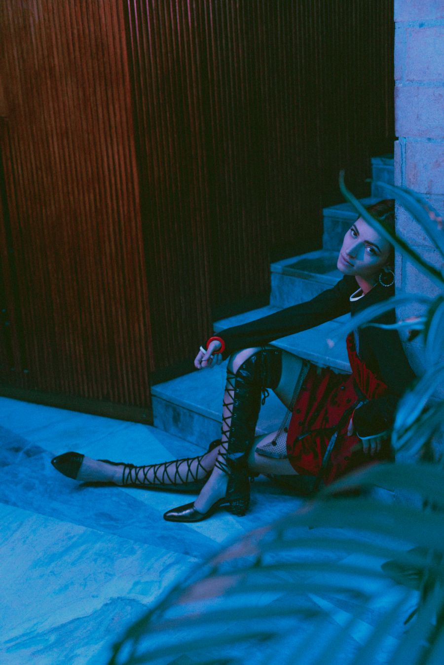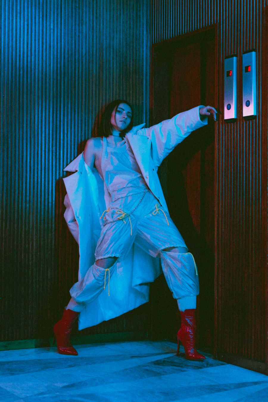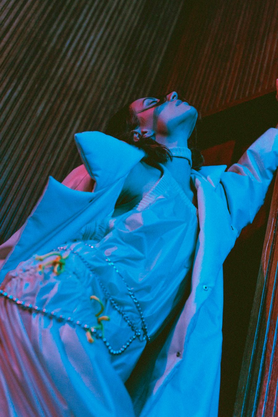 A KALTBLUT exclusive womenswear editorial. Photography by Chiara Rigato. Model is Anca Carp. Styling by Filippo Sandini. “I’m a 22 years old content creator and photographer practicing in fine arts and fashion fields. Diamond Veins is a womenswear fashion editorial born by the collaboration of three freelance creatives working in Padua to create a fascinating serie of photos made of seductive-disturbing lights meeting the red wood of the location, making everything looking like a thriller.” says the photographer.