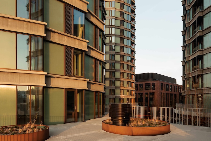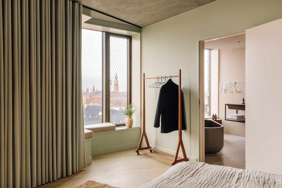 Designed by the acclaimed studio Grzywinski+Pons, the apartments at Locke Copenhagen reflect functional simplicity paired with artisanal warmth, evoking the serene elegance of contemporary Danish design. Oak wood floors, calming sage greens, soft nude-toned carpets, and mustard-yellow accents contrast beautifully with distinct architectural lines, exposed ceilings, bright, visible concrete, and copper-bronze window frames, creating tranquil retreats that feel like home.