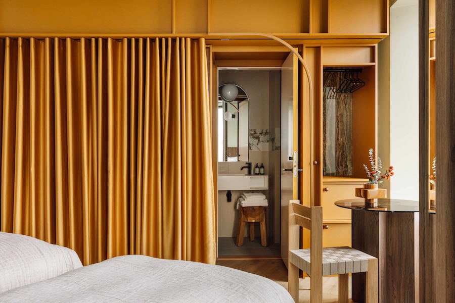 The restaurant and lounge reinterpret Scandinavian modernism, featuring rose-coloured limestone wall coverings, layered textiles, lush greenery, and generous, Poul Henningsen-inspired pendant lights, creating an inviting space to unwind. Meanwhile, the café elegantly pays homage to the understated sophistication of great Danish designers like Hans Wegner and Børge Mogensen, with its blend of clear forms and natural materials such as oak, stone, and cognac-hued leather, evoking the timeless charm of a modern neighbourhood bakery.
