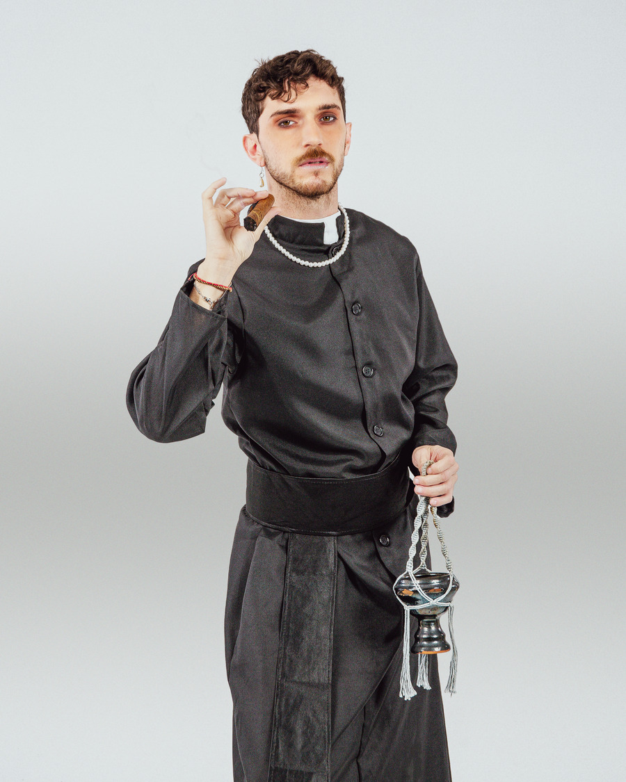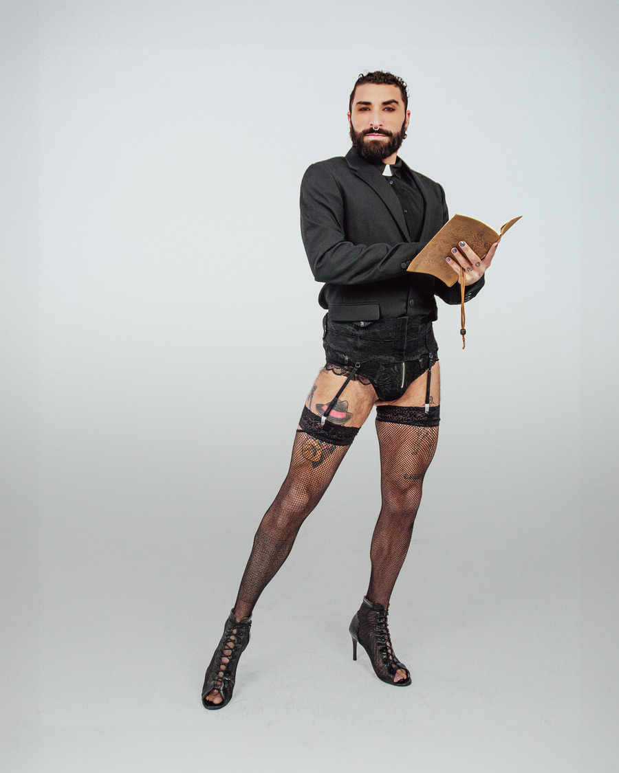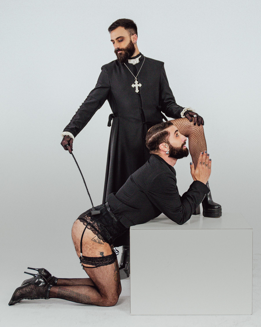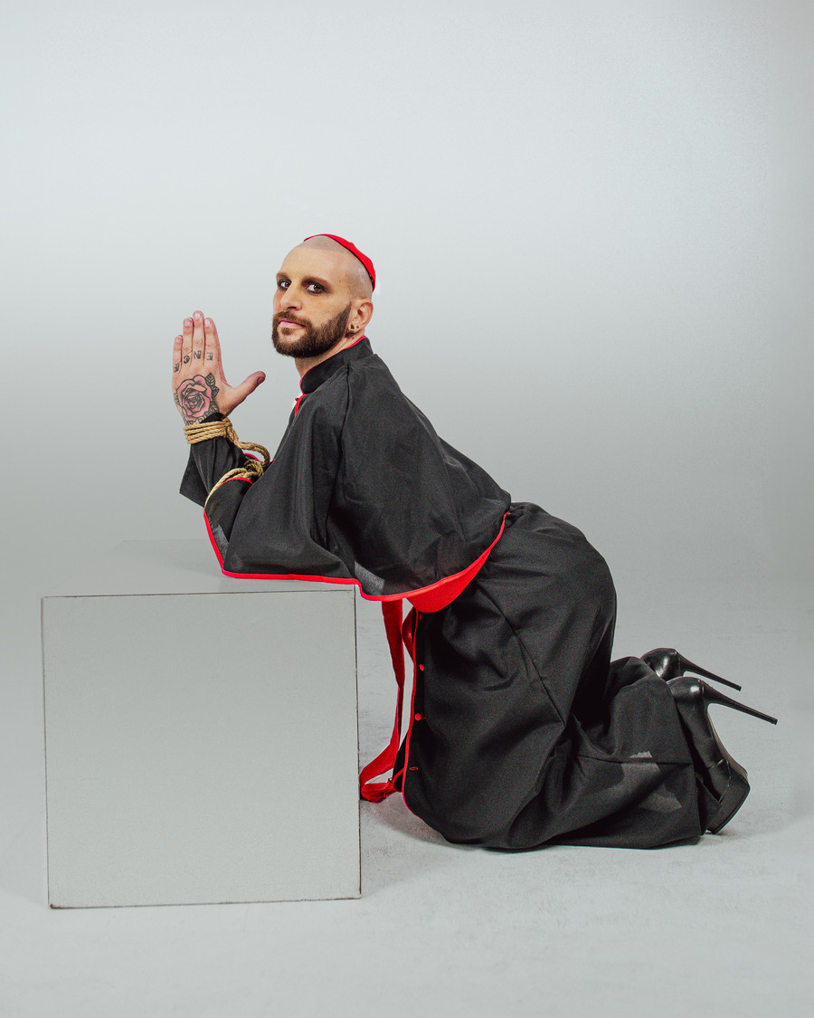 “Divine Defiance” brings us a collection of 12 defiant queer men, each assuming the role of a spiritual minister, not in the name of austerity but in a jubilant declaration of their intrinsic identities. Adorned in traditional clerical garbs reinvented with a twist of towering stilettos, provocative playthings, and vibrant tokens of queer culture – these figures act as a scintillating critique of societal duplicity. Echoing the mainstream adoration garnered by Rome’s notorious “Hot Priest Calendar”, this project braces itself for the inevitable contention and misconstrued vilification for its candid celebration of queer livelihoods.