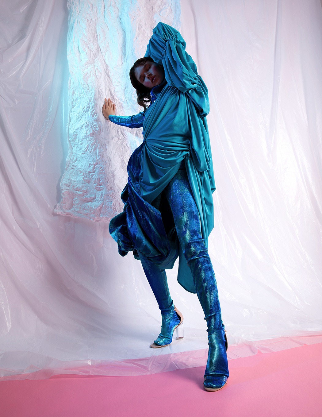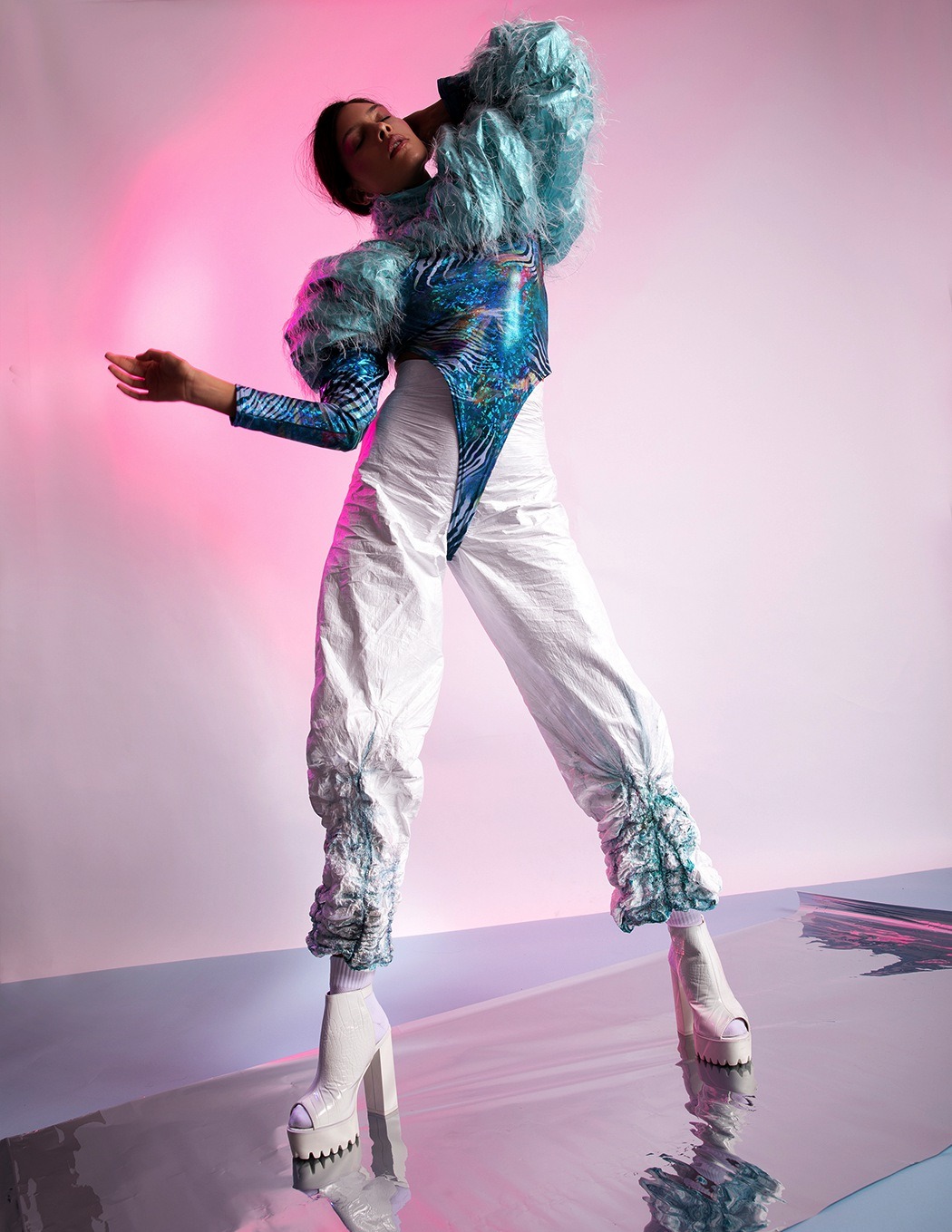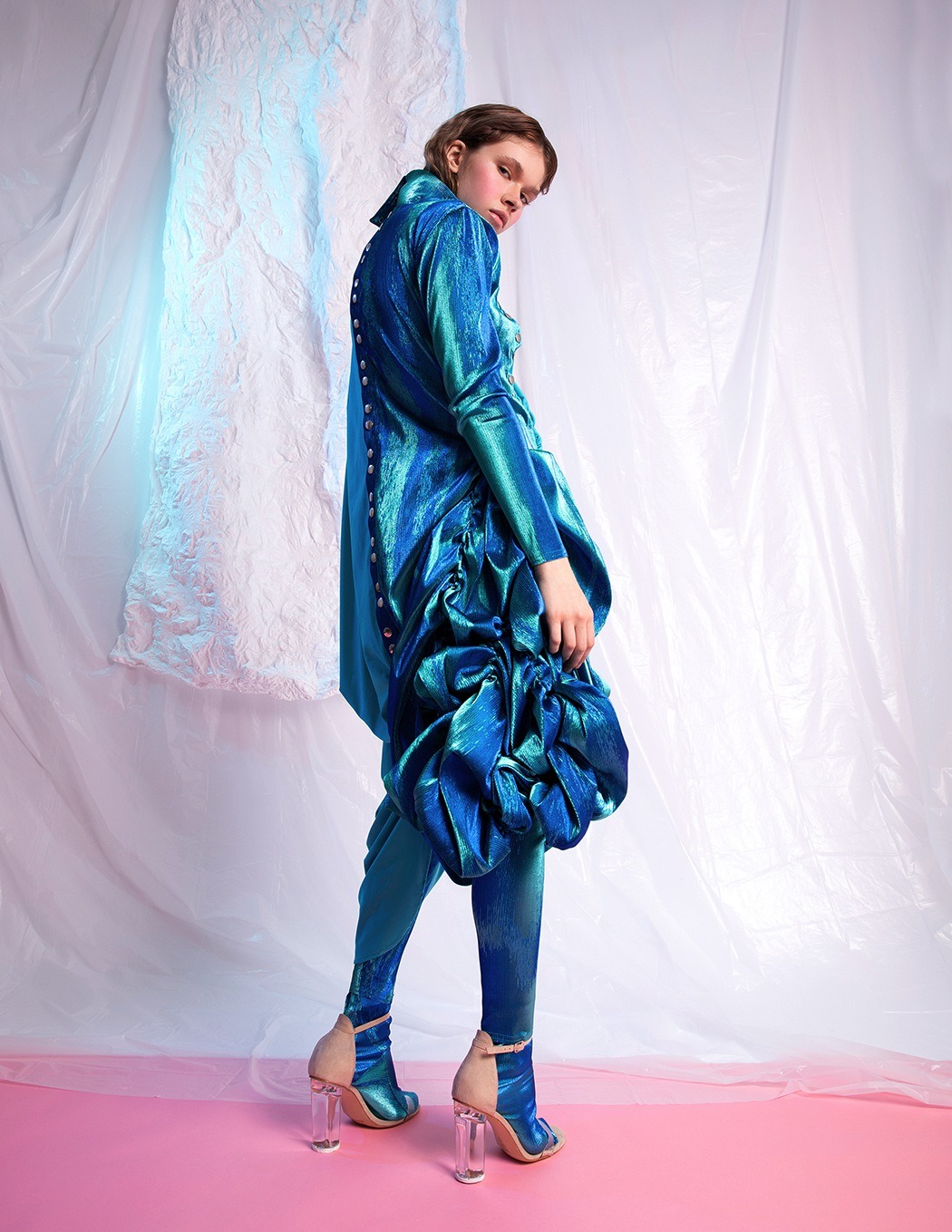 This collection is a representation of complete opposites and the beauty of finding the perfect middle. Asymmetry is exactly the middle. The garments are mainly playing with the perspectives of the viewer. Each perspective will look like a different piece. When each view is put together it paints a perfect picture of asymmetry. Each colour would not normally be combined with one another, and exactly what makes for a phenomenal overall image. Melting the fabrics together not only shows the climate change in terms of the desert heat that is rising but also in the ice caps that are melting. This Collection is the perfect gathering of negatives and positives that great the middle that we are all looking for.