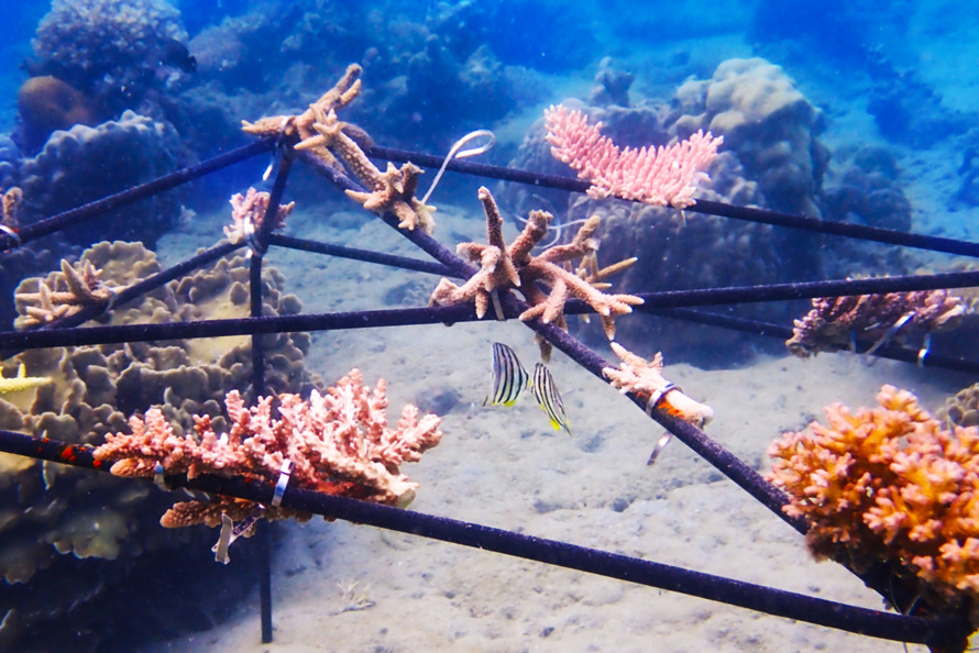 Keeping the nursery in good condition also means eliminating parts of marine fauna that could delay its growth: organisms like sponges or algae start to grow in competition with the coral itself. Constant maintenance and cleaning every part of the nursery helps it to survive.