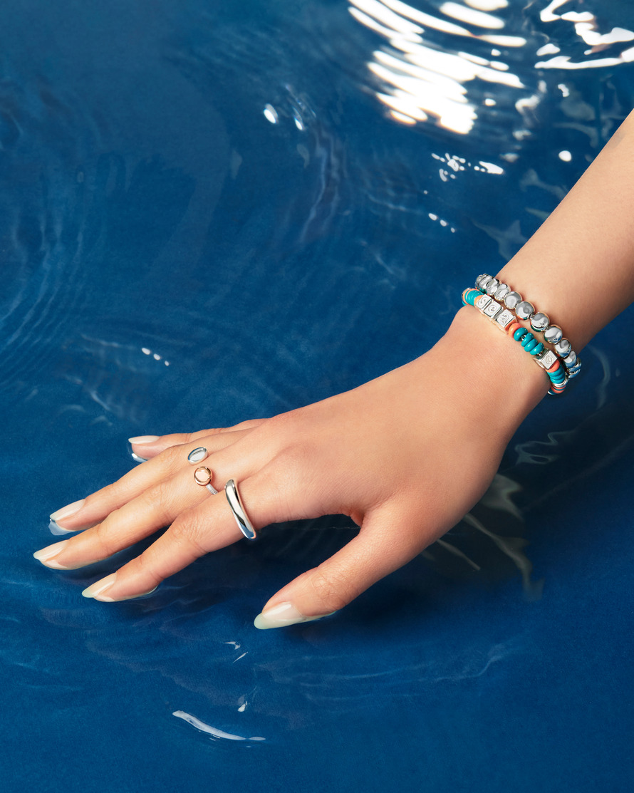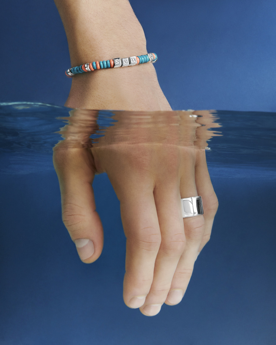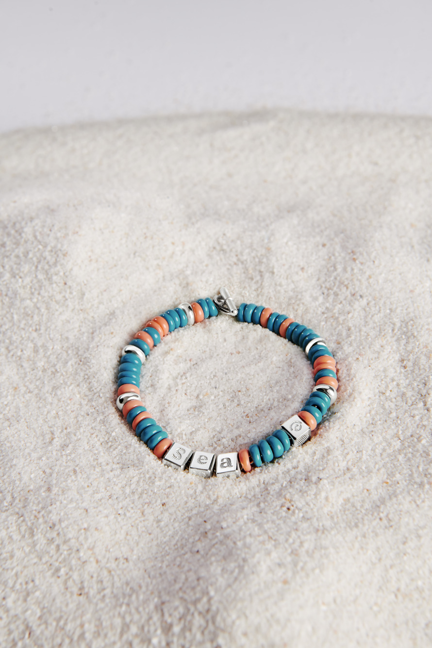 To celebrate this partnership, DoDo has launched a ringlets bracelet in the colours sea green and coral: with plastic elements made from 100% recyclable PET bottles, embellished with new silver ringlets. Four cubic elements in sterling silver bear symbols dedicated to this new collaboration: the DoDo and Tēnaka logos, a heart, a fun smile and the letters SEA to immediately remind us just how important aquatic biodiversity on our Earth is.