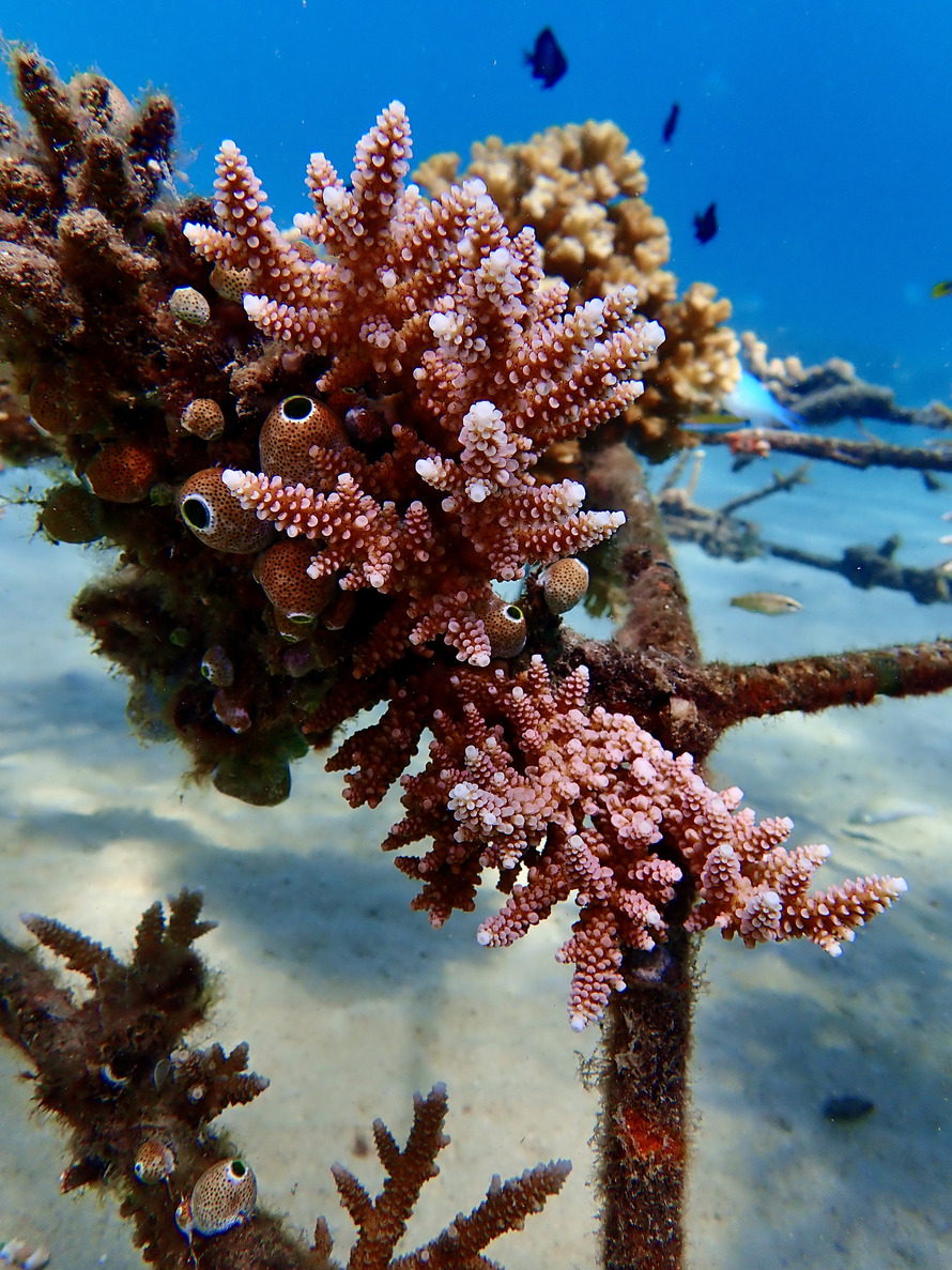 Keeping the nursery in good condition also means eliminating parts of marine fauna that could delay its growth: organisms like sponges or algae start to grow in competition with the coral itself. Constant maintenance and cleaning every part of the nursery helps it to survive.