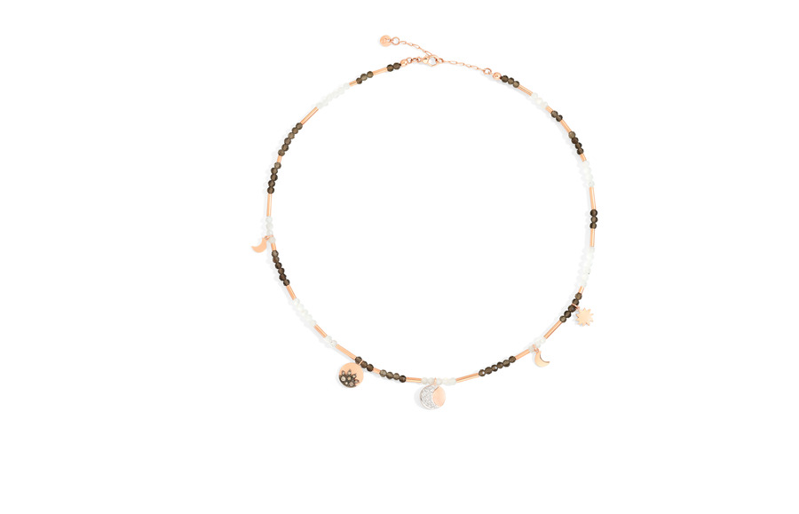 The same goes for the necklaces that mix instead moonstone and smoky quartz beads. The version that combines beads and chain brings moon and lilliputian sun. The model with a scoop neck, is the most precious because it combines all the elements, and reproduces the most radiant of the sky on the neckline. In different lengths and adjustable, these necklaces can be worn individually or in pairs.