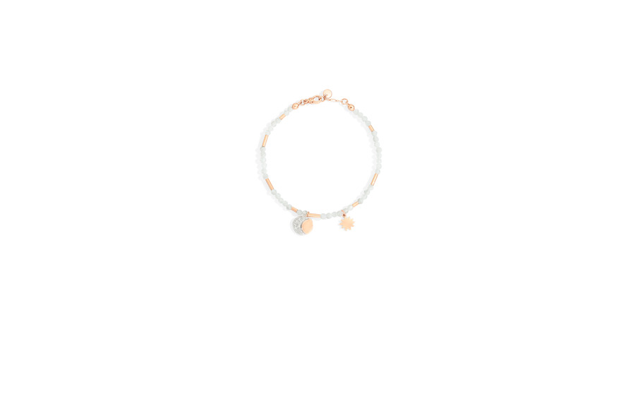 Adjustable and nylon-cored, the bracelets string together moonstone or smoky quartz beads separated by small tubular sections of rose gold. The moon pendant made of white diamonds is always combined with the Lilliput sun, while the sun pendant made of brown diamonds is always accompanied by the Lilliput moon. The mix of elements, the use of semi-precious stones and the choice of associated symbols highlight the play of contrasts on these bracelets, which enter the DoDo “cosmos” with a special charm of great novelty.
