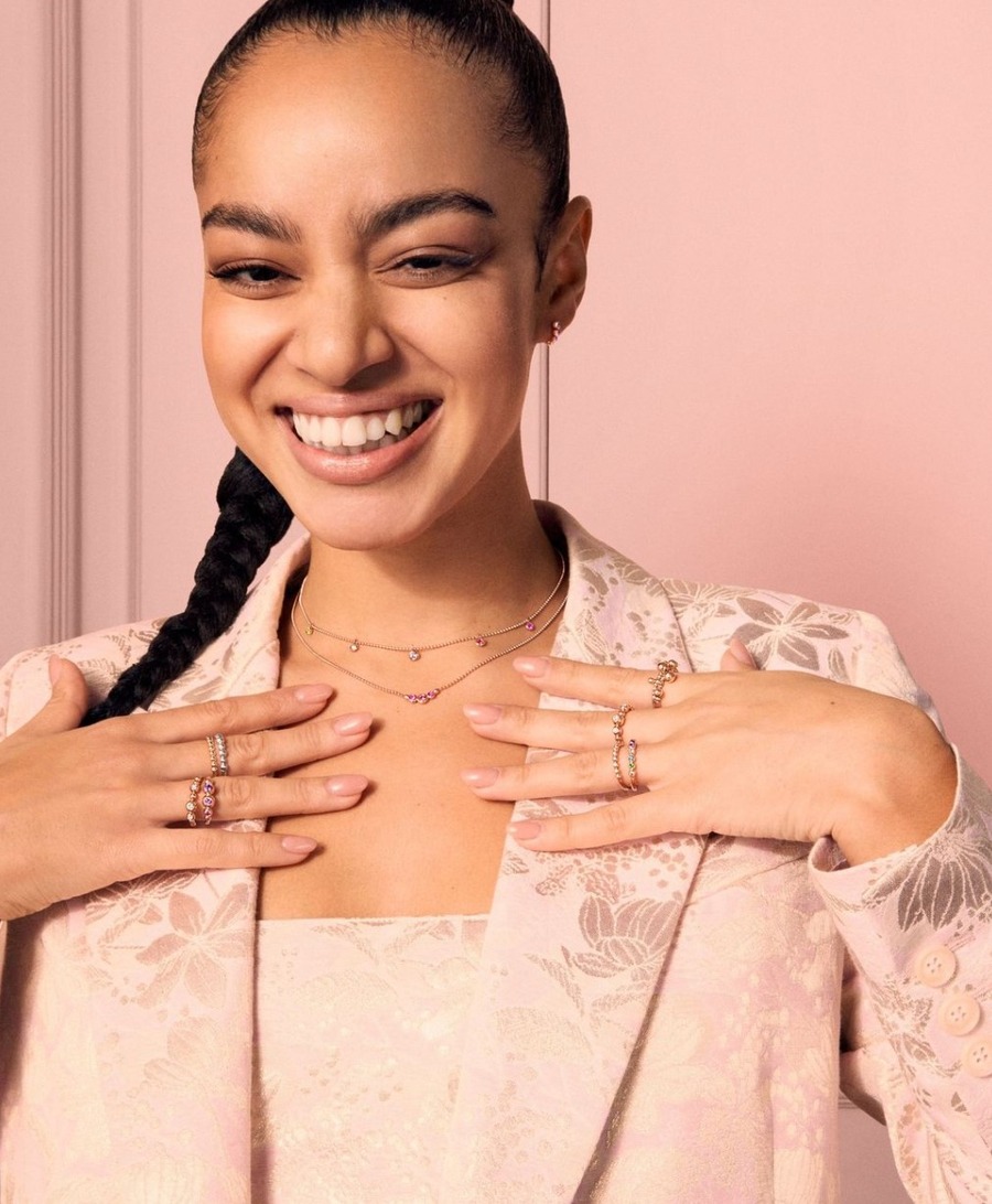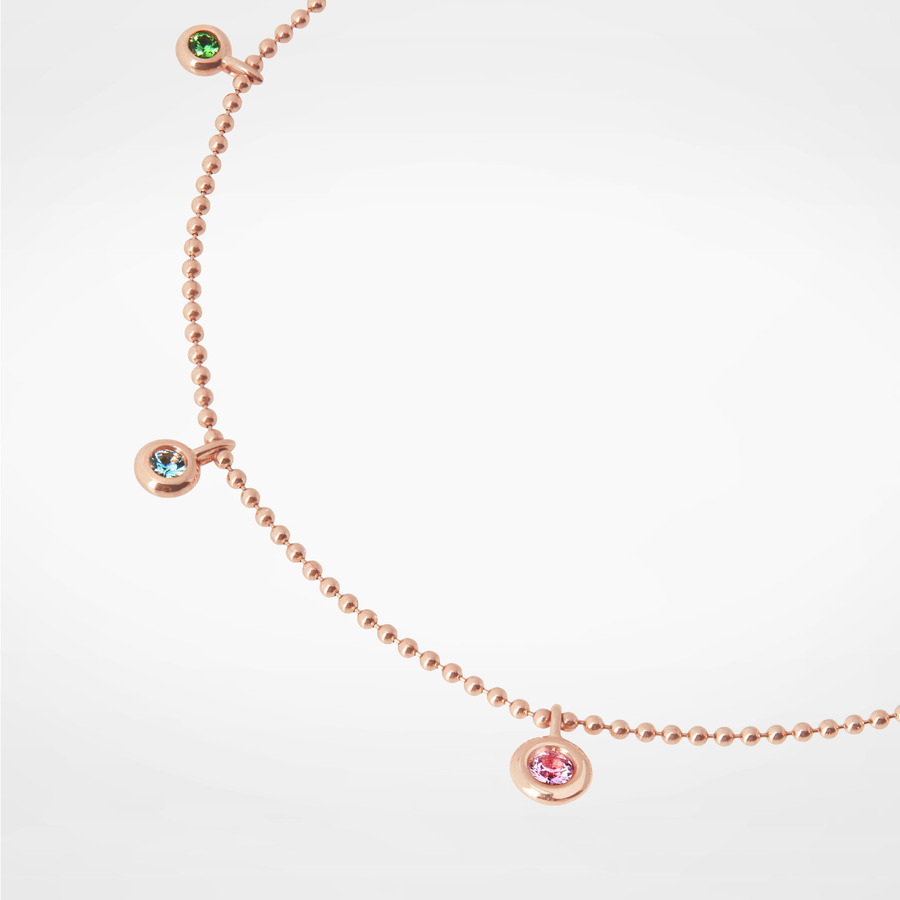 These jewellery pieces in rose gold are perfect for mixing and matching in a glossy ensemble and prove irresistible when paired with the most iconic Bollicine collections. Delicate earrings with a graceful contour, adorned with tiny bubbles, can be purchased individually and combined to create your original rainbow. Meanwhile, gemstone-studded firmaments breathe new life into even the liveliest and most delicate rings. The thin necklaces, with their adjustable sliding clasps, provide a weightless feel and cater to any style.