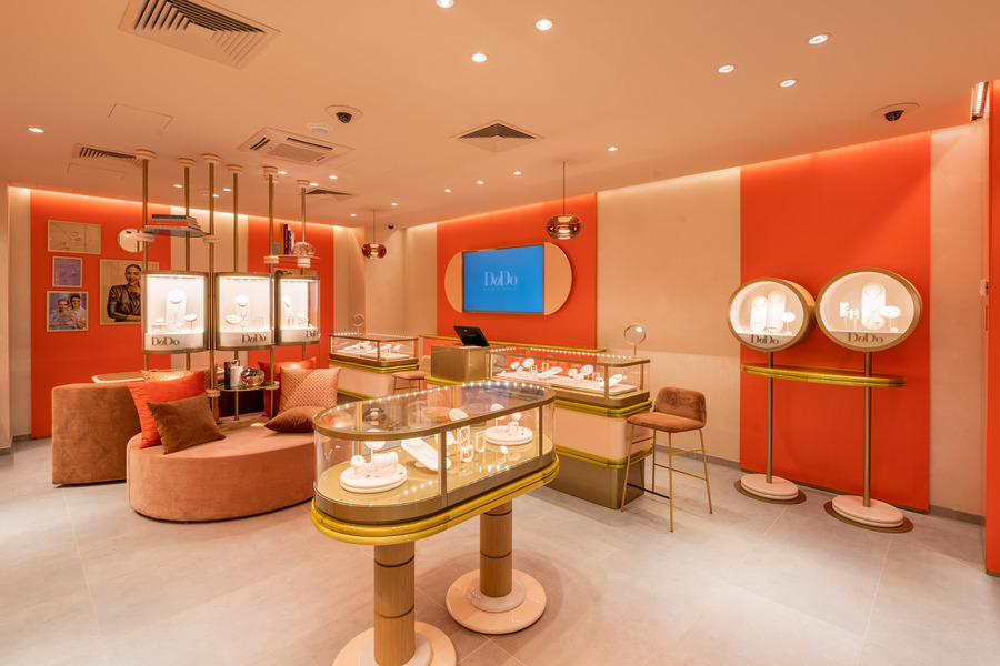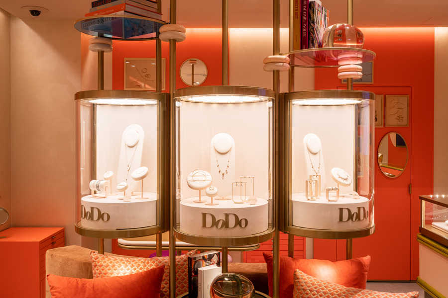 The new boutique conveys the intimate atmosphere of an apartment with romantic and cool charm. Everything is done in shades of pink, mandarin and light gold that meet a touch of Bolivar green. The new concept focuses on circular and bevelled shapes and also expresses DoDo’s inclusive spirit, welcoming all those who want to explore collections such as Pepita, Rondelle, Bollicine, Nodo, Stellina and Granelli and express their personality through jewellery. Sparkling display cases and designer seats in soft velvet create a welcoming environment where iconic photo galleries tell the story of DoDo in all its facets: the environmental mission, the ambassadors, the distinctive design, and the community.