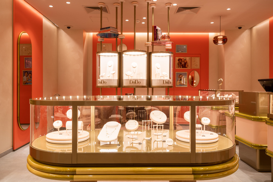The new boutique conveys the intimate atmosphere of an apartment with romantic and cool charm. Everything is done in shades of pink, mandarin and light gold that meet a touch of Bolivar green. The new concept focuses on circular and bevelled shapes and also expresses DoDo’s inclusive spirit, welcoming all those who want to explore collections such as Pepita, Rondelle, Bollicine, Nodo, Stellina and Granelli and express their personality through jewellery. Sparkling display cases and designer seats in soft velvet create a welcoming environment where iconic photo galleries tell the story of DoDo in all its facets: the environmental mission, the ambassadors, the distinctive design, and the community.