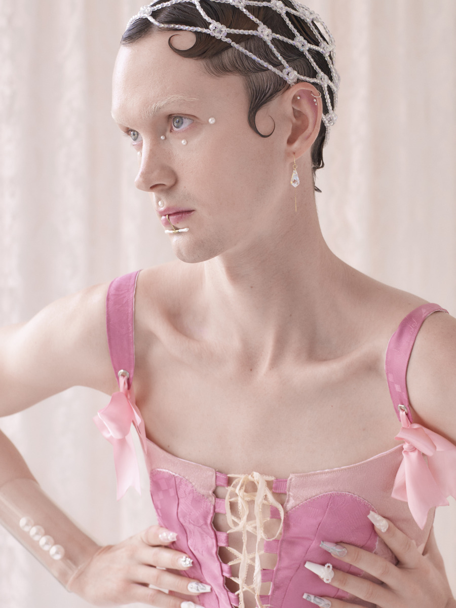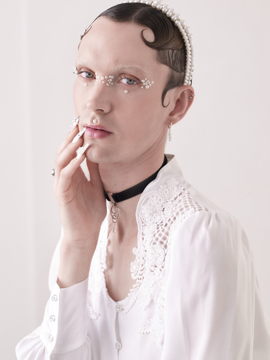 Photographer Flo Nitsch captured model Oskar for a KALTBLUT exclusive editorial. Creative Direction & Styling by Ines J. Hair & Make-Up by Leo Stern. Nails by Euphoria Nailz. Fashion Brands used are Lash Me Tender, Perlensau, Made By Jacq, Ms. Fresh Studio, and Tart Twins.