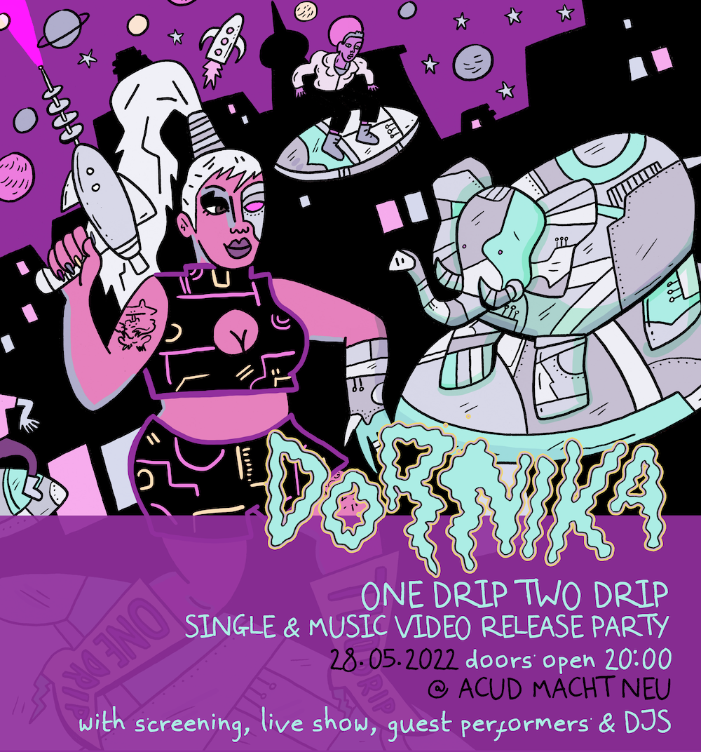 KlubKid‘s newest addition Dornika makes their video debut for new single ‘One Drip Two Drip’ iIllustrated by Rory Midhani and animated by Ainissa V. “One Drip Two Drip is a quirky love letter to Berlin club culture,” explains Dornika. “I wrote this song during the Tanzverbot (dance ban) as the city was in lockdown in 2021. I thought to myself, wouldn’t it be dope to have a club simulation with all the weird and funny things that happen in a night out? I wanted it to be glamorous but also real, like walking past the queue when you’re on the guestlist looking snatched but also running into your exes and having a bit of drama, cause like, all the best parties have a bit of scandal!”