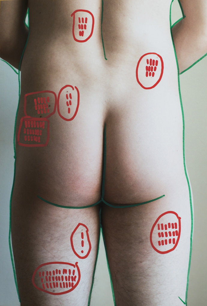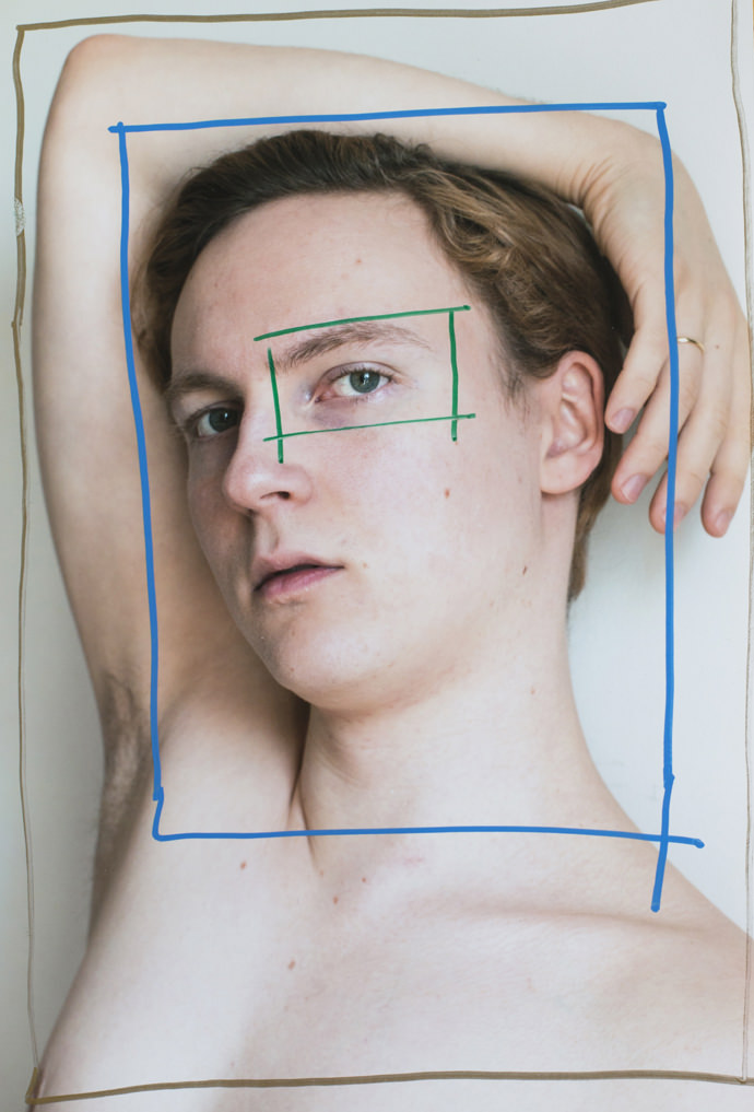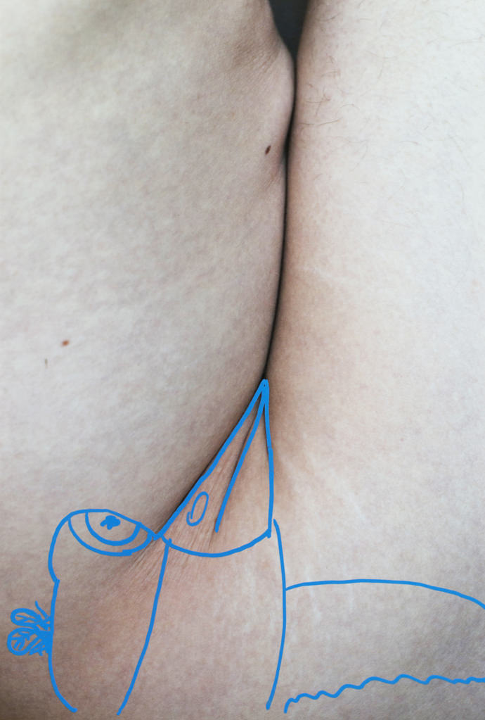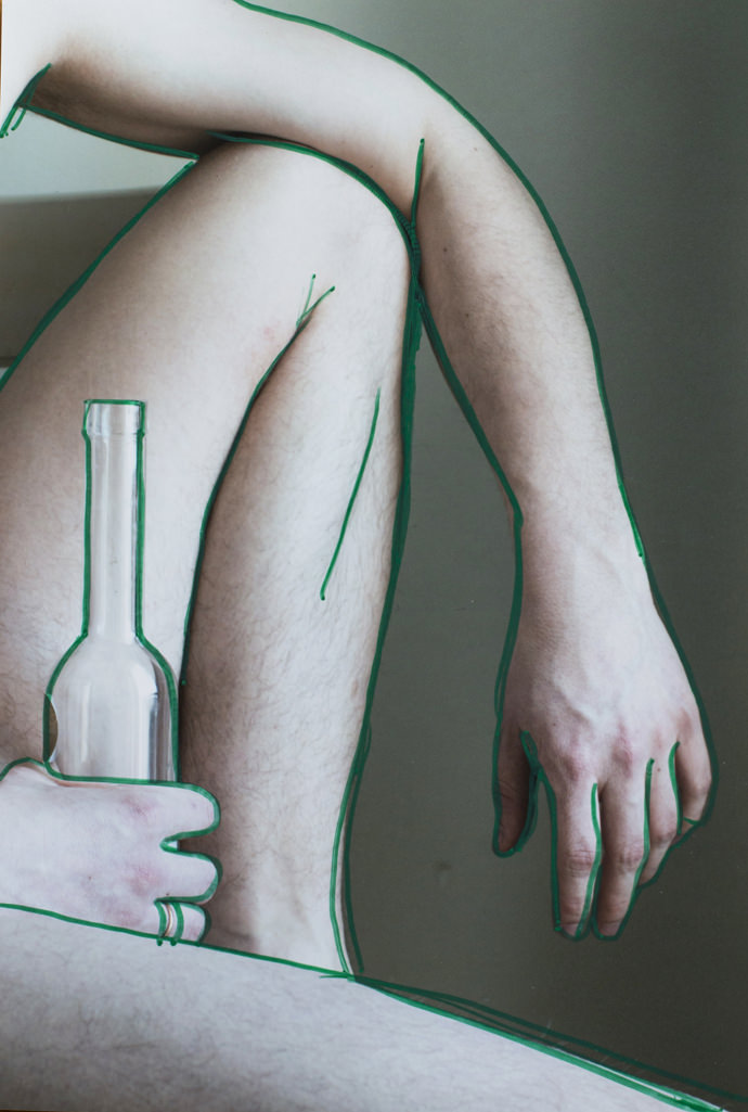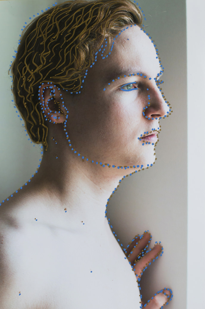 “Although the model looks alive and has a human form in the images, with the involvement of illustrations, he transforms into two dimensional paper elements seem to be drawn by kids and that allows the artist to change the image based on her desire. This contrast indicates the idea, that the reality in paintings or photography do not always translate the perfection. “